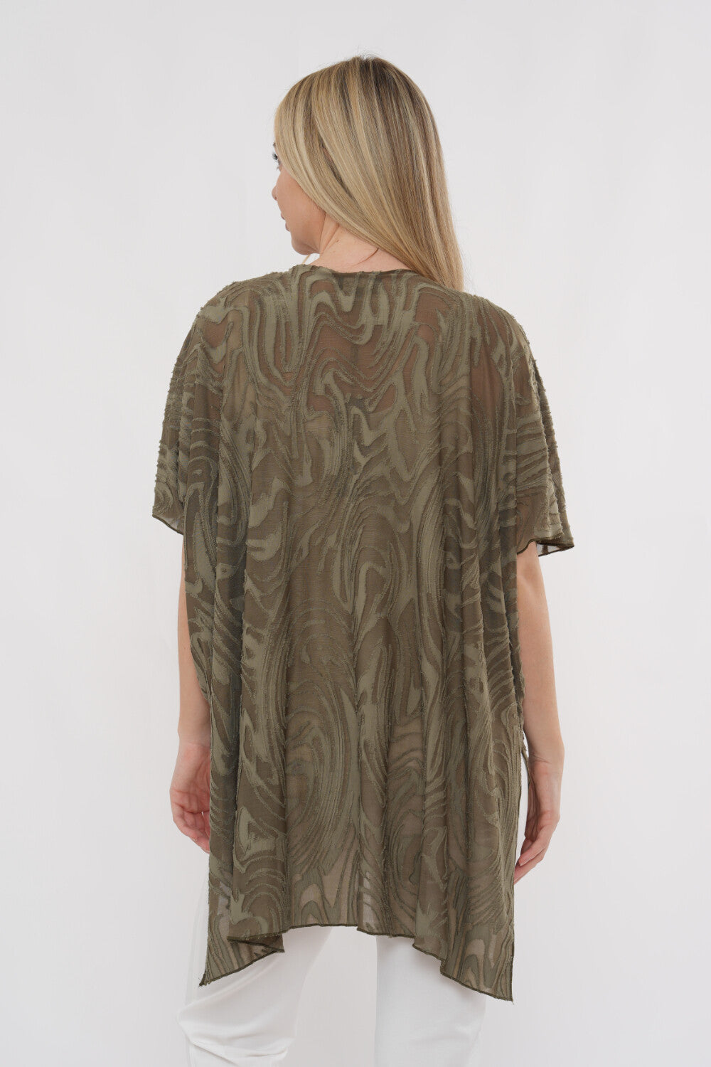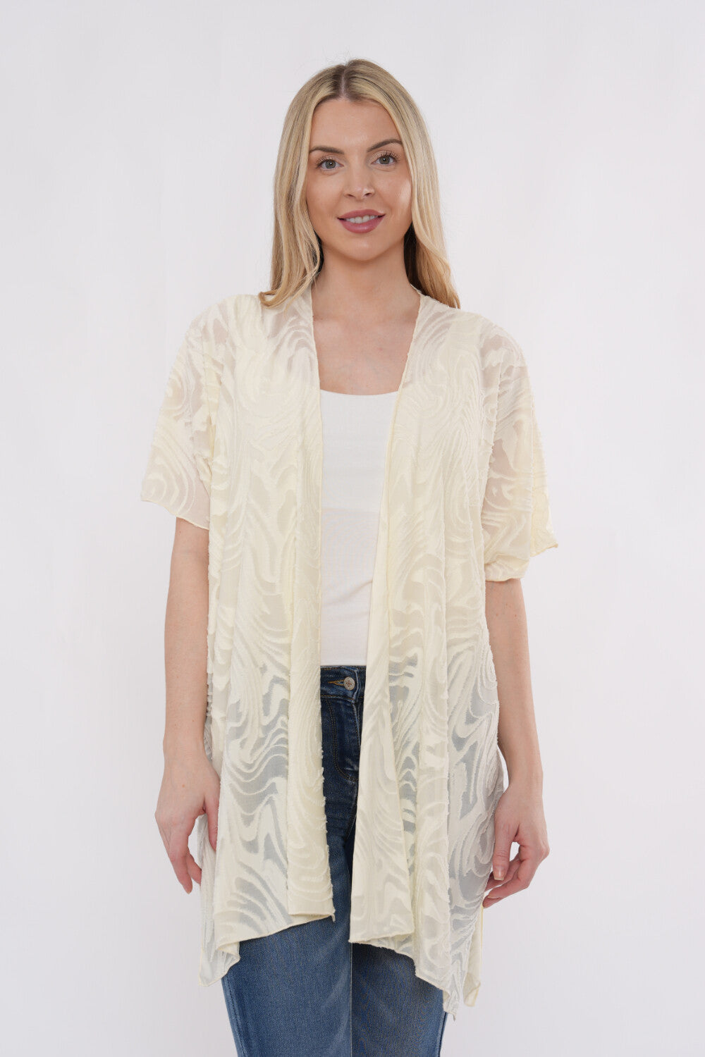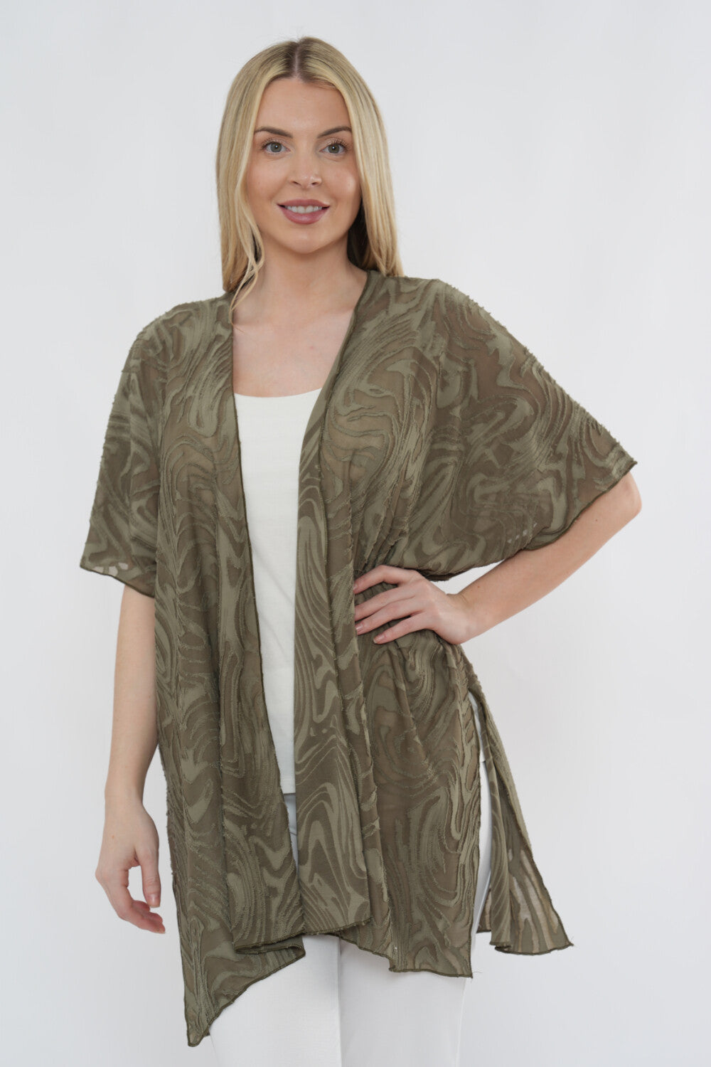 Add effortless elegance to your everyday look with this lightweight textured open-front jacket. Designed in a soft cream and olive green hue, this versatile layering piece features a subtle all-over swirl texture that adds depth and sophistication without overpowering your outfit.