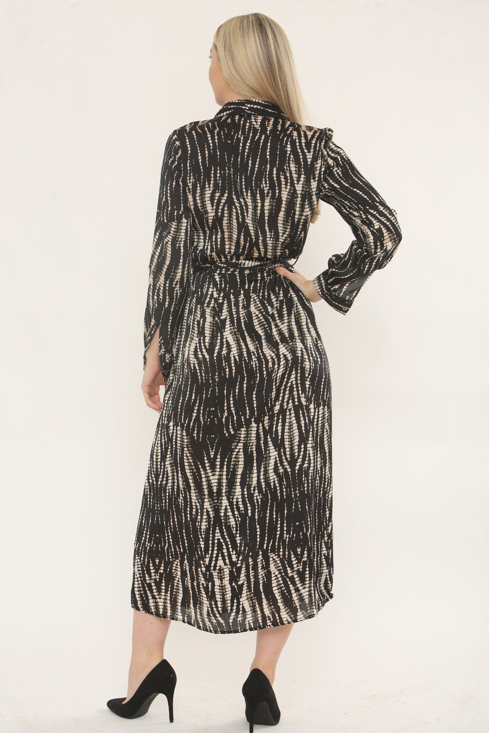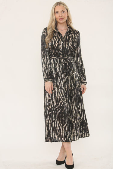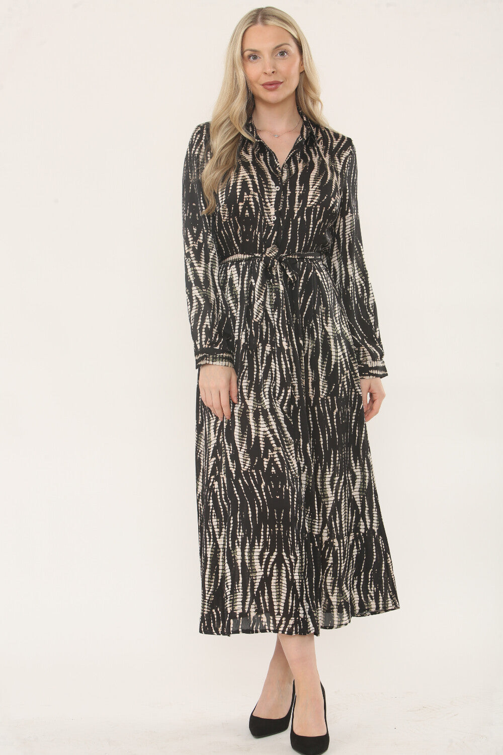 Turn heads in this effortlessly chic black and stone printed midi shirt dress. Designed with a striking abstract pattern, this dress offers a perfect balance of elegance and modern style. Featuring a classic collared neckline, long sleeves, side pockets and a button-down front, it adds a polished touch suitable for both day and evening wear. The adjustable tie belt cinches at the waist, creating a flattering silhouette, while the flowy midi-length skirt ensures comfort and sophistication.