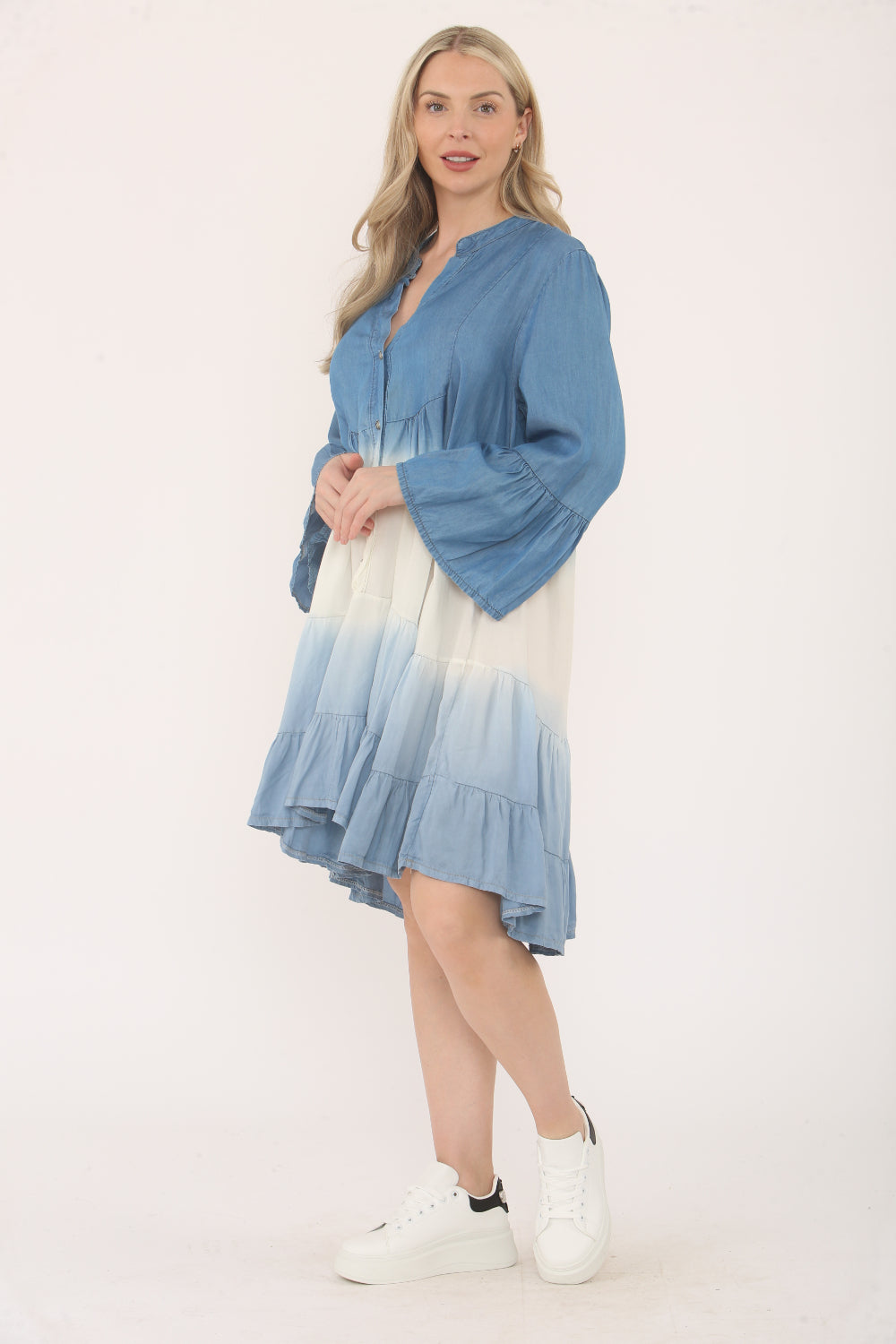 Effortlessly stylish and breezy, this ombré button-front dress is your go-to for casual chic. Featuring a flattering A-line silhouette, it starts with a soft denim blue at the top that gracefully fades into a creamy white and light blue tiered skirt. The relaxed fit, flowy bell sleeves, and subtle ruffle hem add a playful charm, while the lightweight fabric ensures all-day comfort. Perfect for brunch dates, beach strolls, or summer getaways—just pair it with sneakers or sandals and you're set!