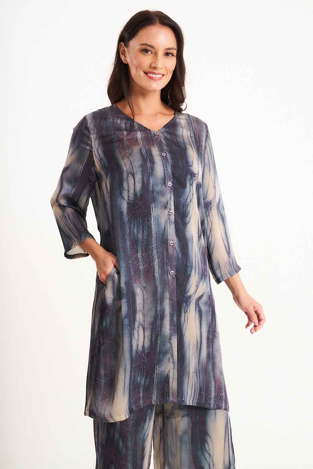 An elegant silk-look shirt dress with a longline fit-and-flare cut  and bracelet-length sleeves. Button-through with a soft V-neck.  A stunning blend of deep blues and soft browns.