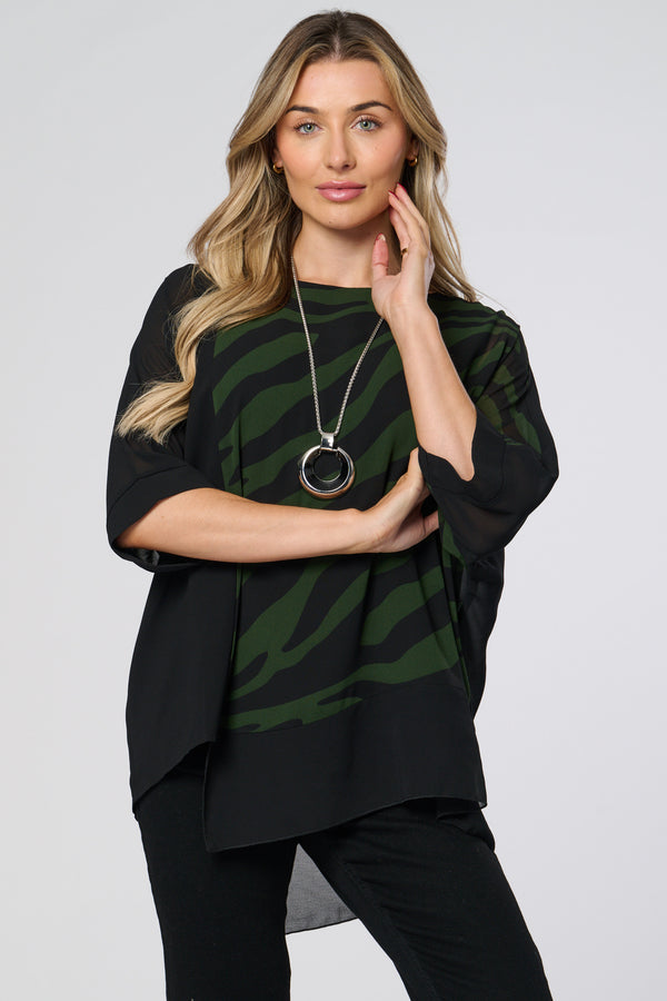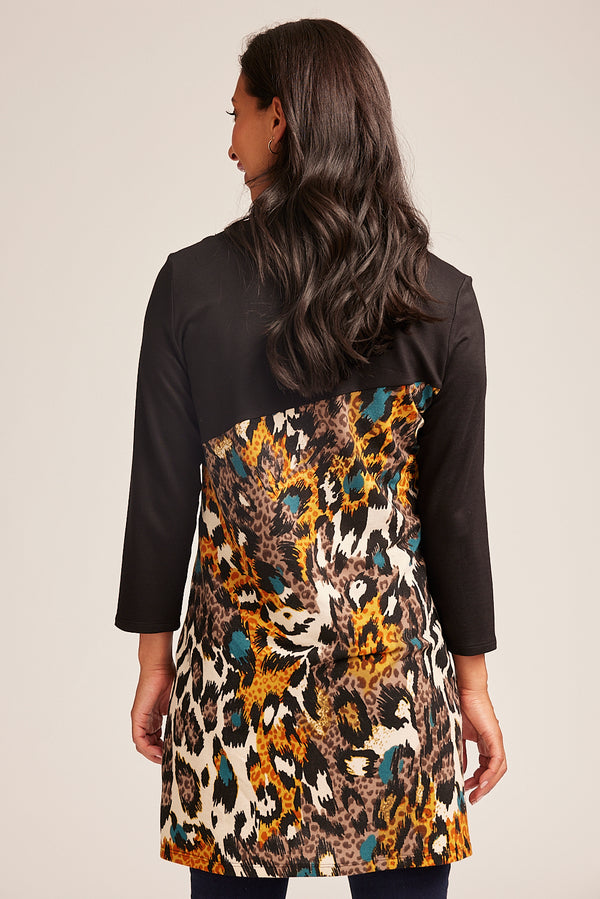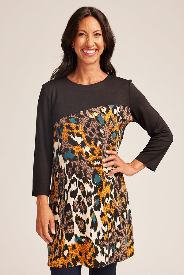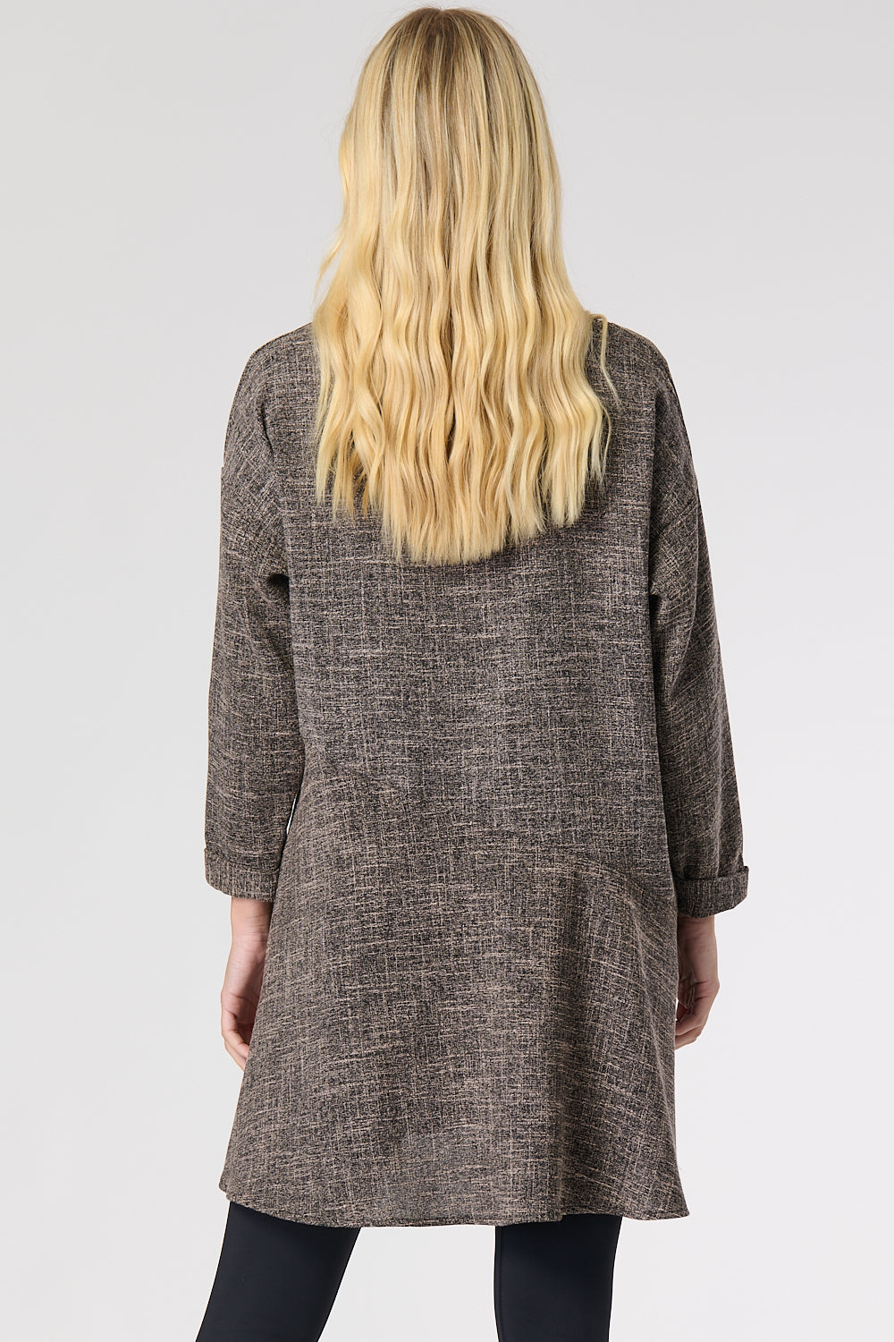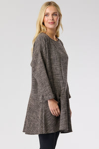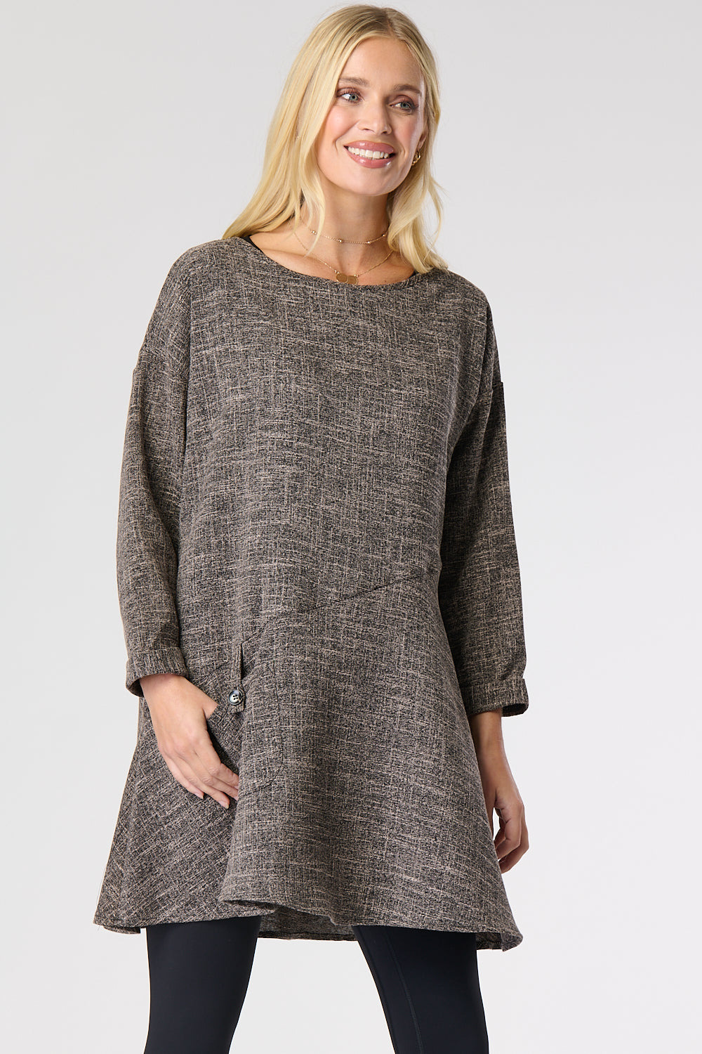 Our panelled A-line tunic is the perfect addition to any wardrobe. Featuring long sleeves, a boat neckline, and turned cuffs, this style is both comfortable and fashionable. Additionally, the textured fabric and front pocket with button detail add an extra touch of elegance.