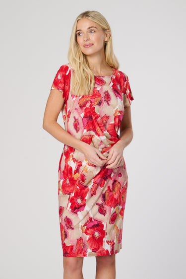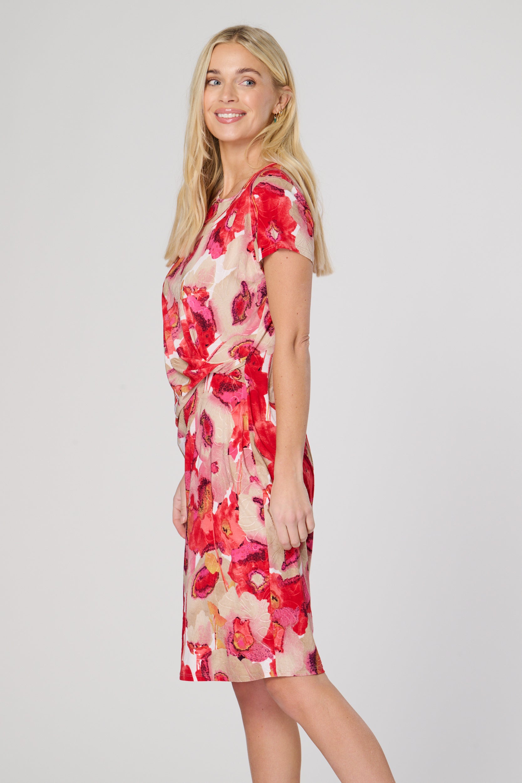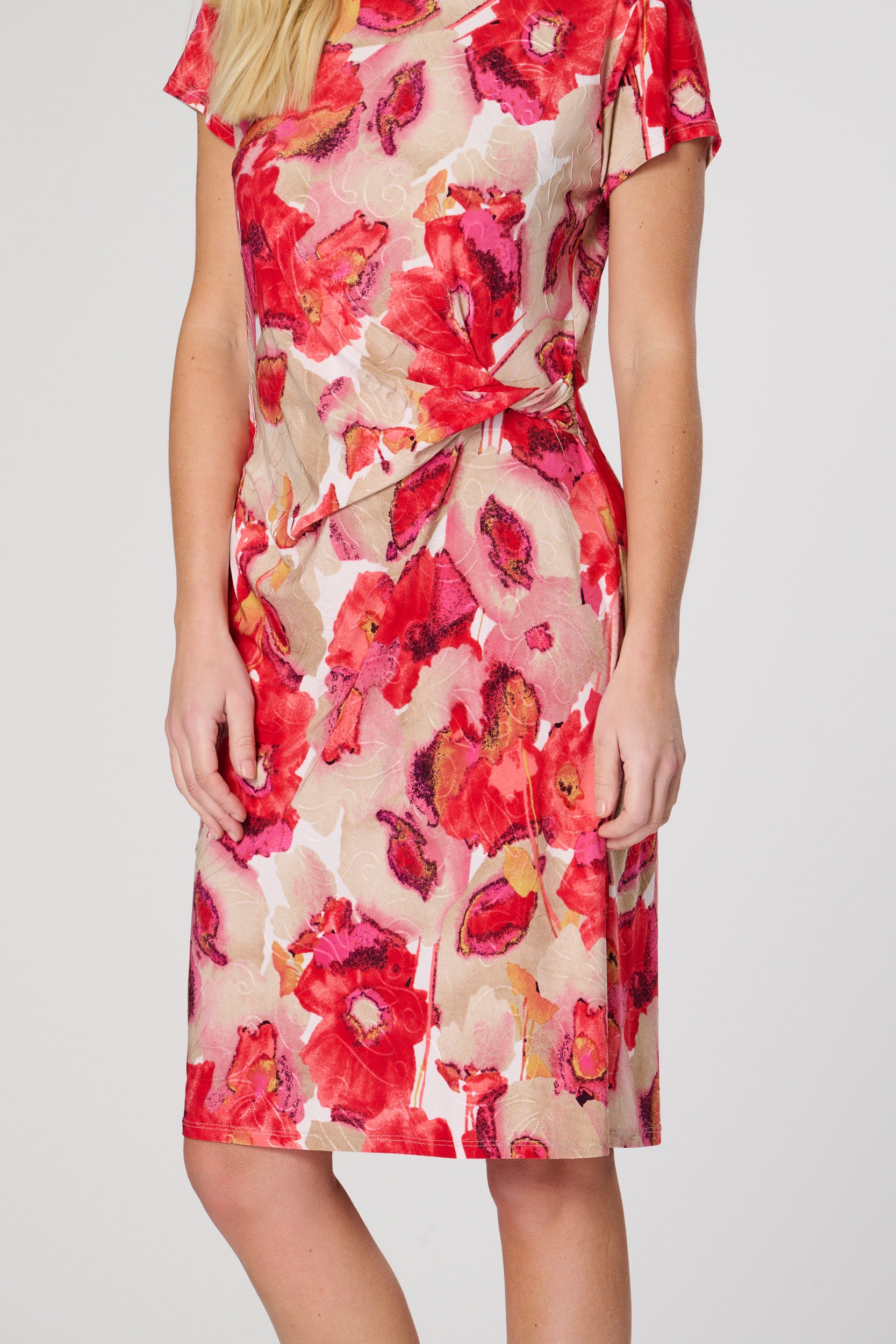 This knee length dress features short sleeves, a round neck, and a stunning flower print fabric. The side twist drape detail adds a unique touch to this versatile piece. Perfect for any occasion, this dress is sure to make a statement and keep you comfortable.
