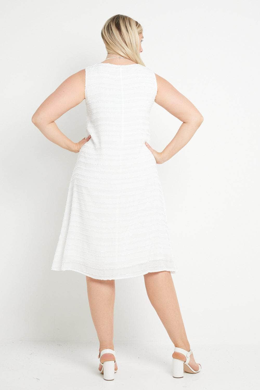 Simply stunning, this chic sleeveless midi-dress features silk-look textured ruffled stripes, a flared A-line hem and full white lining. Luxuriously soft and smooth to the touch.