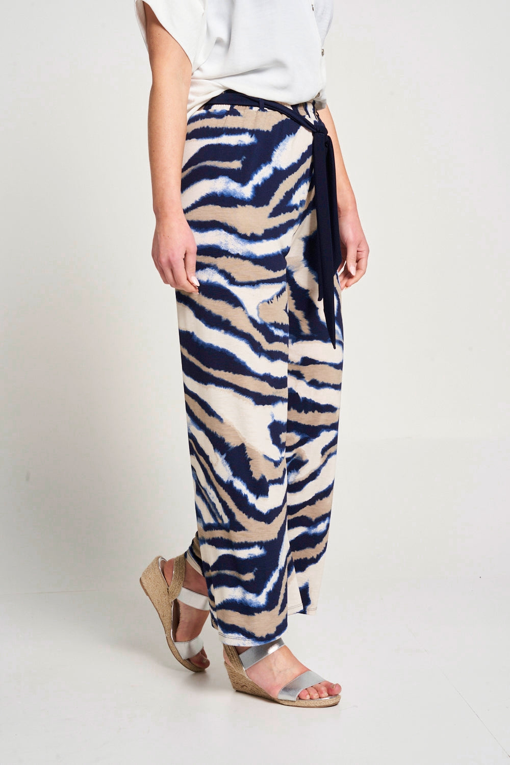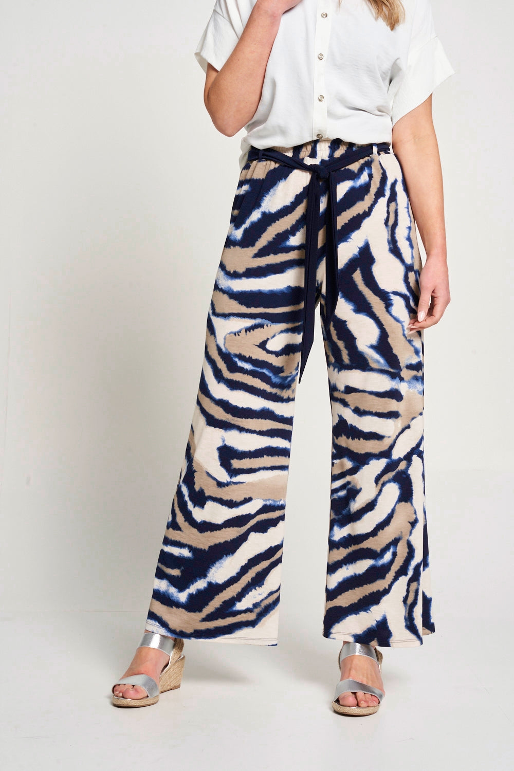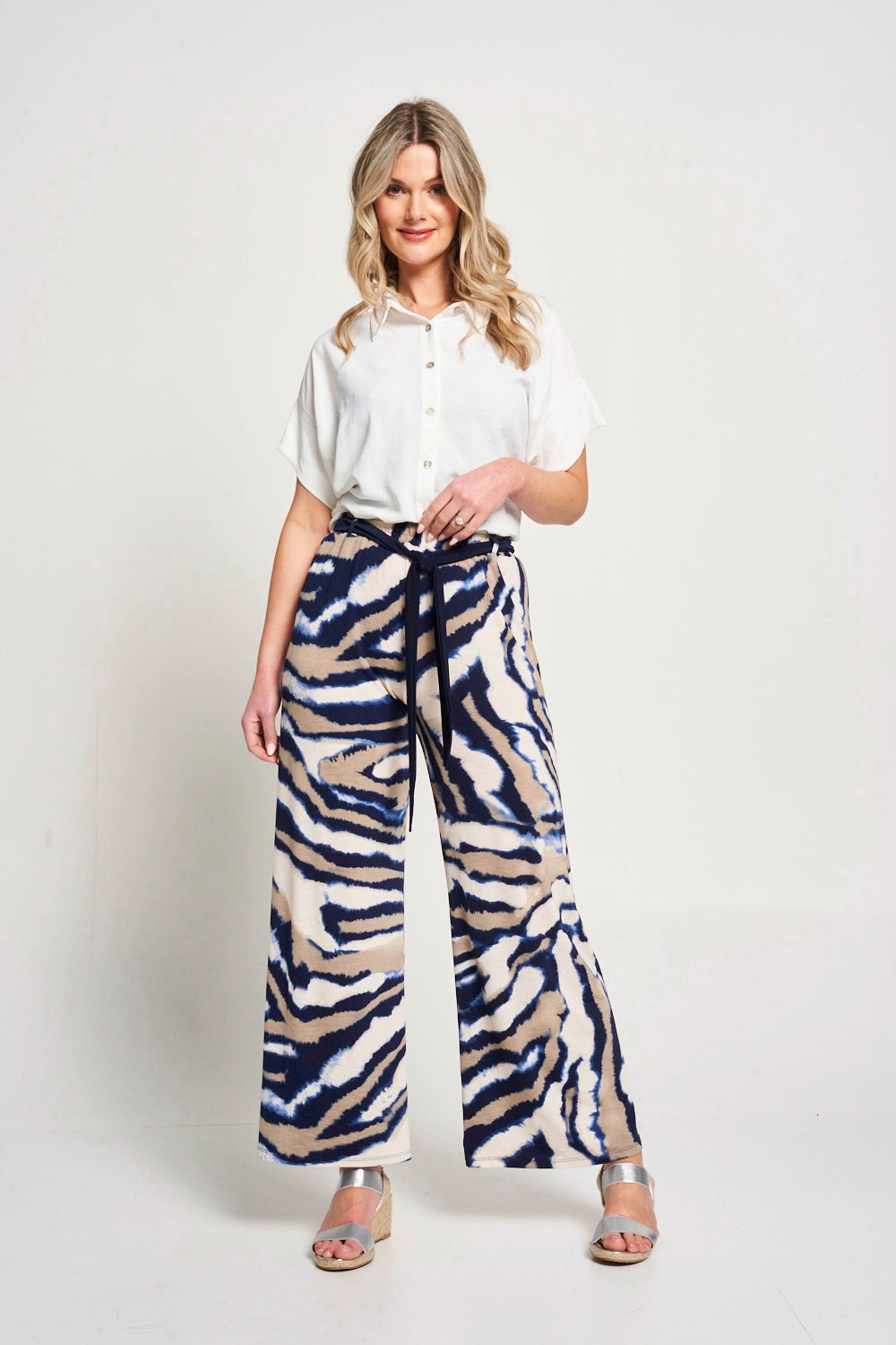 Effortlessly elevate your style with these animal print trousers. Crafted from a stretch fabric, these trousers feature an elasticated waist for a comfortable fit and a navy fabric belt for a touch of sophistication. The wide leg design adds a trendy touch, making these the perfect statement piece for any occasion.