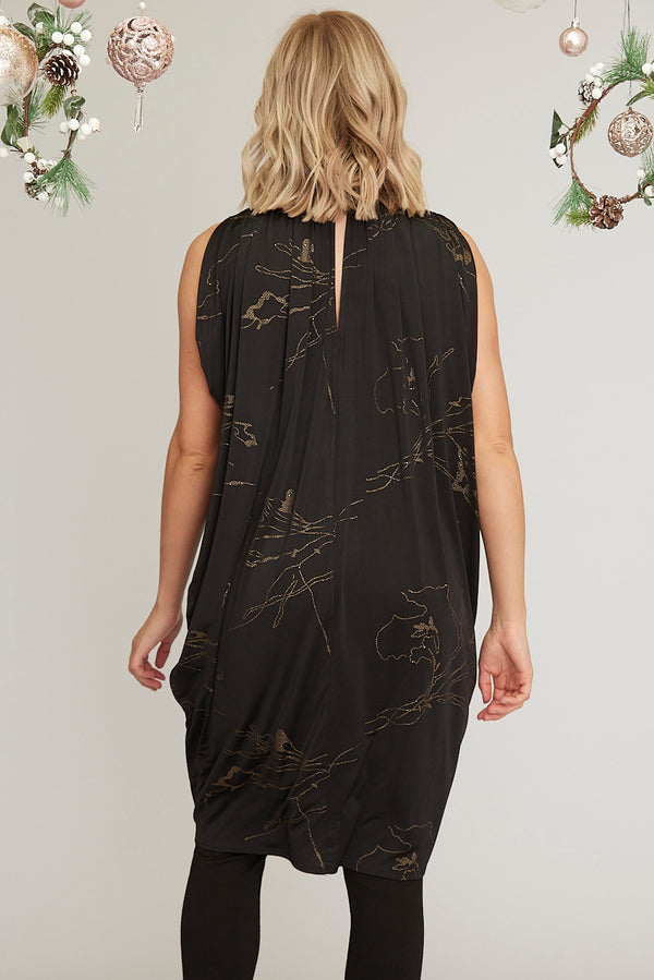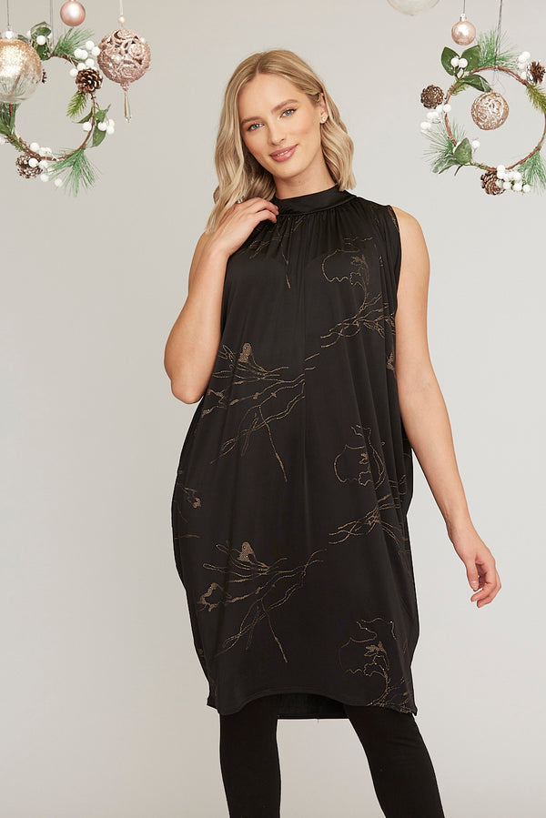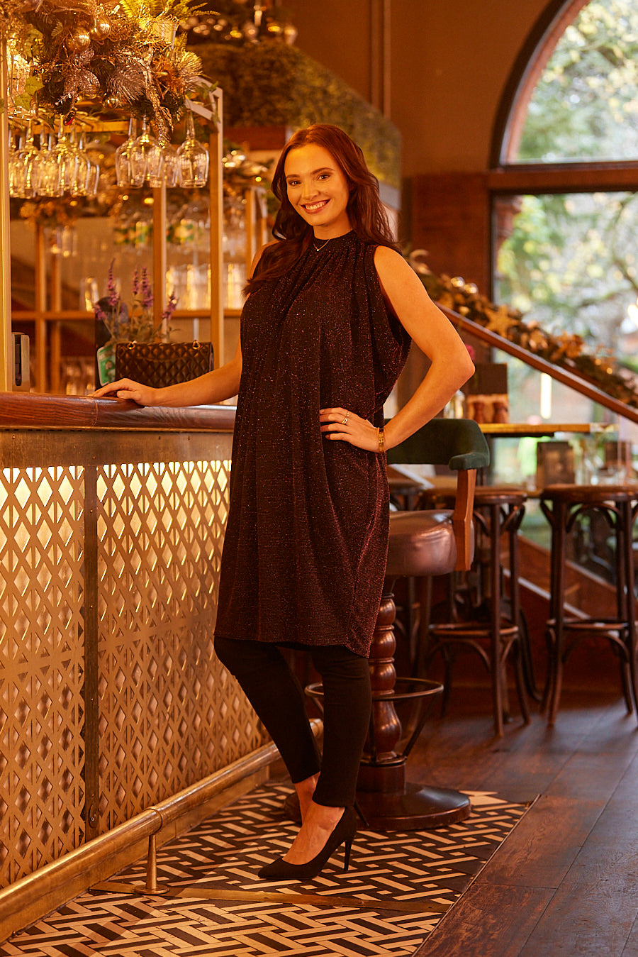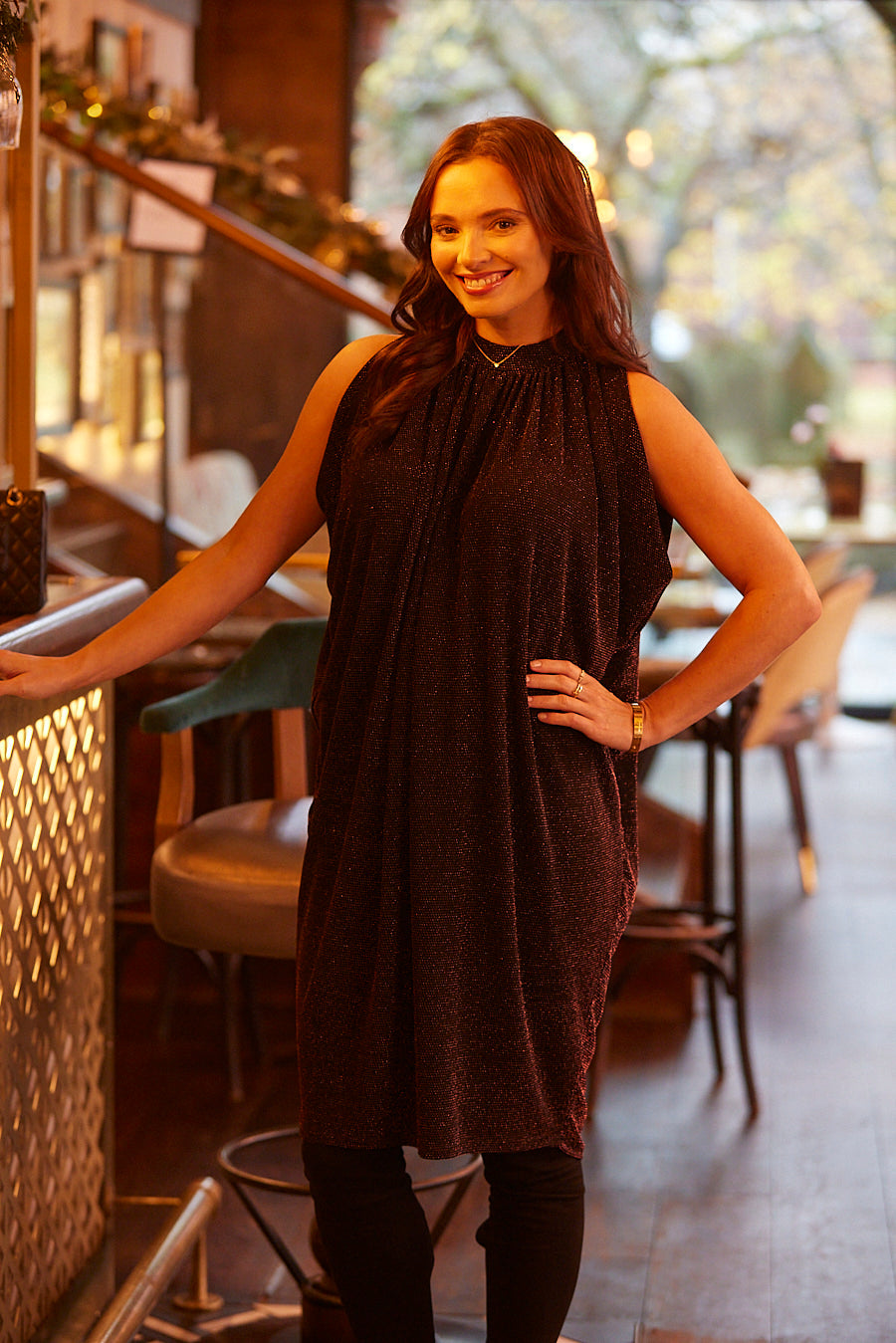 This glittery fabric dress is sure to turn heads! Featuring a sleeveless design, halter neckline, and knee length skirt, this dress is perfect for a night out. With its glittery fabric, you are sure to stand out in the crowd!