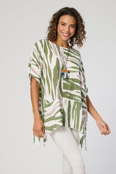 This unique, eye-catching top features a comfortable, breathable cotton top, panelled A-line silhouette, side dipped hem with slit detailing, and drop shoulder short sleeves. The standout feature is a modern zebra print with a subtle necklace* for an interesting contrast. A timeless dress for any occasion.