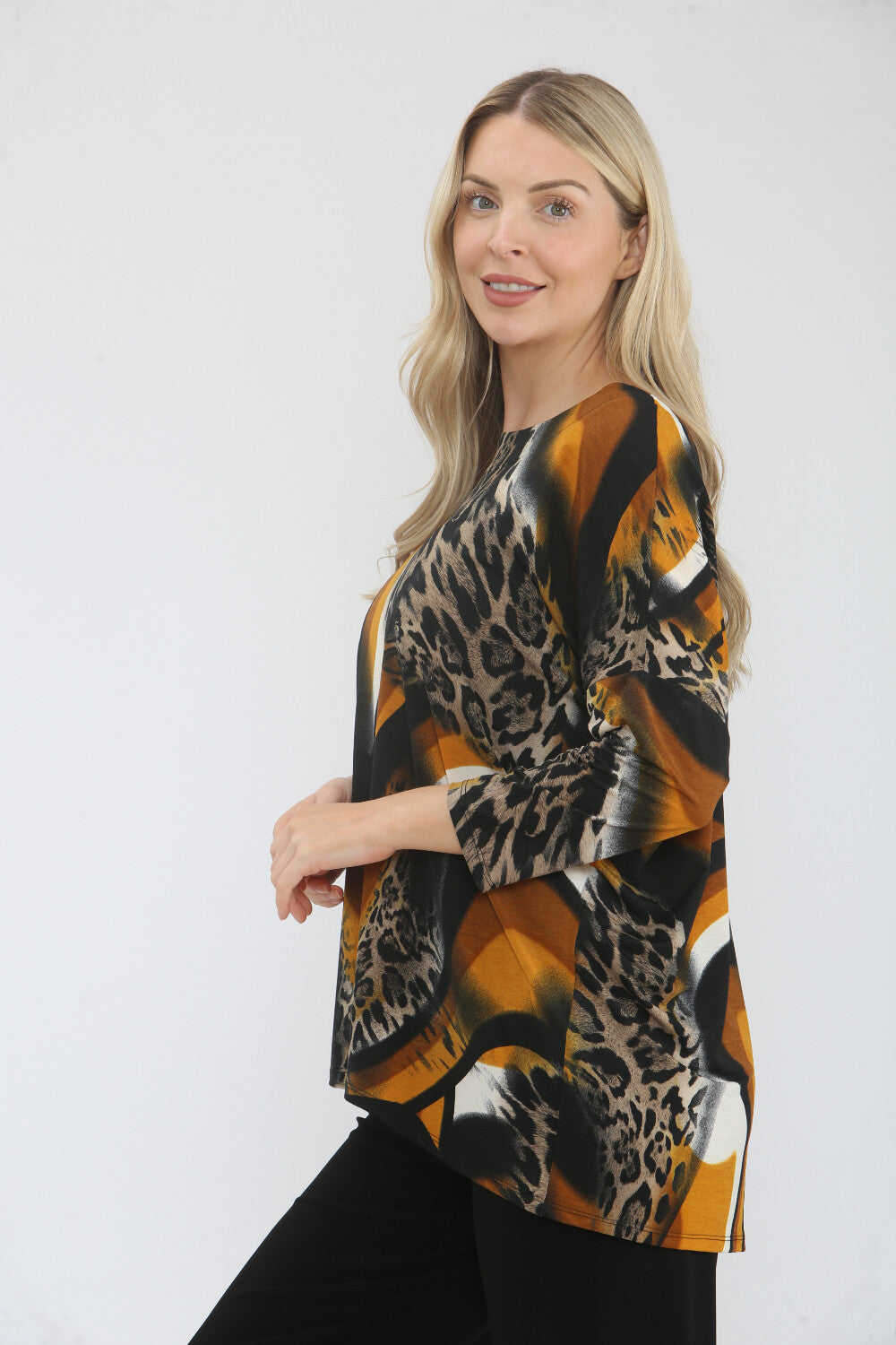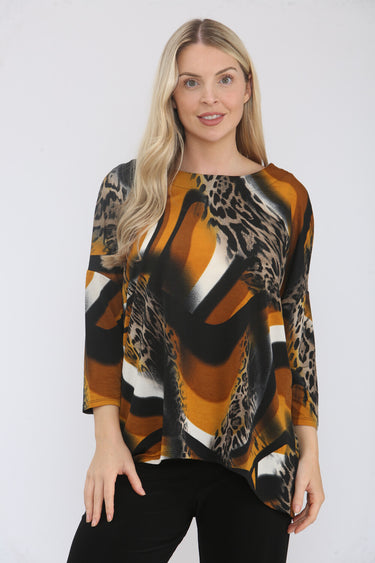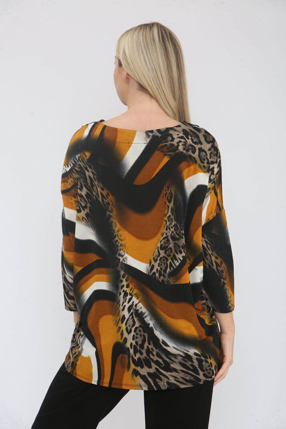 Make a bold statement with this chic and comfortable dolman 3/4 sleeve top. Featuring an eye-catching abstract animal print in rich autumnal hues of amber, black, and cream, this top combines effortless elegance with modern flair. The relaxed silhouette and soft stretch fabric ensure a flattering fit and all-day comfort.