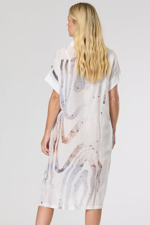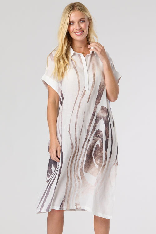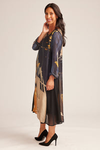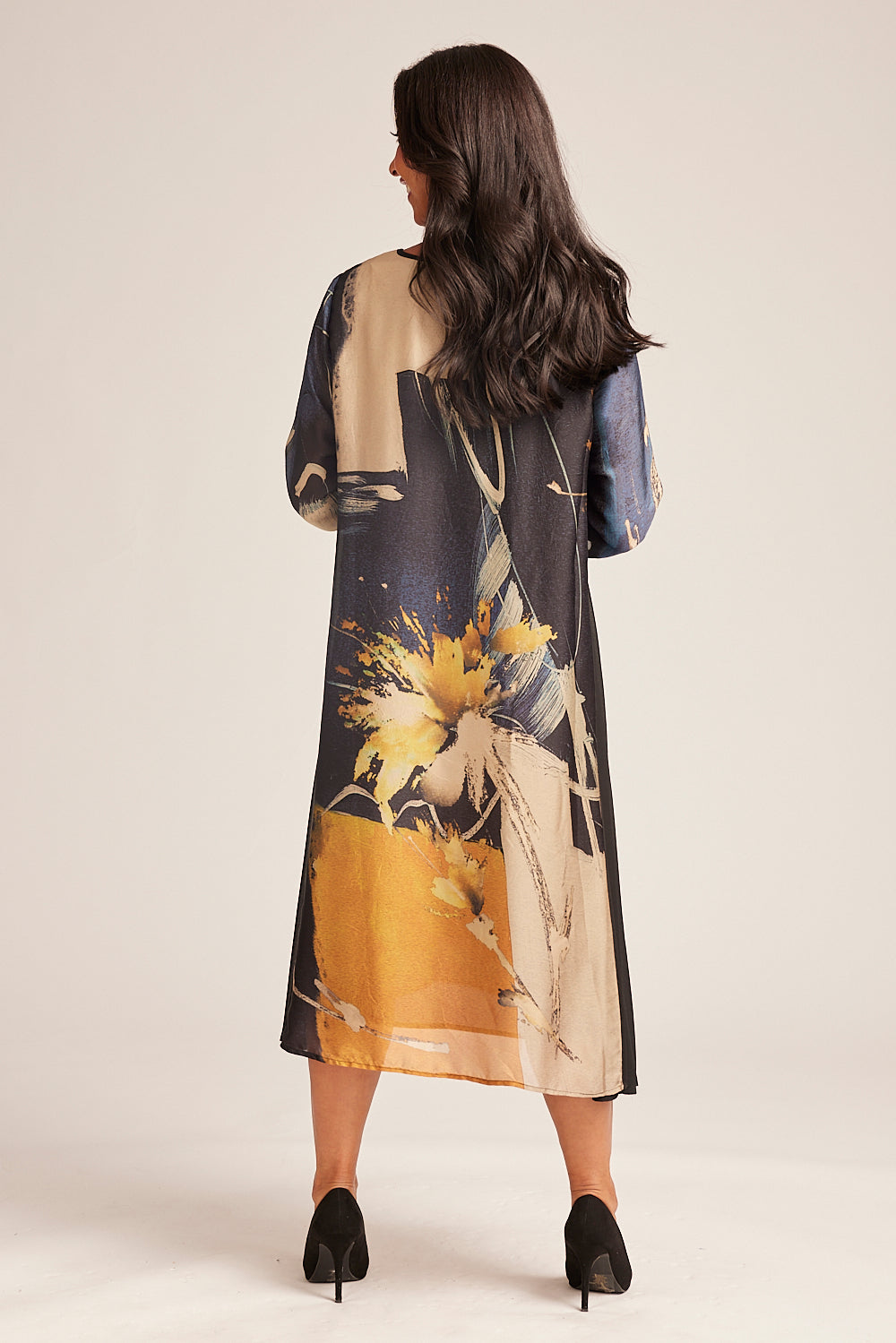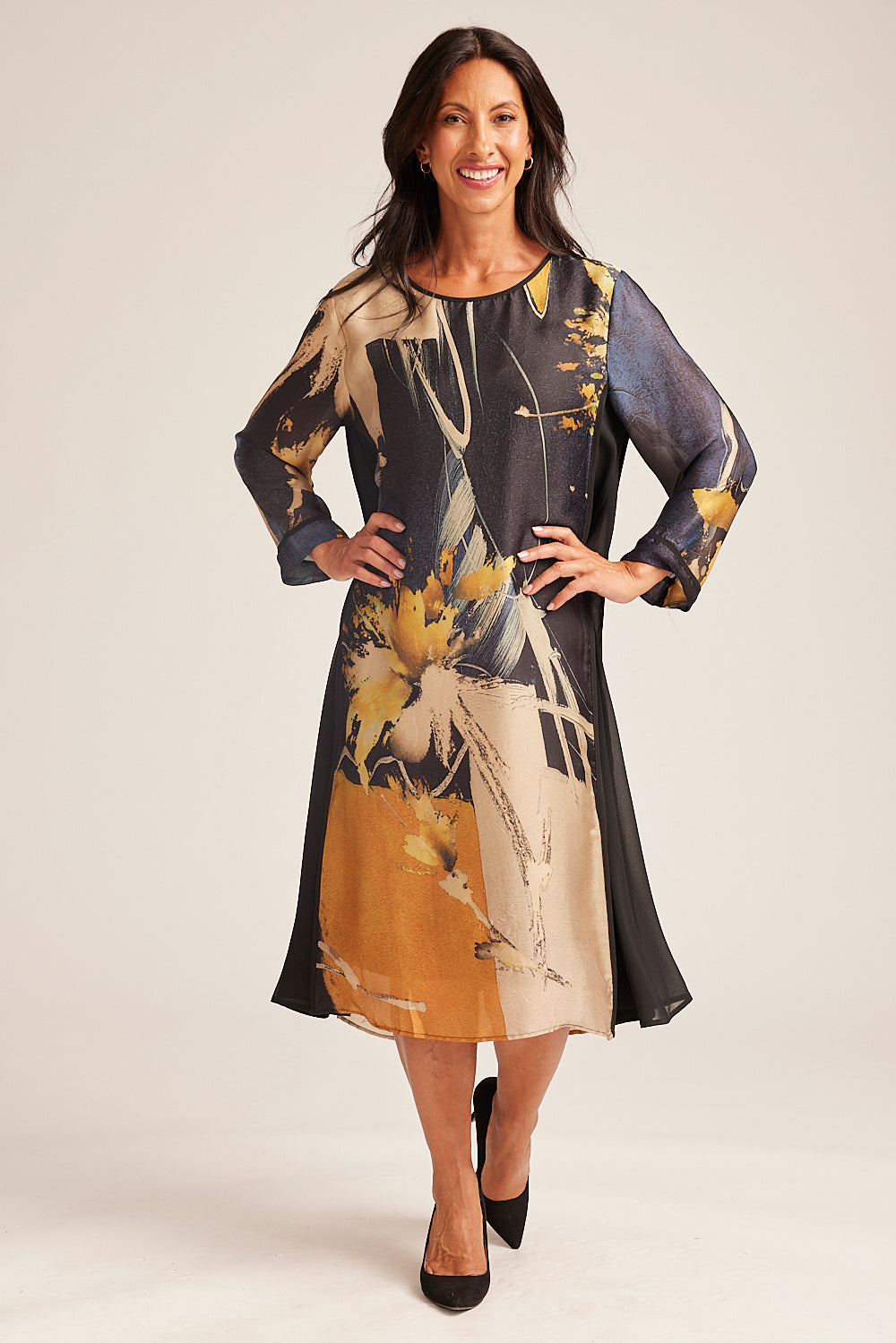 An elegant, sophisticated dress featuring a large, stylish motif print. Fully lined for comfort and durability, it features a boat neckline and long sleeves for a stunning silhouette. Perfect for special occasions!