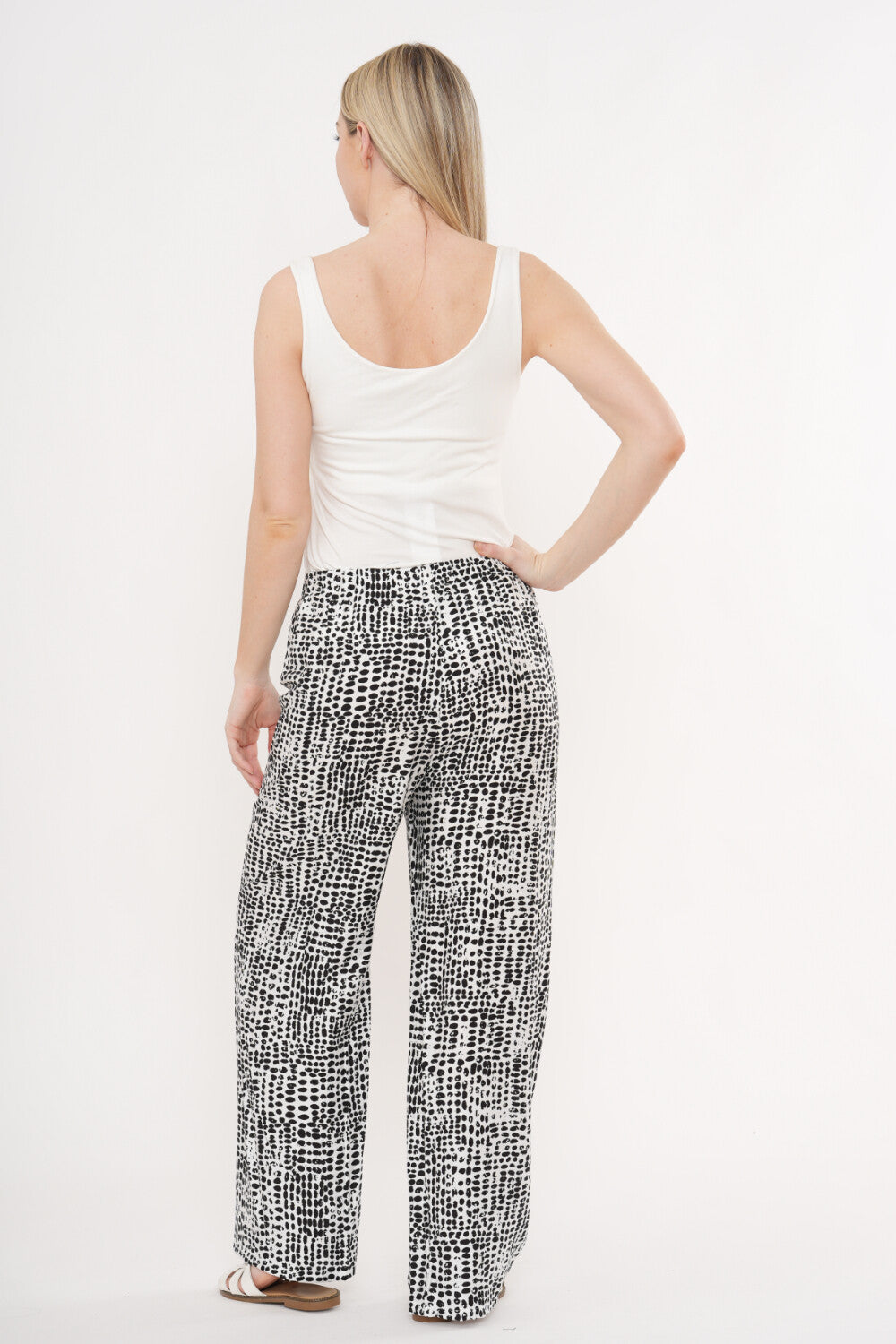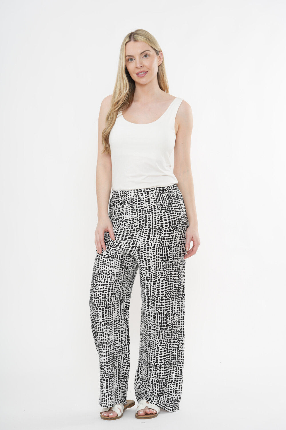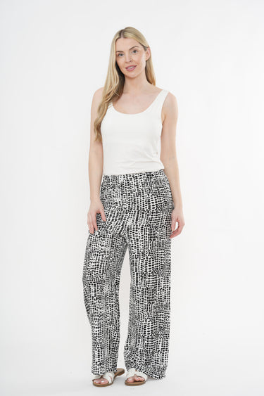 These printed wide-leg trousers are the perfect blend of comfort and modern style. Designed with a flattering high waist and a relaxed, flowing silhouette, they offer an easy, elegant fit for everyday wear. The eye-catching monochrome print adds a contemporary edge, making them a standout piece that’s still easy to style.