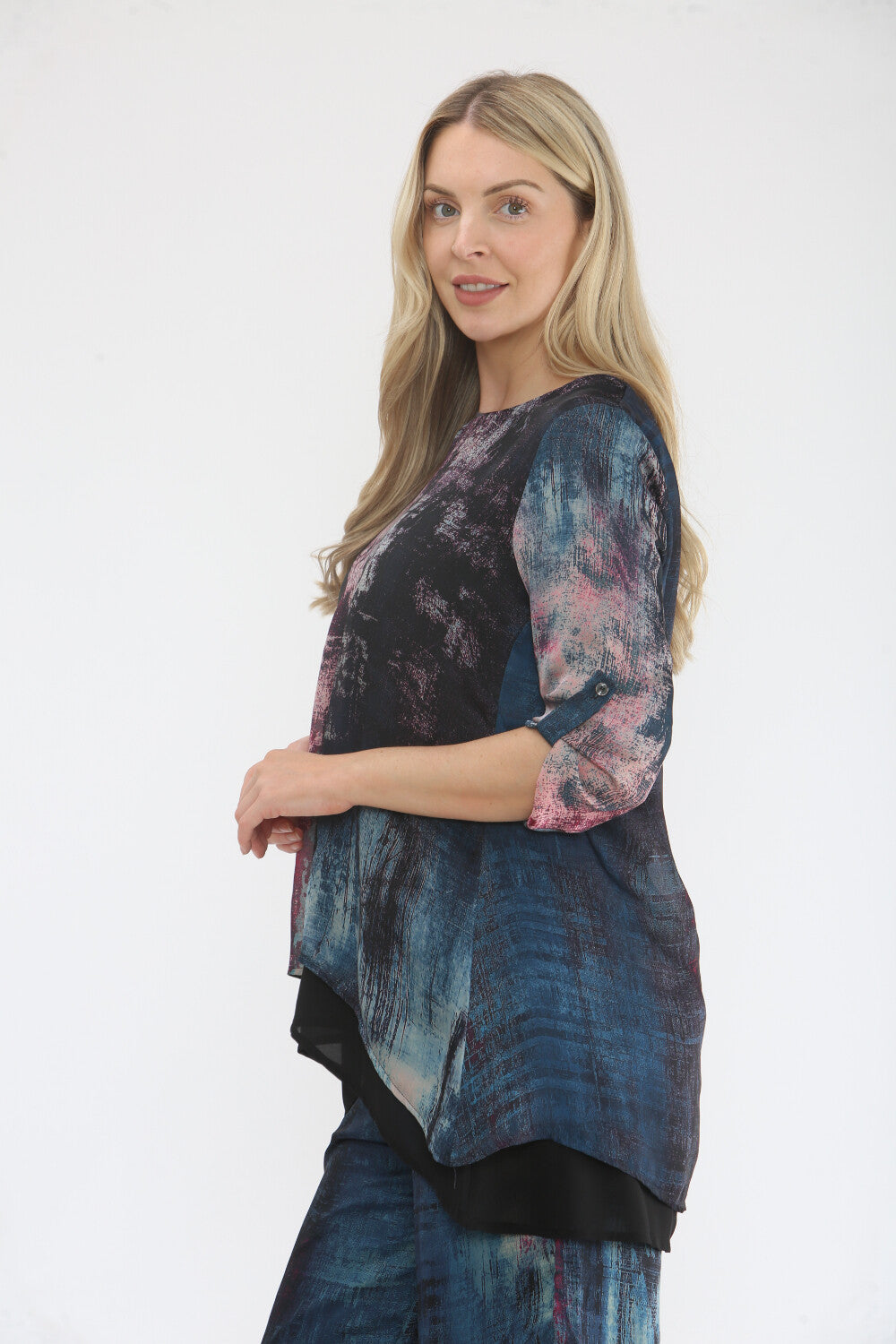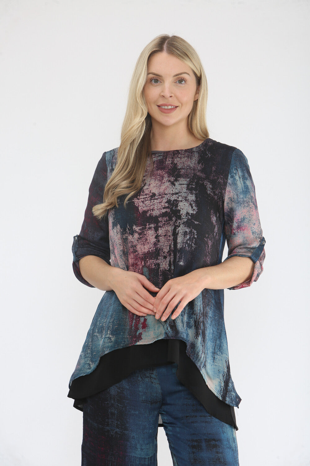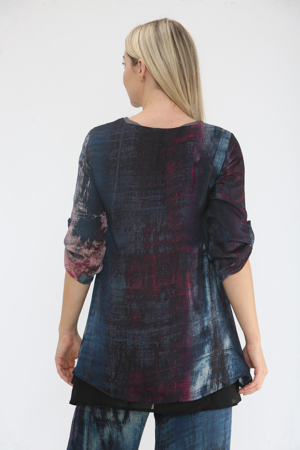 Elevate your everyday style with this stunning abstract layered top. Crafted from lightweight, flowy fabric, it features a unique brushstroke print in rich tones of blue, burgundy, and black, giving it an effortlessly artistic look. The soft round neckline and 3/4 roll-tab sleeves add a relaxed yet refined touch, while the asymmetric hem creates beautiful movement and flattering coverage.