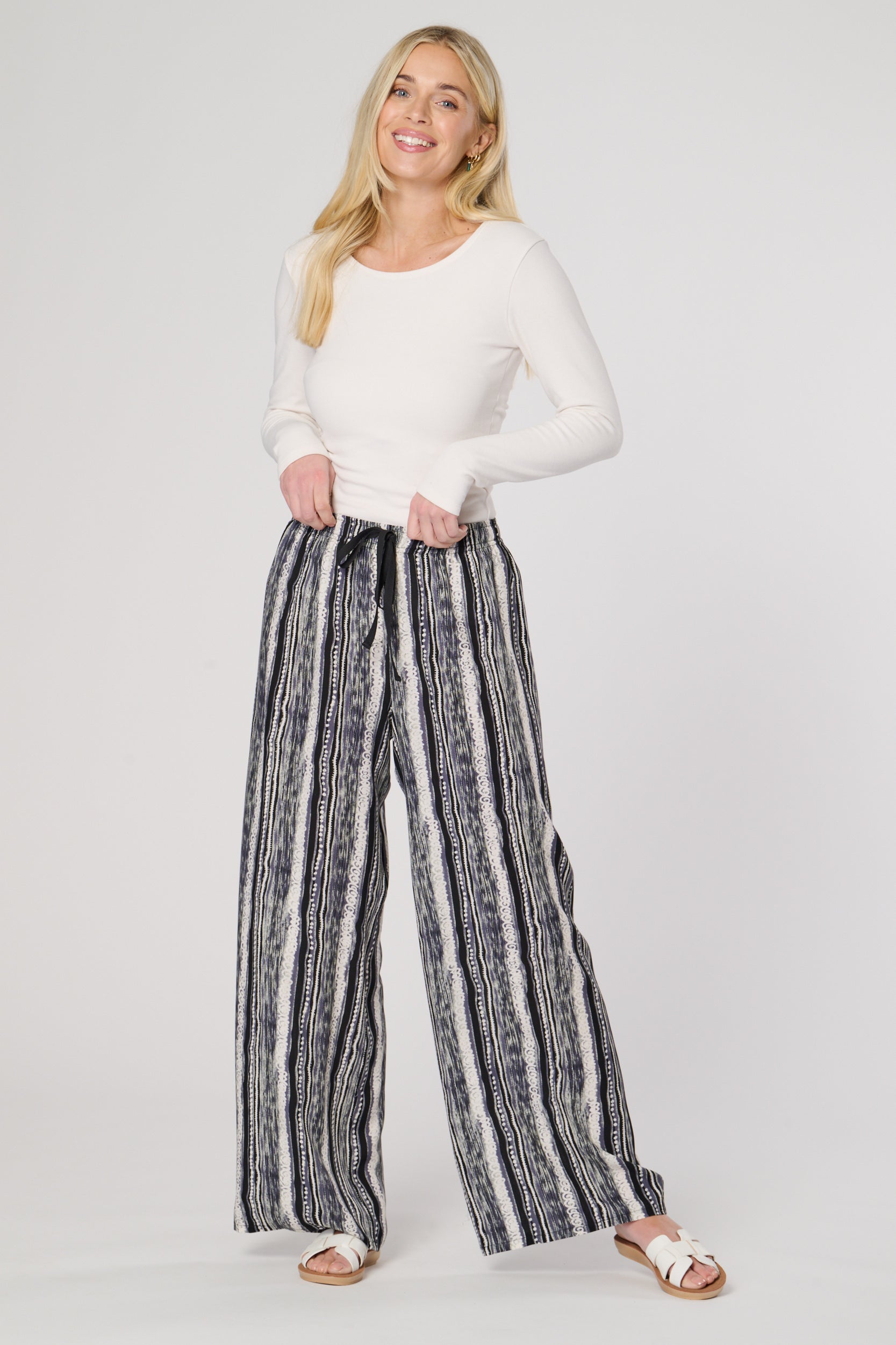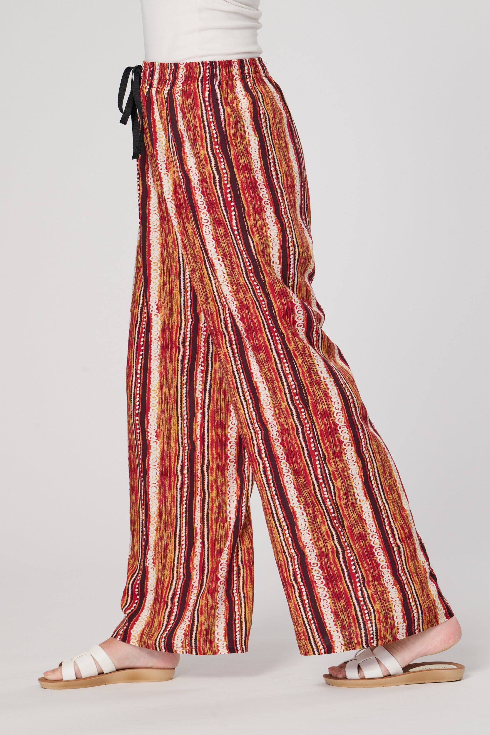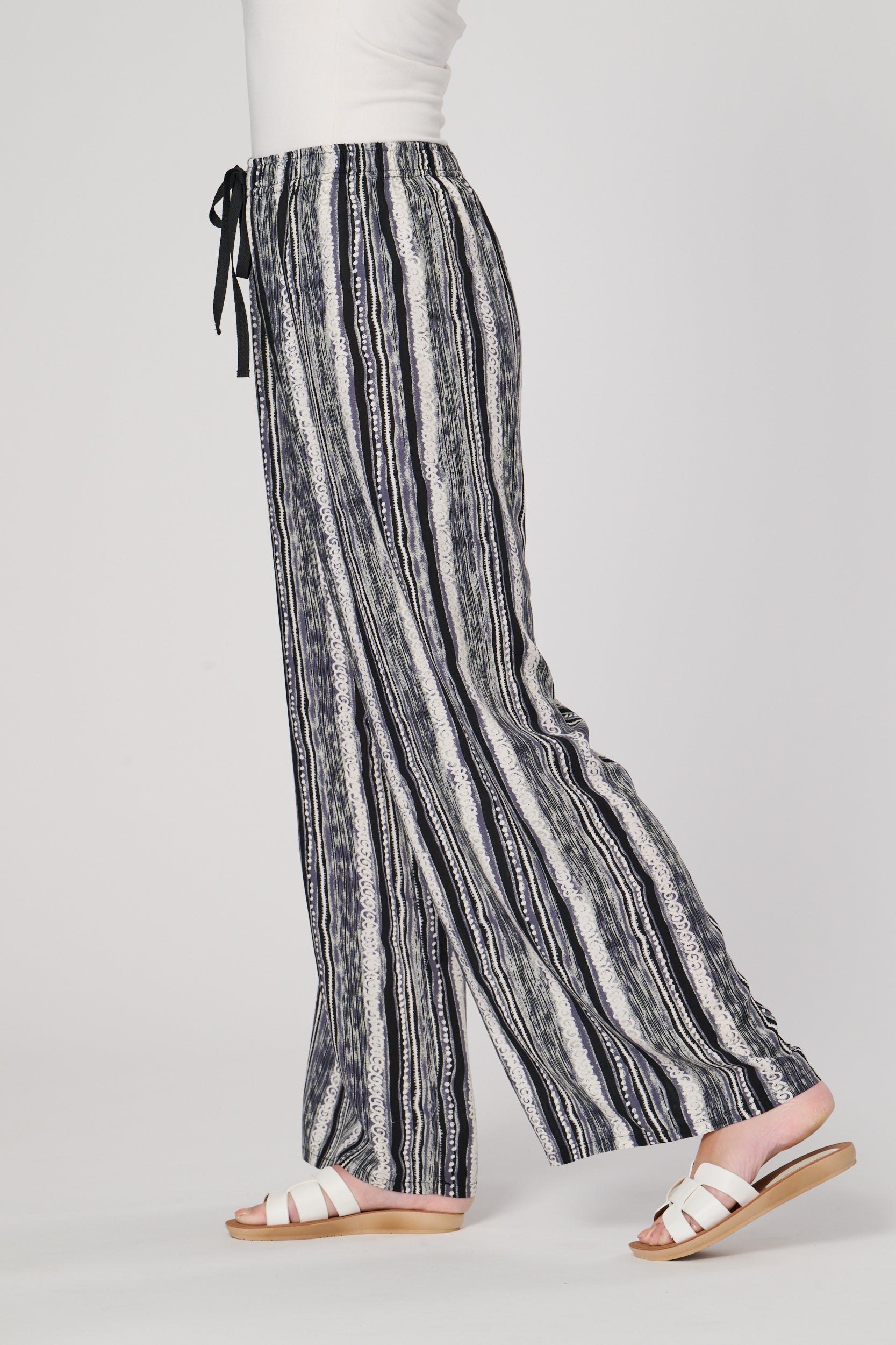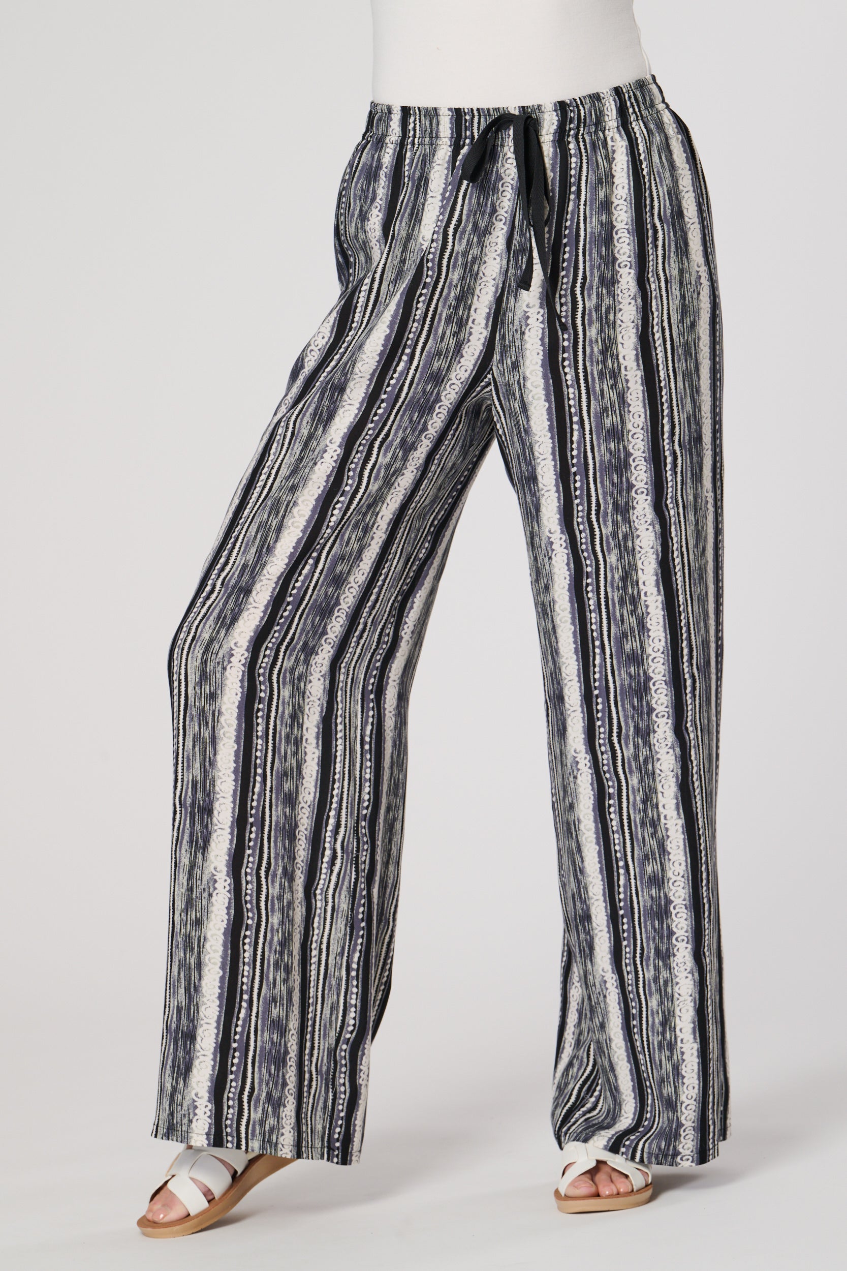 These wide leg trousers are the perfect combination of style and comfort. The contrasting stripe print adds a touch of flair while the elasticated waist with mocktie ensures a perfect fit. Made with light fabric for maximum breathability. Fashion and functionality all in one!