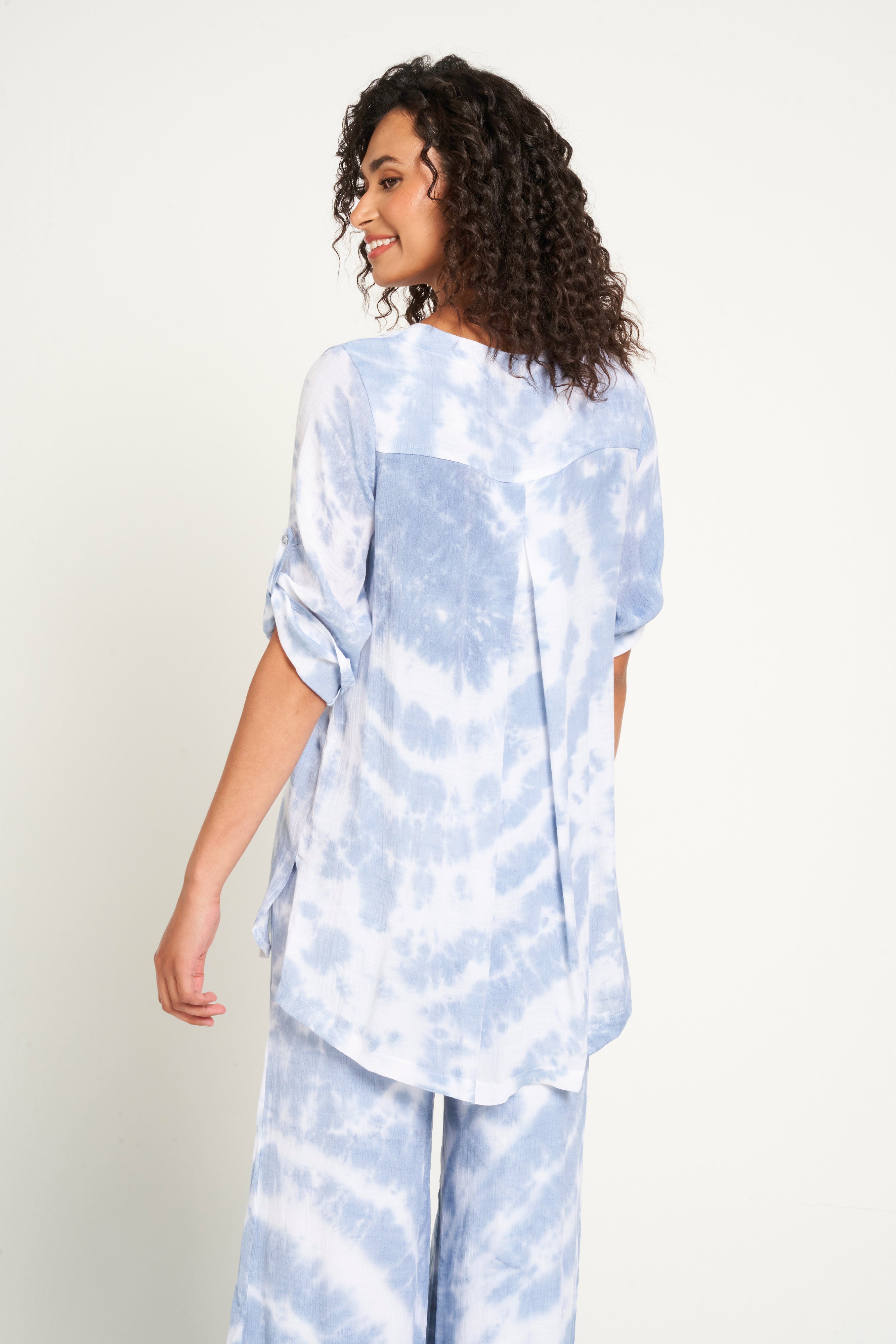 Empower your style with our button through tunic shirt. Featuring a round neckline and high low hemline, this shirt is designed to flatter your figure. The tie & dye print adds a touch of uniqueness, while the lightweight fabric and side slits provide optimum comfort. Elevate your look with this versatile piece.