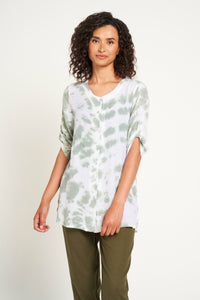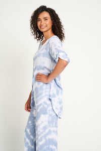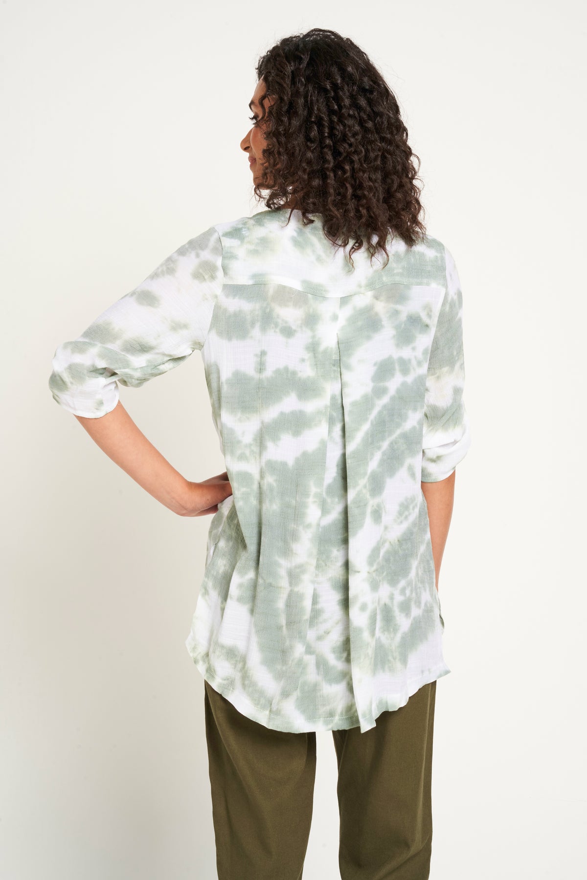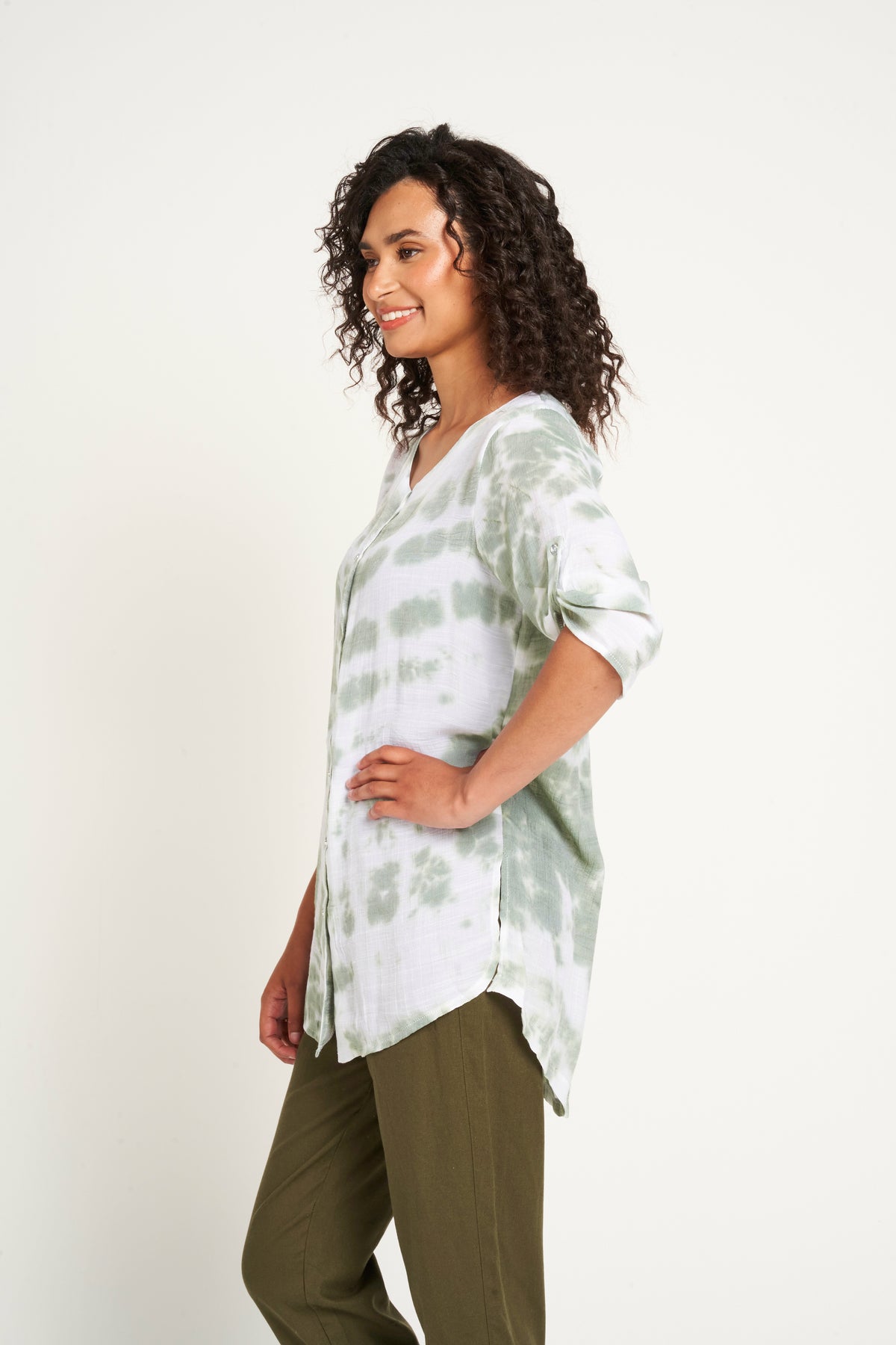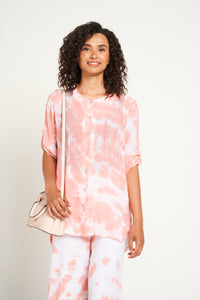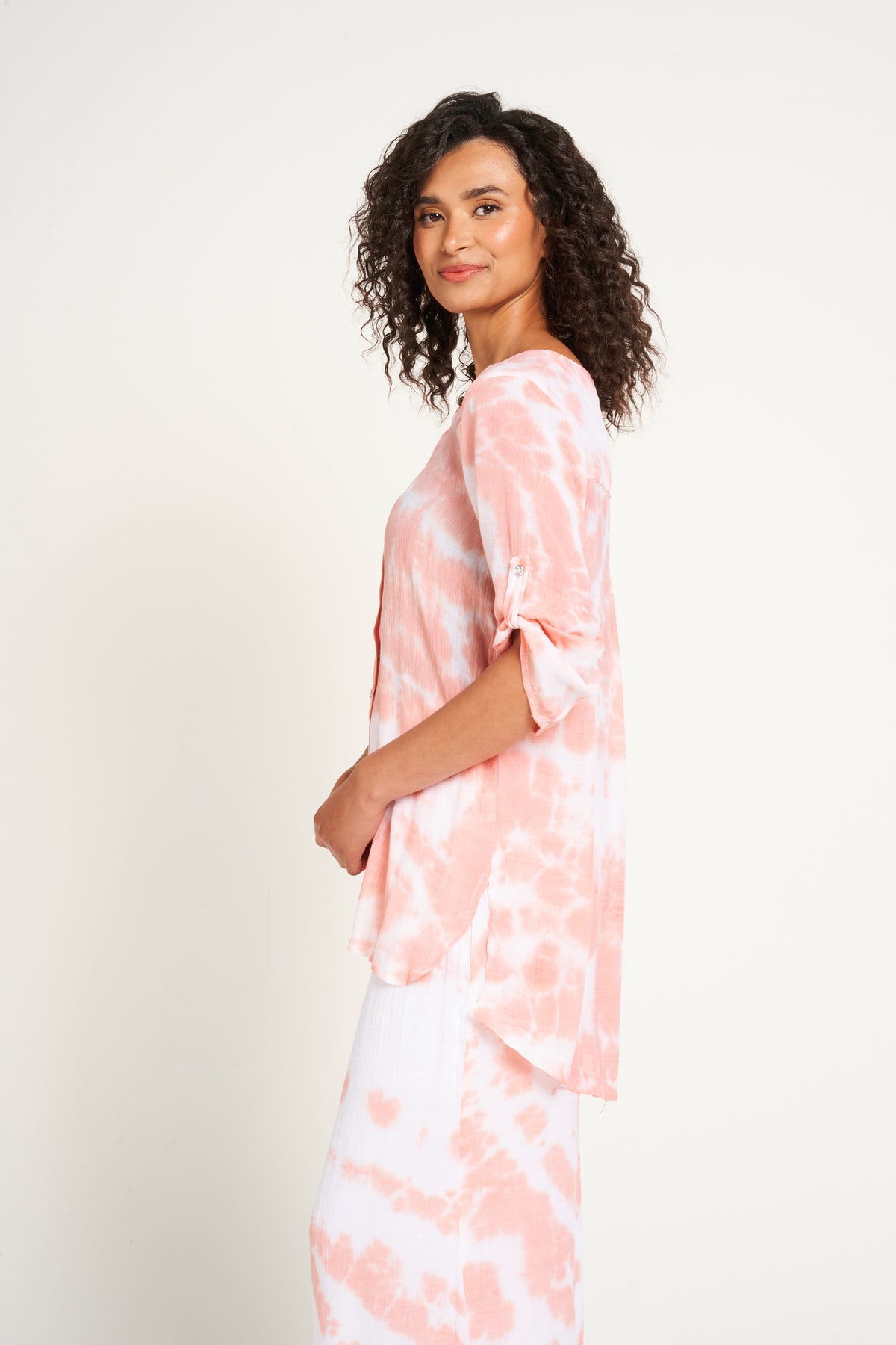 Empower your style with our button through tunic shirt. Featuring a round neckline and high low hemline, this shirt is designed to flatter your figure. The tie & dye print adds a touch of uniqueness, while the lightweight fabric and side slits provide optimum comfort. Elevate your look with this versatile piece.