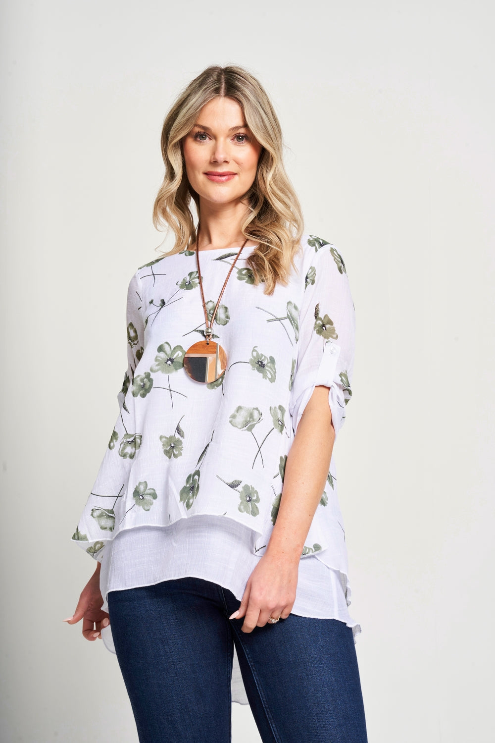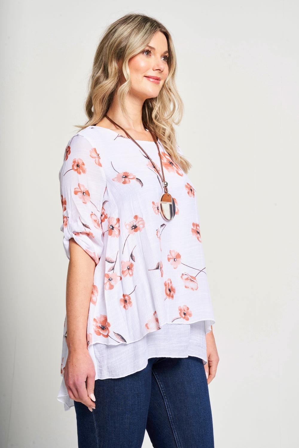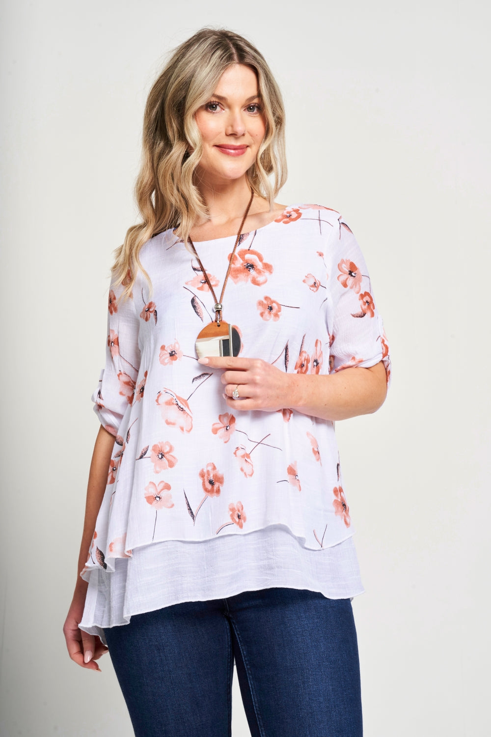 This linen look top features a double layer design, and round neckline. Its matching necklace* and ruched sleeves add a touch of elegance. The split back and lightweight fabric offer comfort and style.