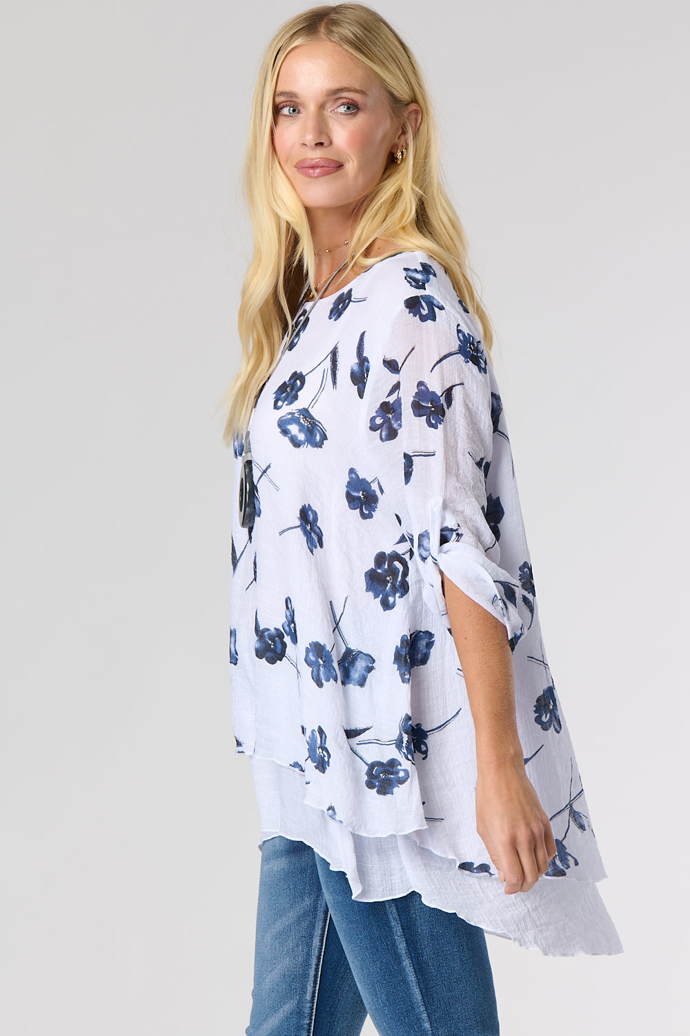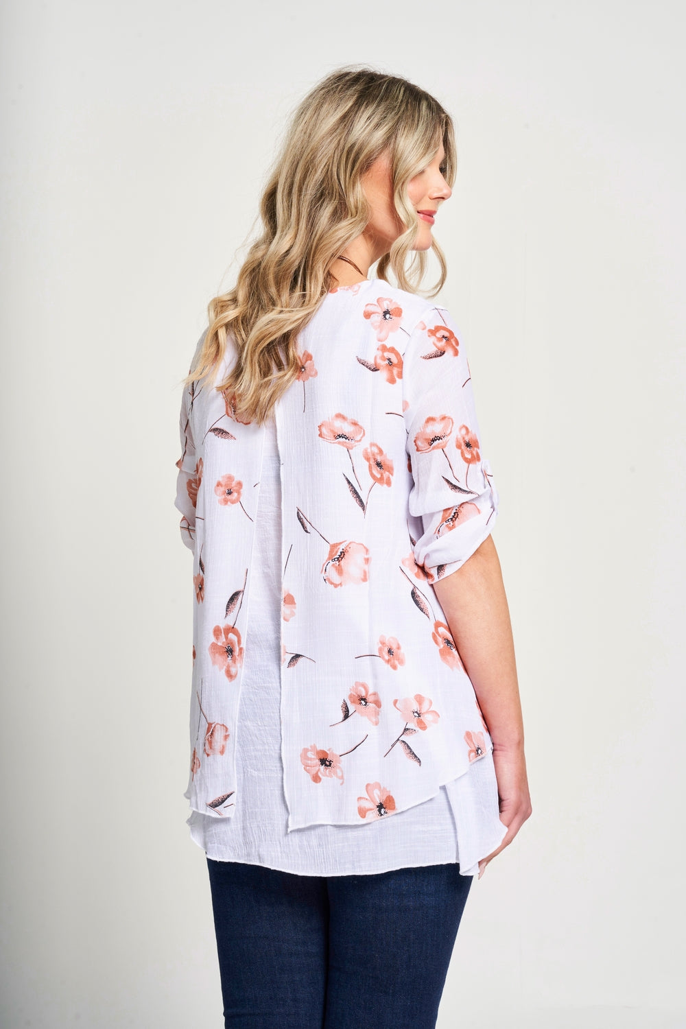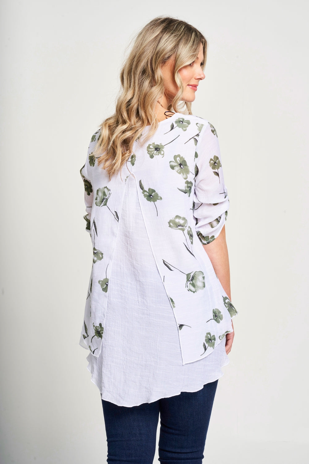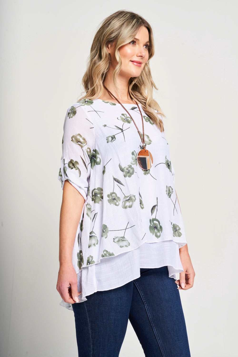 This linen look top features a double layer design, and round neckline. Its matching necklace* and ruched sleeves add a touch of elegance. The split back and lightweight fabric offer comfort and style.