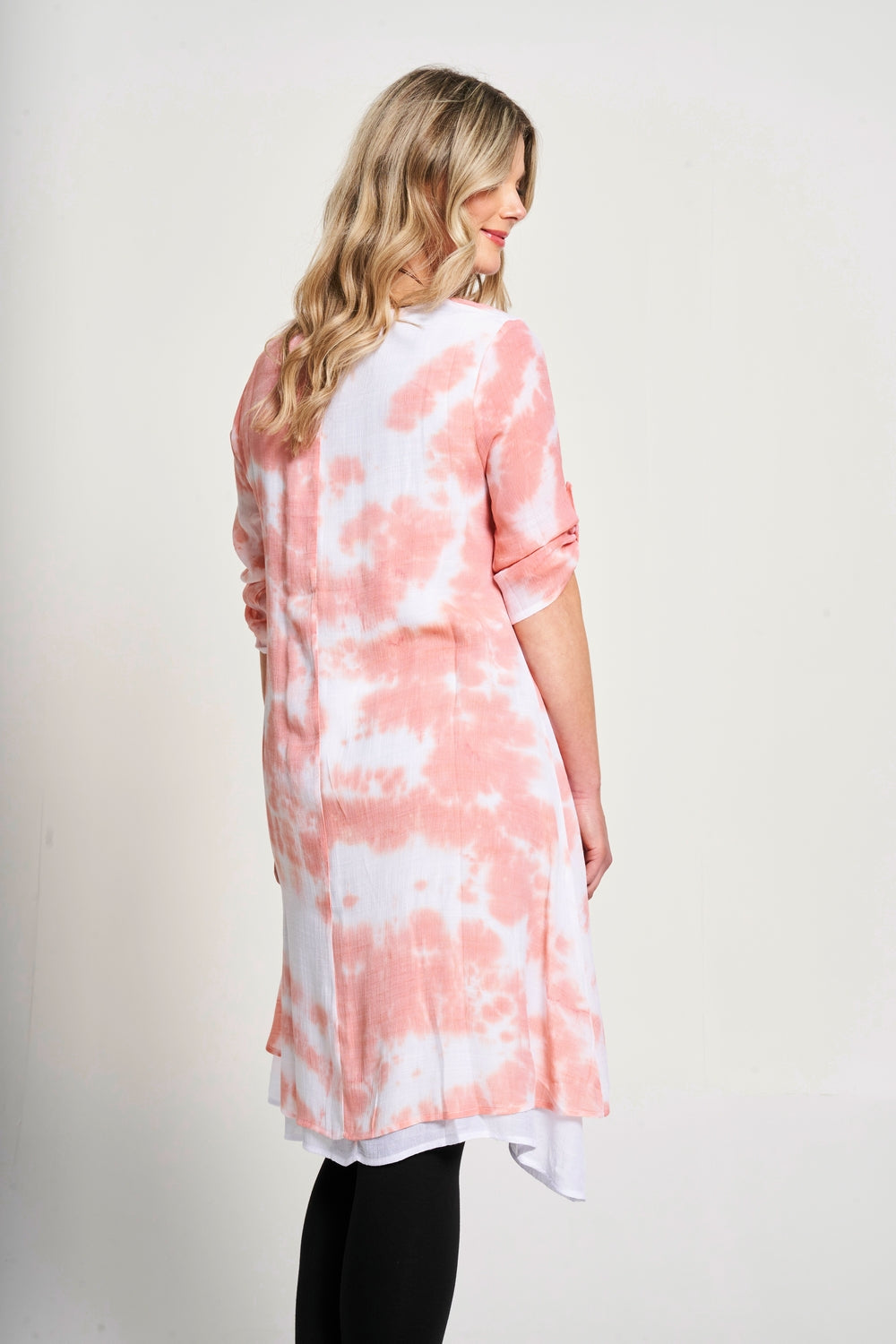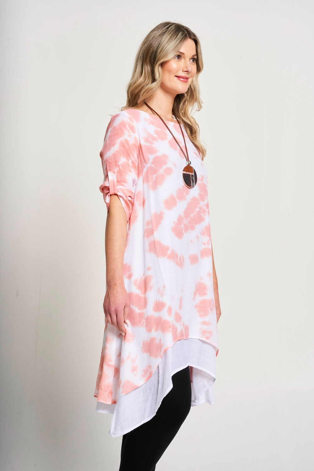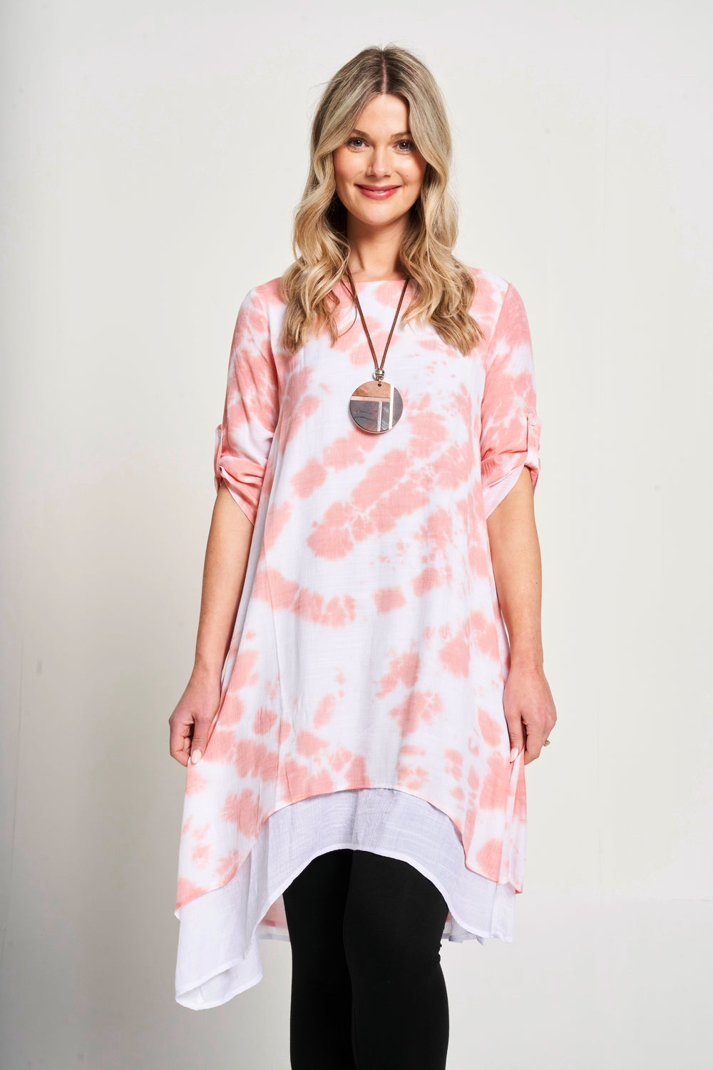 This tie dye dress features a flattering high-low hem and ruched button tab sleeves for a stylish look. The double layer design adds dimension and the matching necklace* completes the ensemble. Perfect for any occasion, this dress is a must-have for your wardrobe.