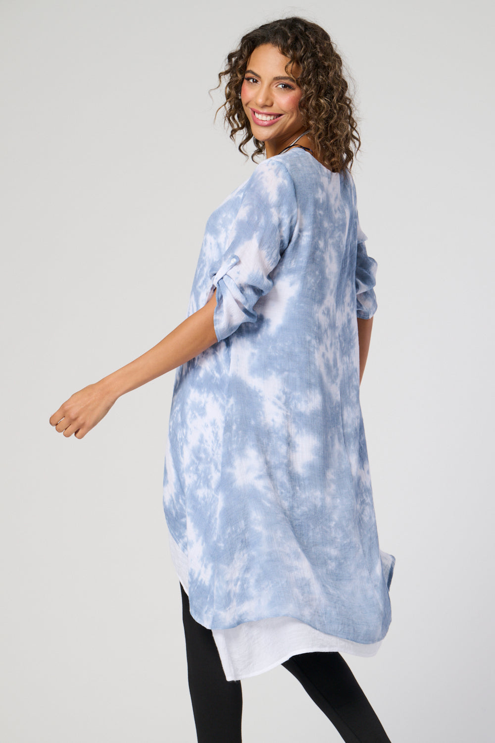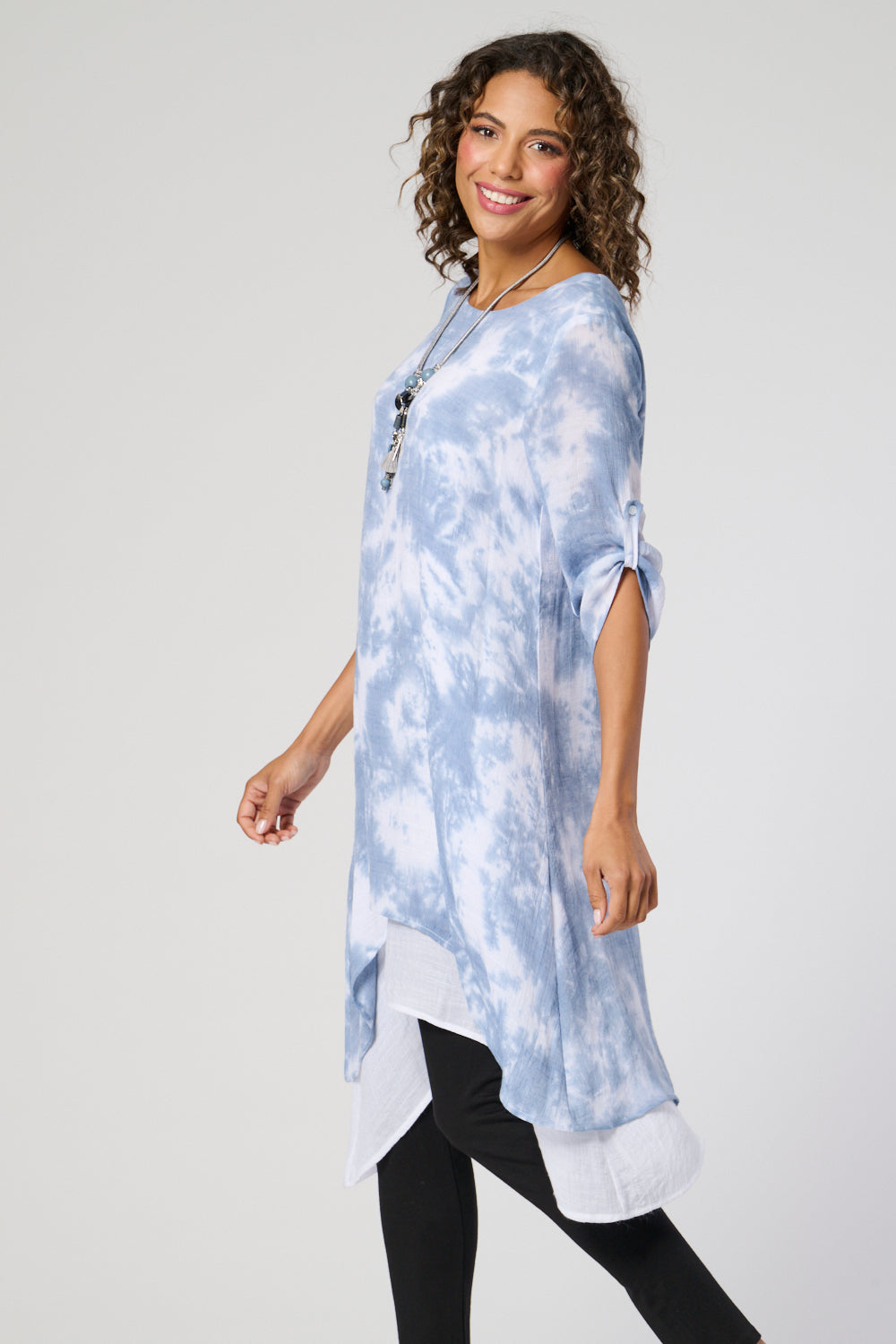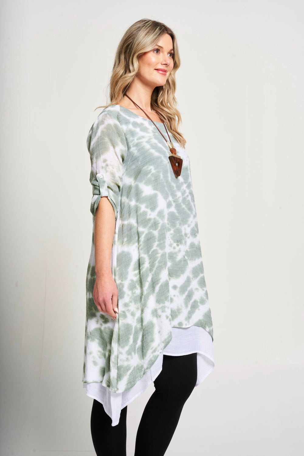 This tie dye dress features a flattering high-low hem and ruched button tab sleeves for a stylish look. The double layer design adds dimension and the matching necklace* completes the ensemble. Perfect for any occasion, this dress is a must-have for your wardrobe.