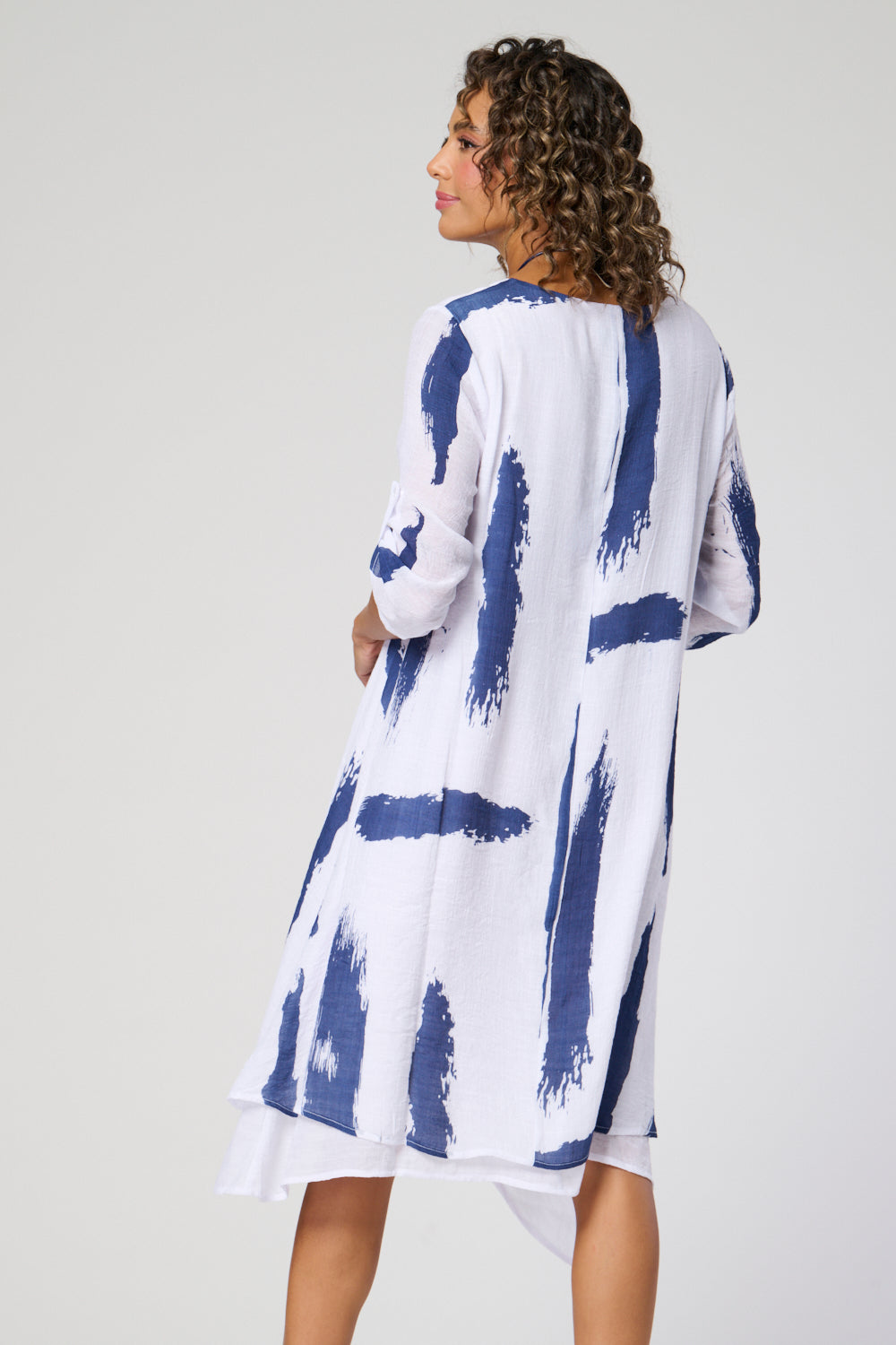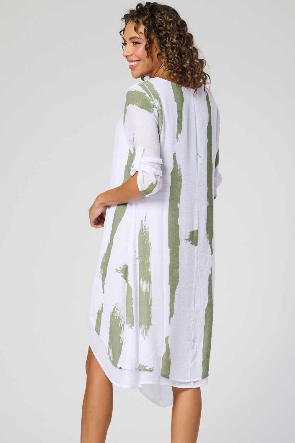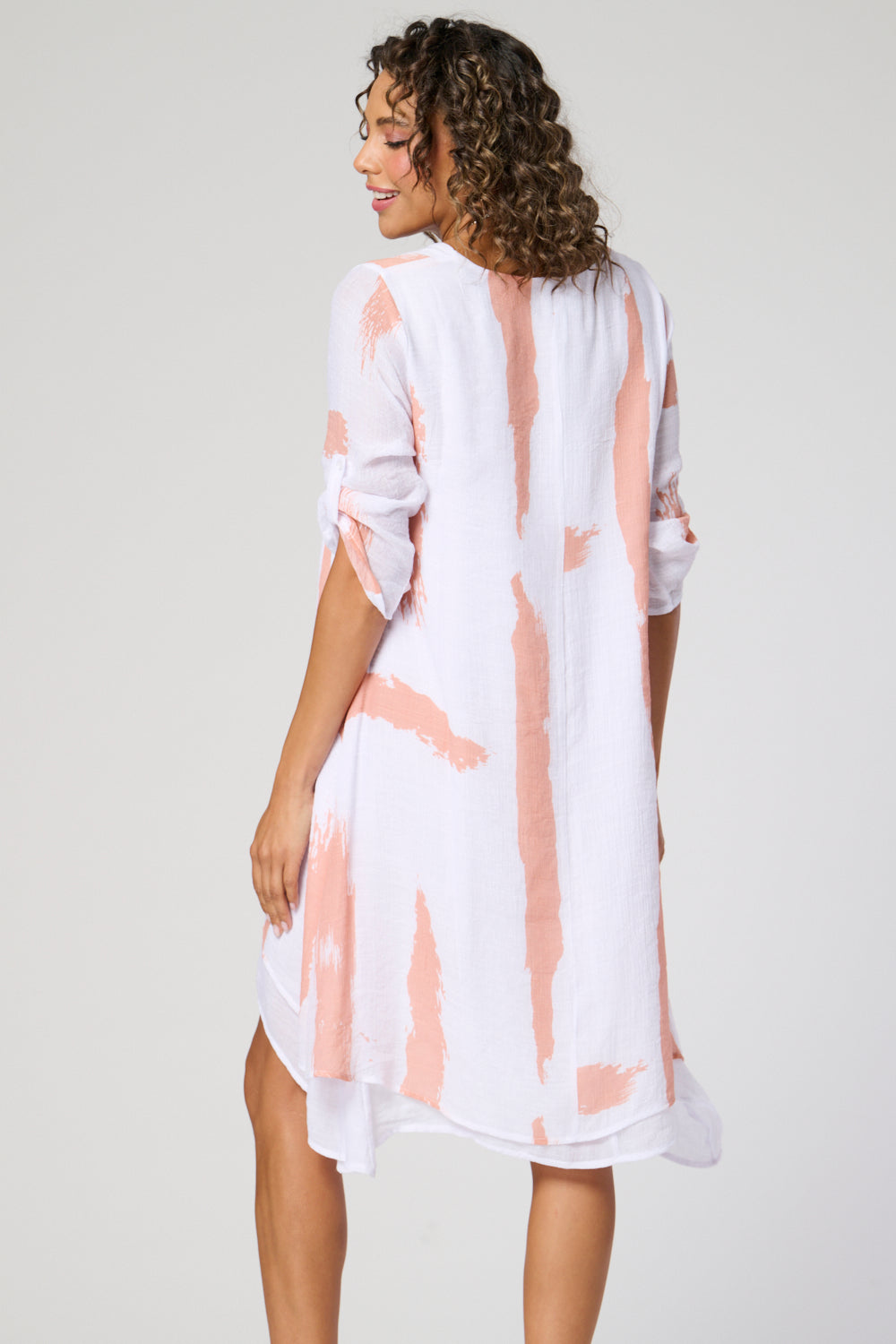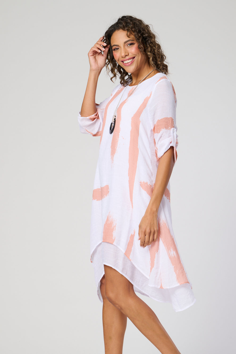 Elevate your wardrobe with our A-line dress. Made with a double layer of light, breathable fabric, this dress is perfect for any occasion. The ruched sleeve with button and tab adds a fashionable touch, and it even comes with a matching necklace*. With a round neck and pastel coloured print, this dress is both comfortable and stylish.