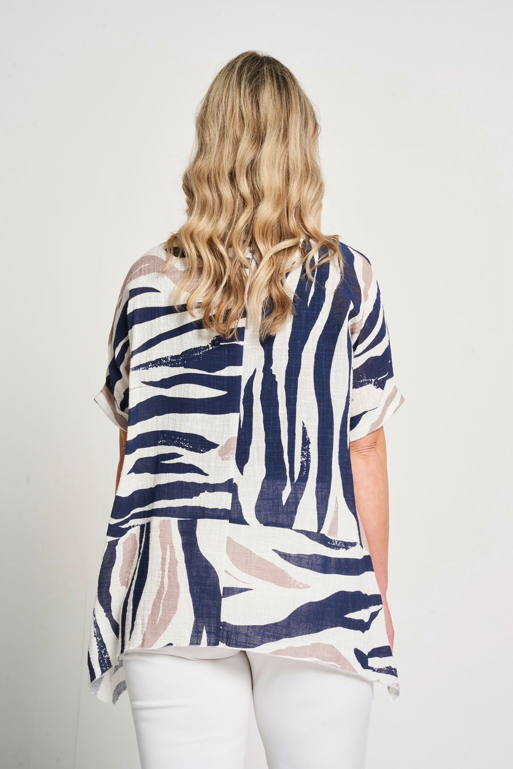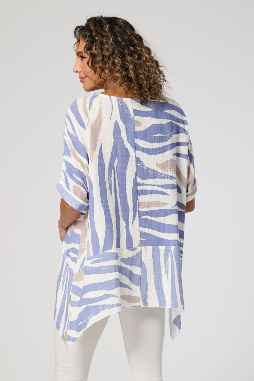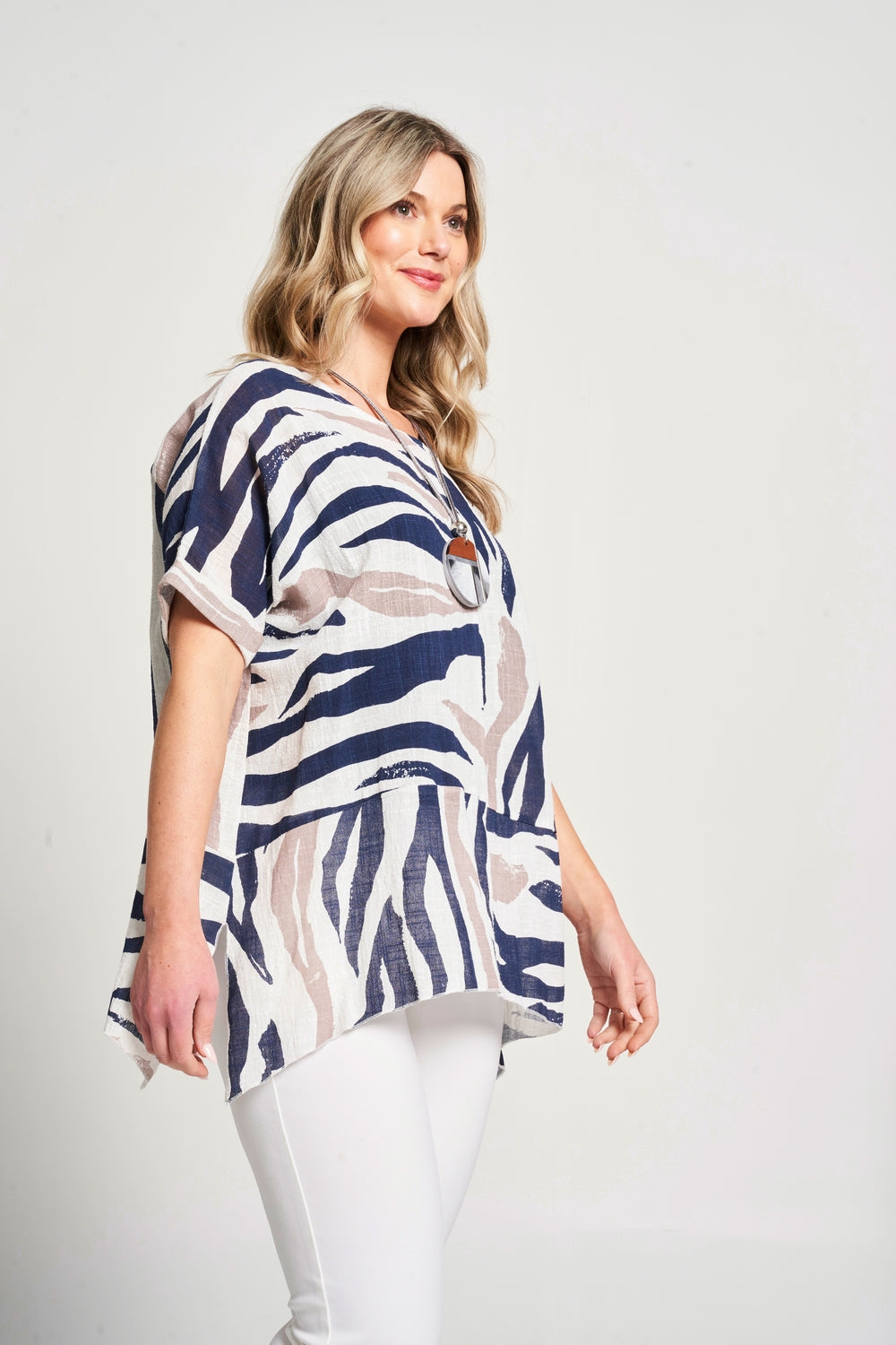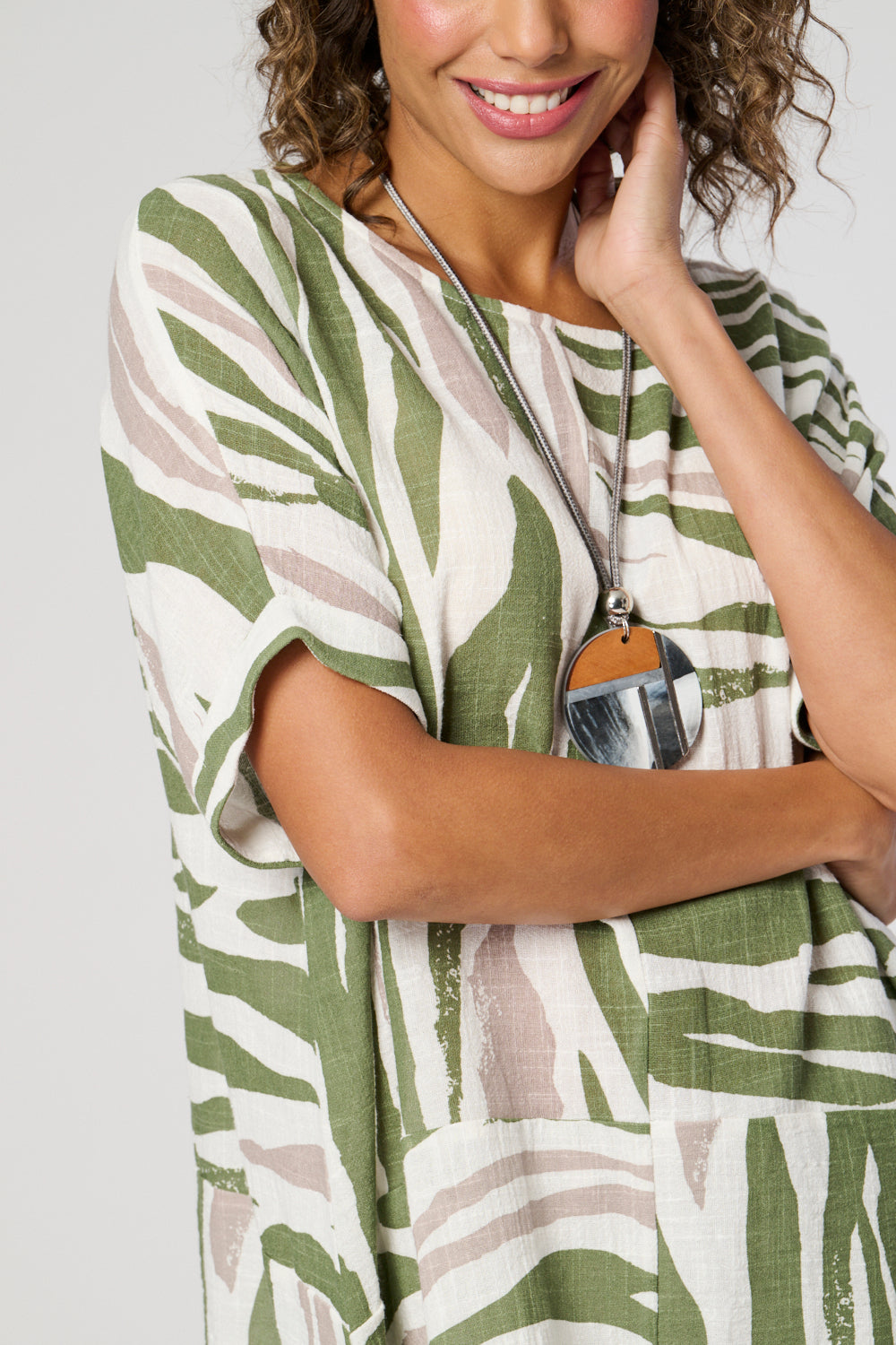 This unique, eye-catching top features a comfortable, breathable cotton top, panelled A-line silhouette, side dipped hem with slit detailing, and drop shoulder short sleeves. The standout feature is a modern zebra print with a subtle necklace* for an interesting contrast. A timeless dress for any occasion.
