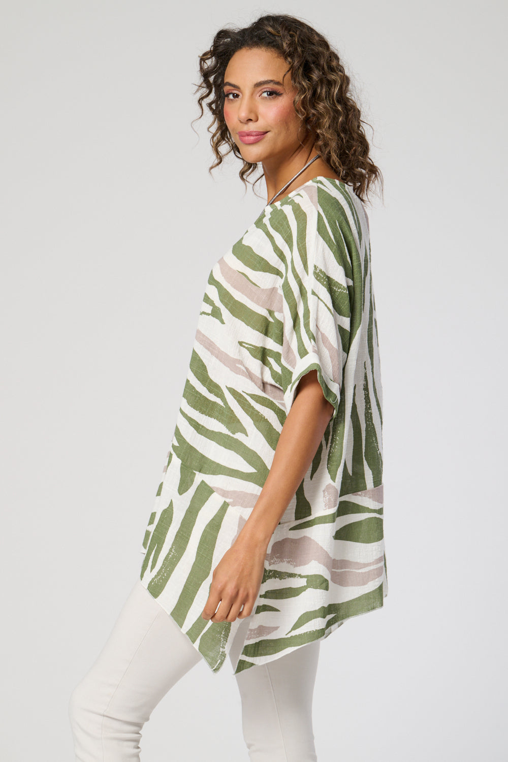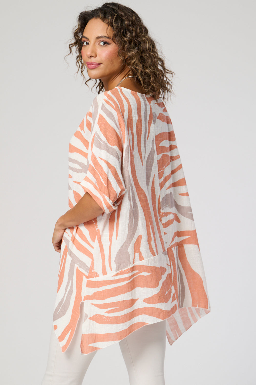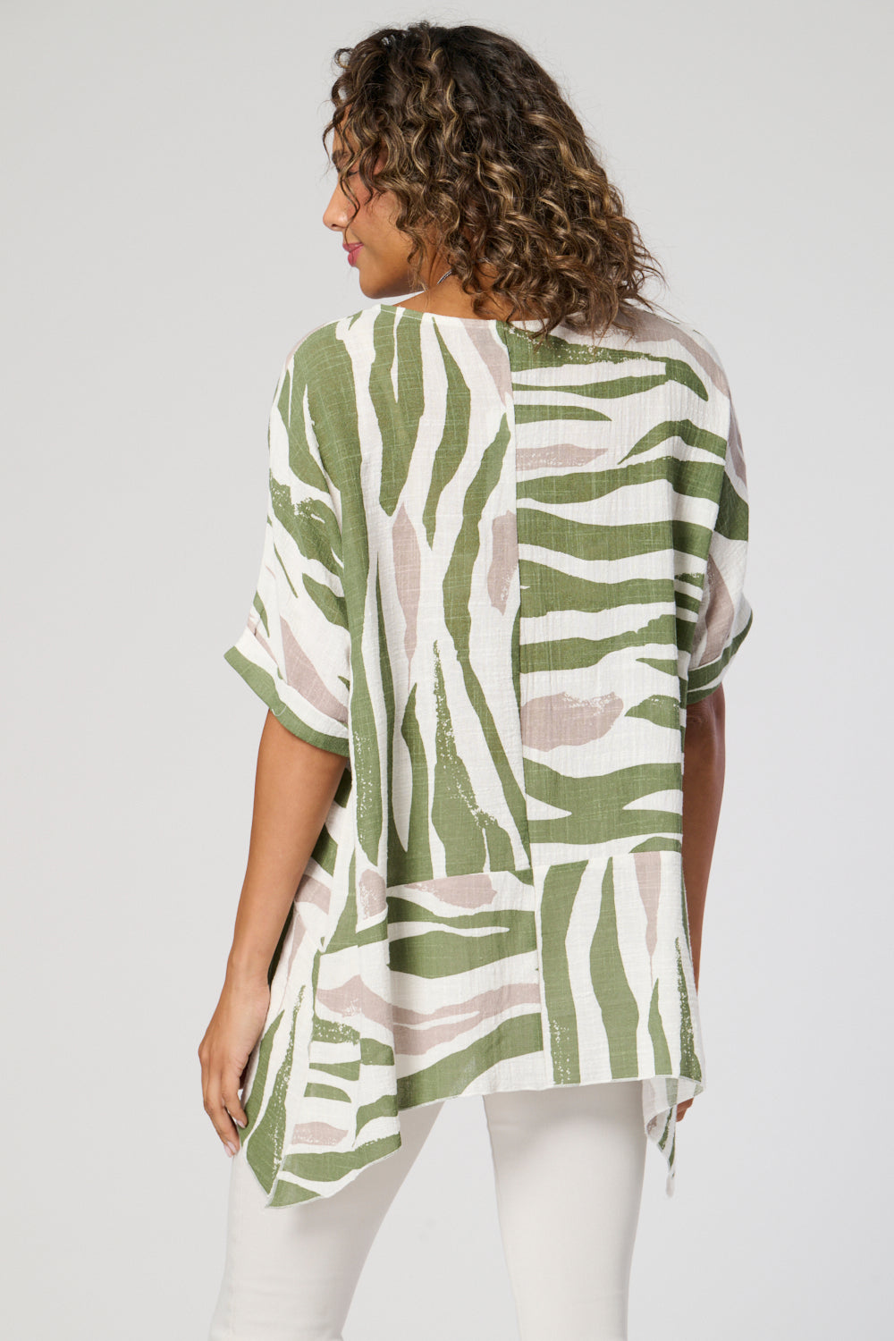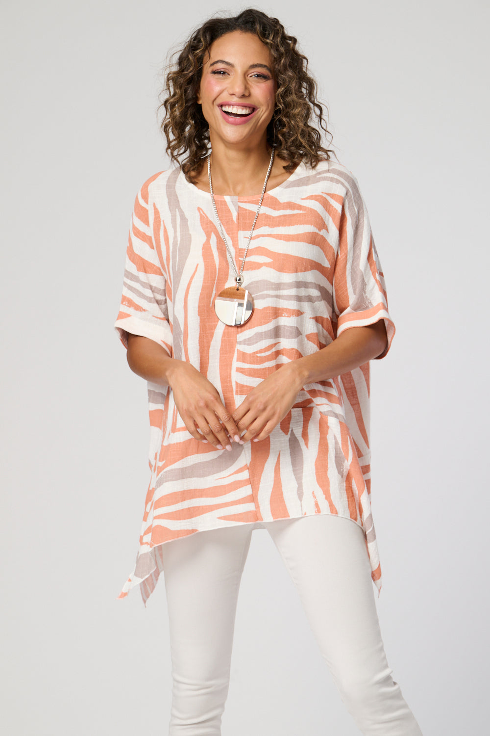 This unique, eye-catching top features a comfortable, breathable cotton top, panelled A-line silhouette, side dipped hem with slit detailing, and drop shoulder short sleeves. The standout feature is a modern zebra print with a subtle necklace* for an interesting contrast. A timeless dress for any occasion.