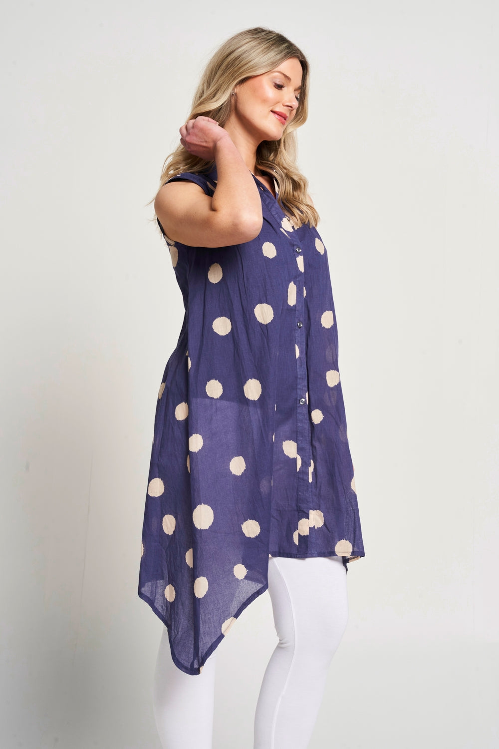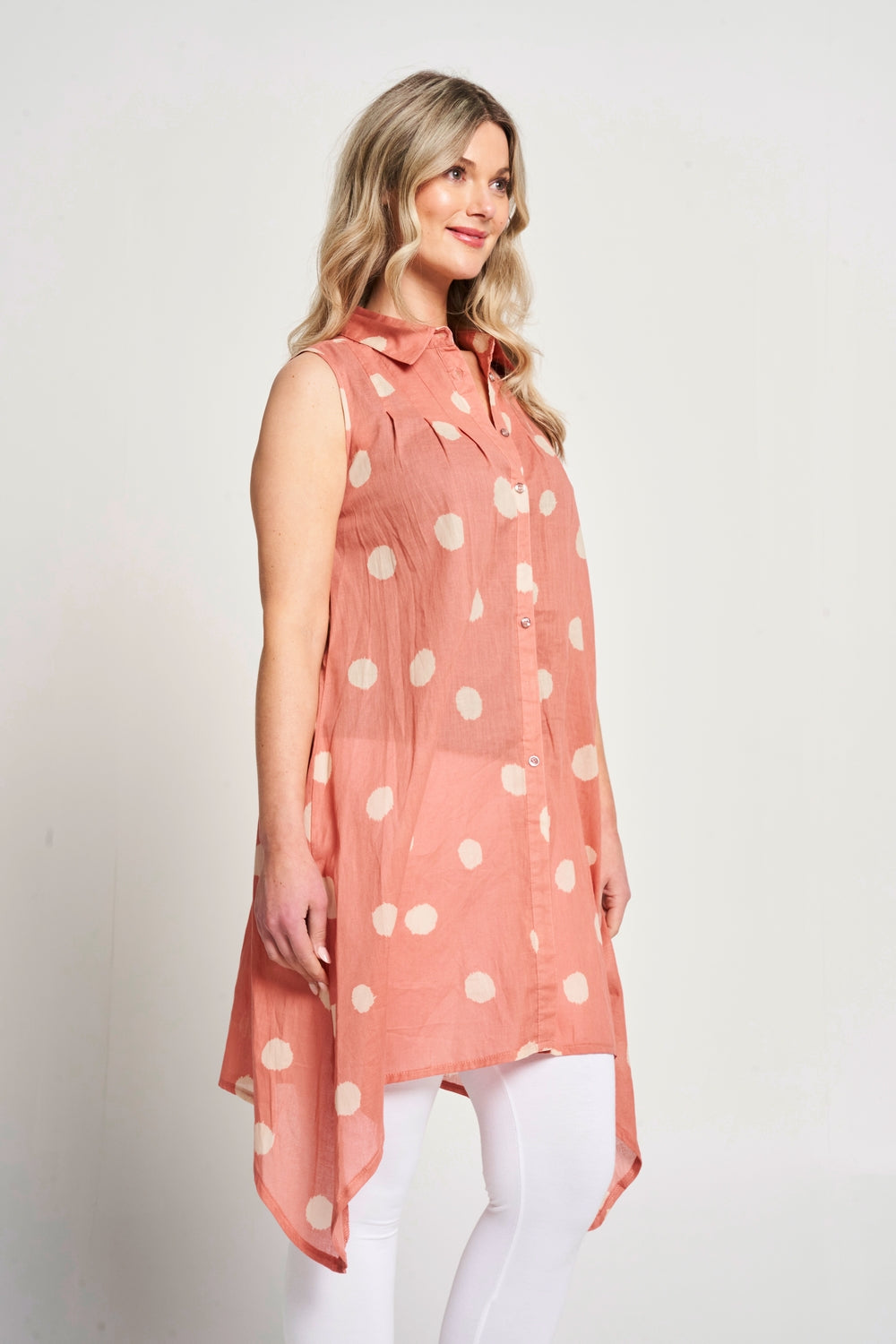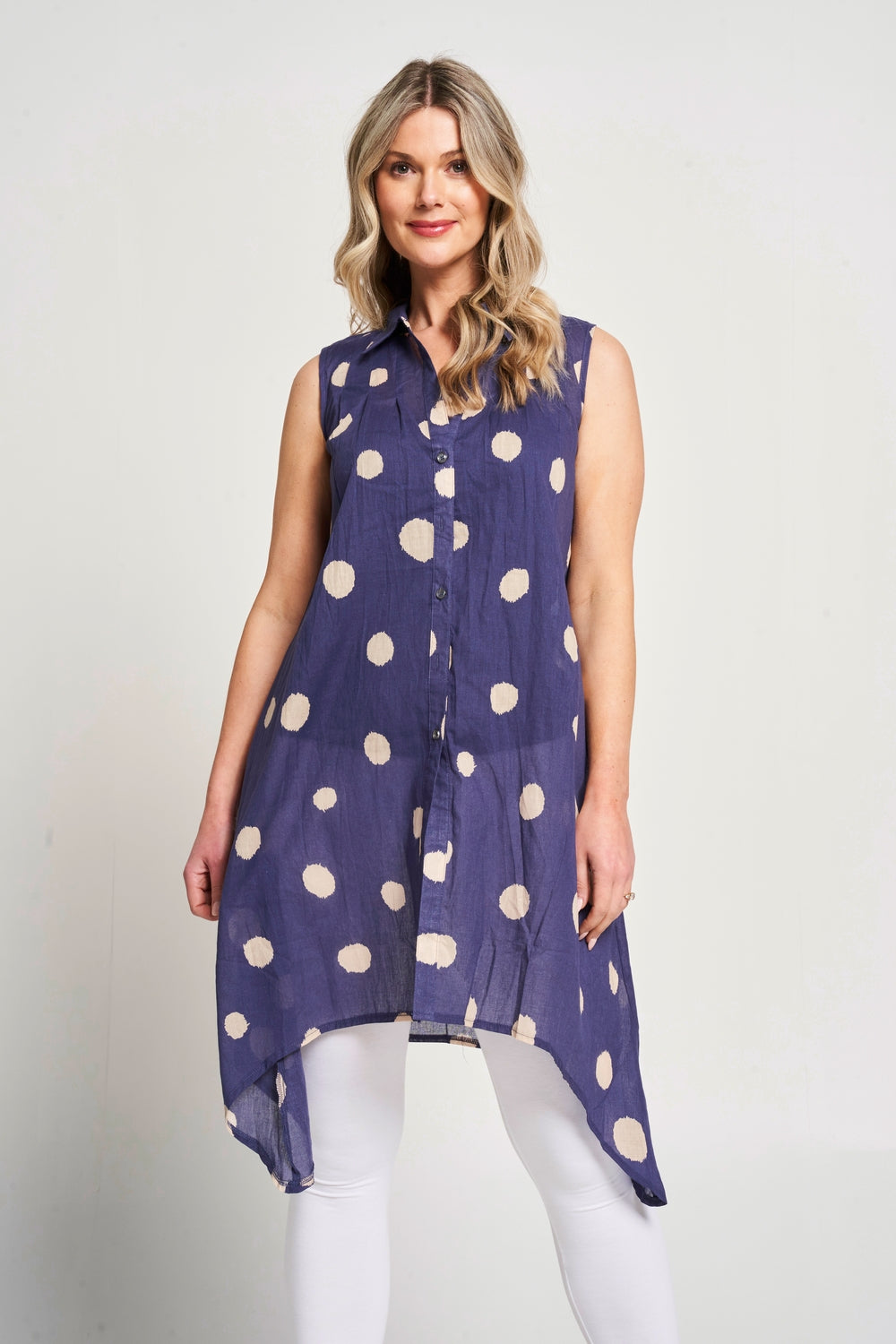 Featuring a dot print, this sleeveless button-up shirt has a drop-corner hemline and a collared neck for a chic summer look. It pairs perfectly with white jeans or leggings and your favourite sandals, making it a stylish and comfortable choice for hot summer days.