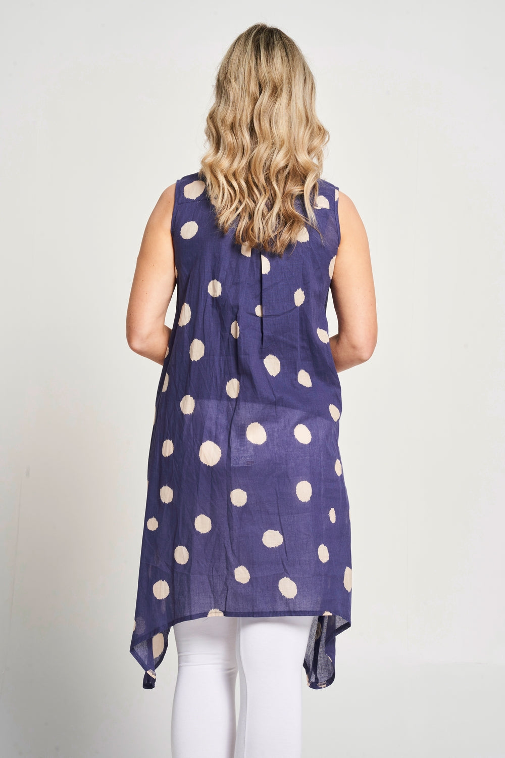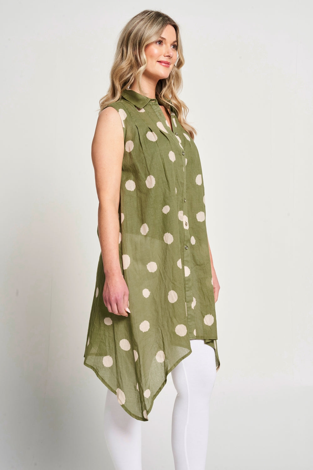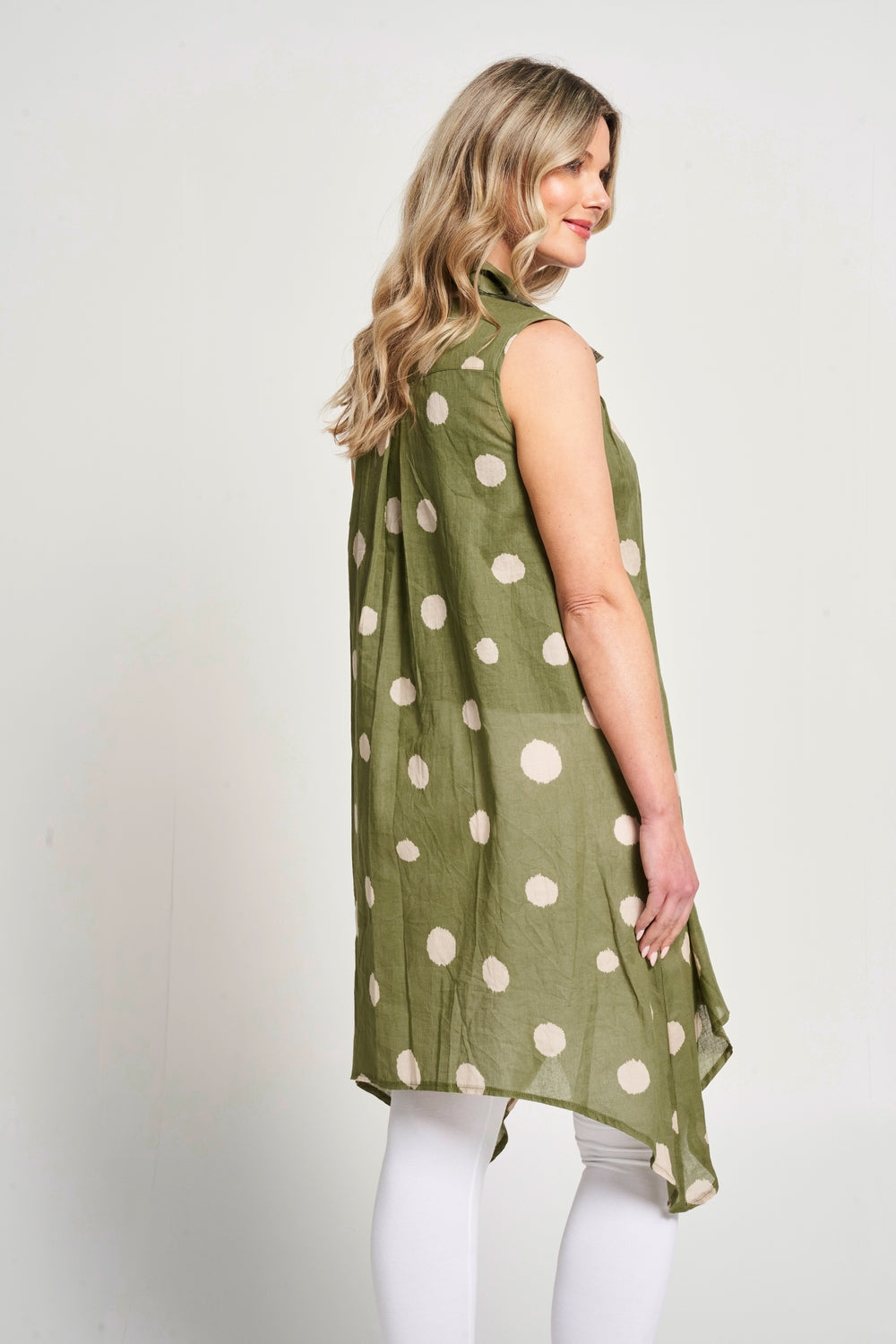 Featuring a dot print, this sleeveless button-up shirt has a drop-corner hemline and a collared neck for a chic summer look. It pairs perfectly with white jeans or leggings and your favourite sandals, making it a stylish and comfortable choice for hot summer days.