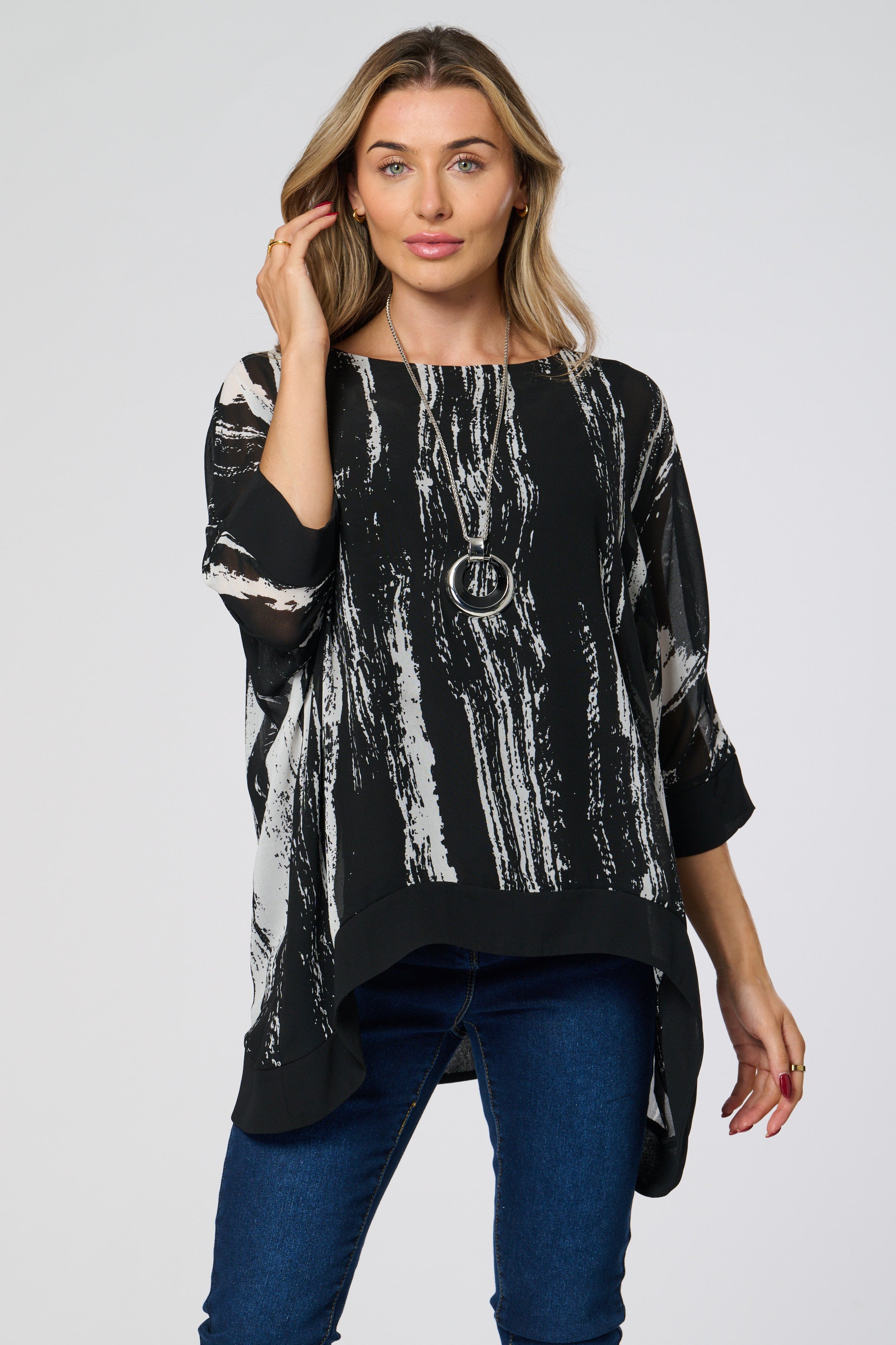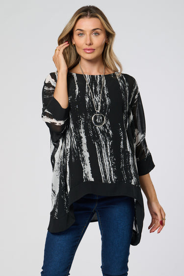 This tunic features a batwing shape for a comfortable and flattering fit. The double layer adds a stylish touch while the plain hem and sleeve bands create a clean and polished look. The boat neck and side dipped hem add unique details to this 3/4 sleeve tunic. Accessorize with the included necklace* for a complete outfit.