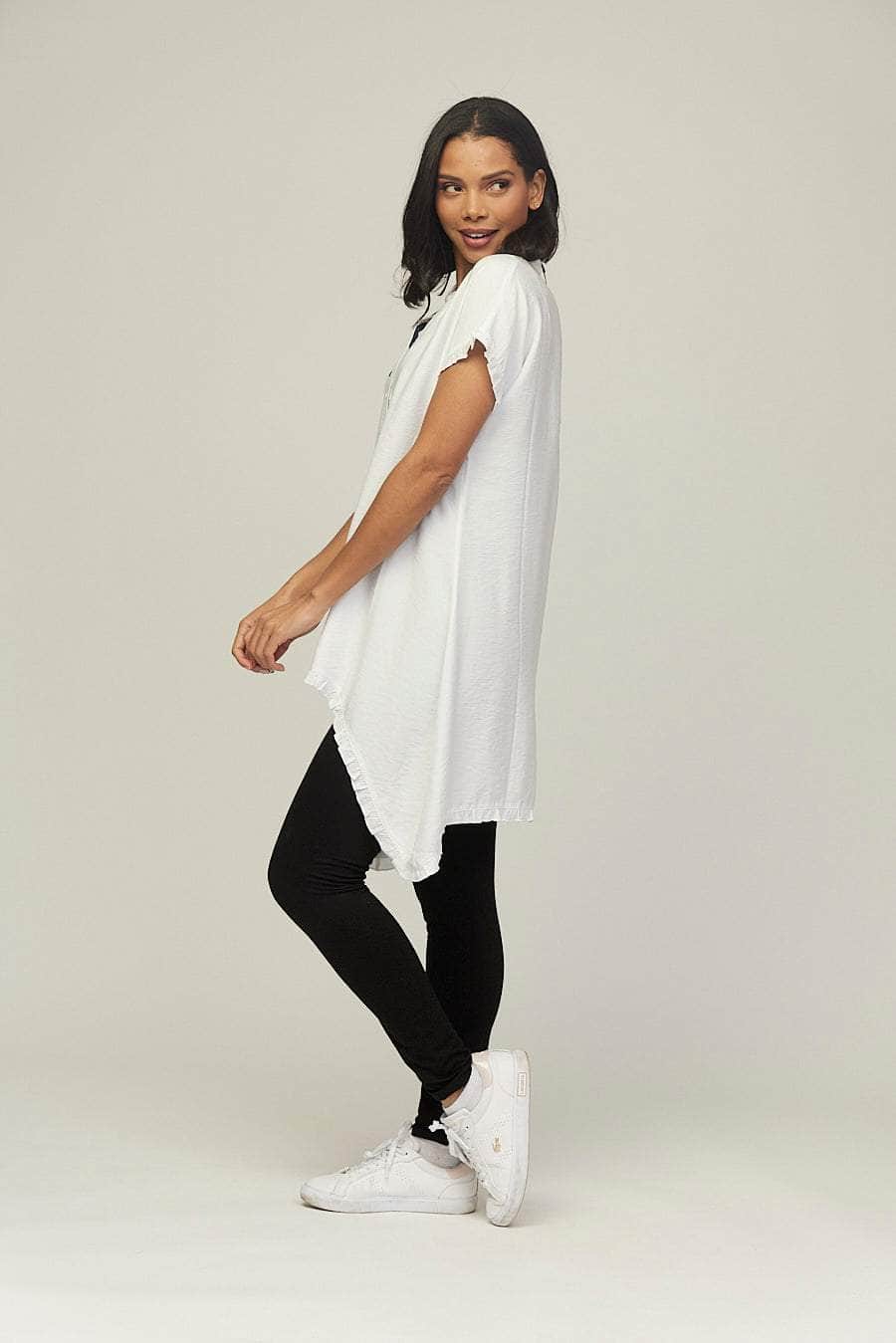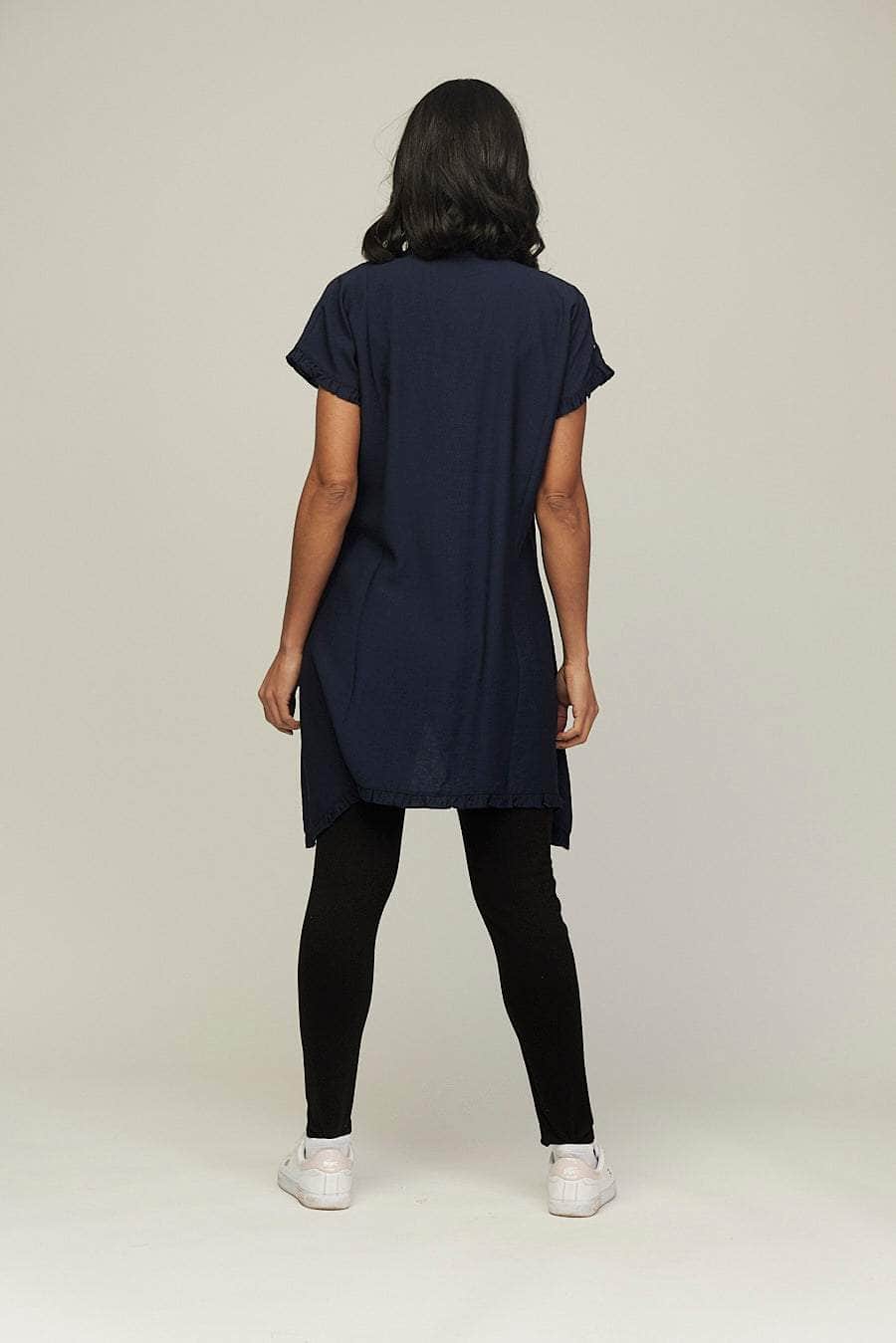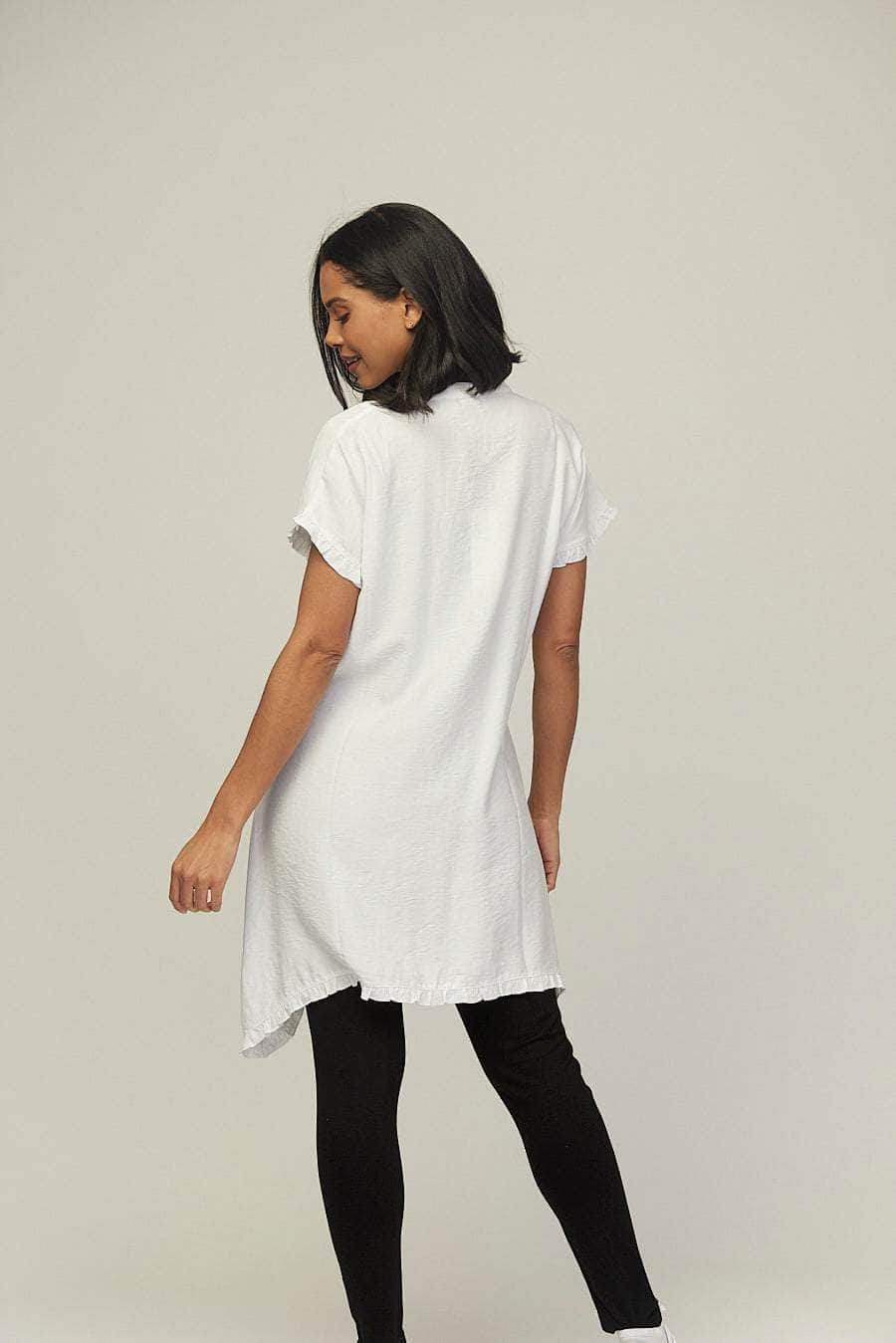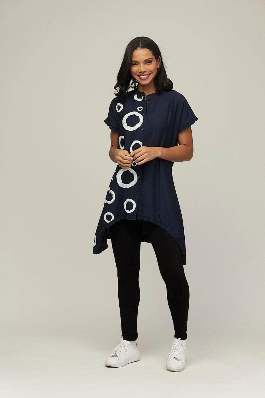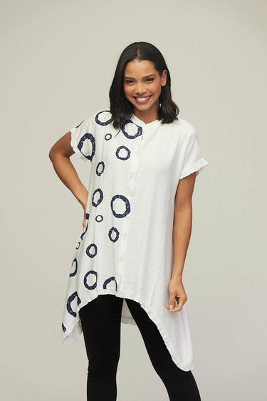 This long shirt is perfect for stylish and comfortable everyday wear. Crafted from high-quality materials, it features one-sided circular printing, a flattering frilled elliptical hem and front button through closure. The stand-up collar adds an elegant touch, while the longer back and side hems provides a great fit.