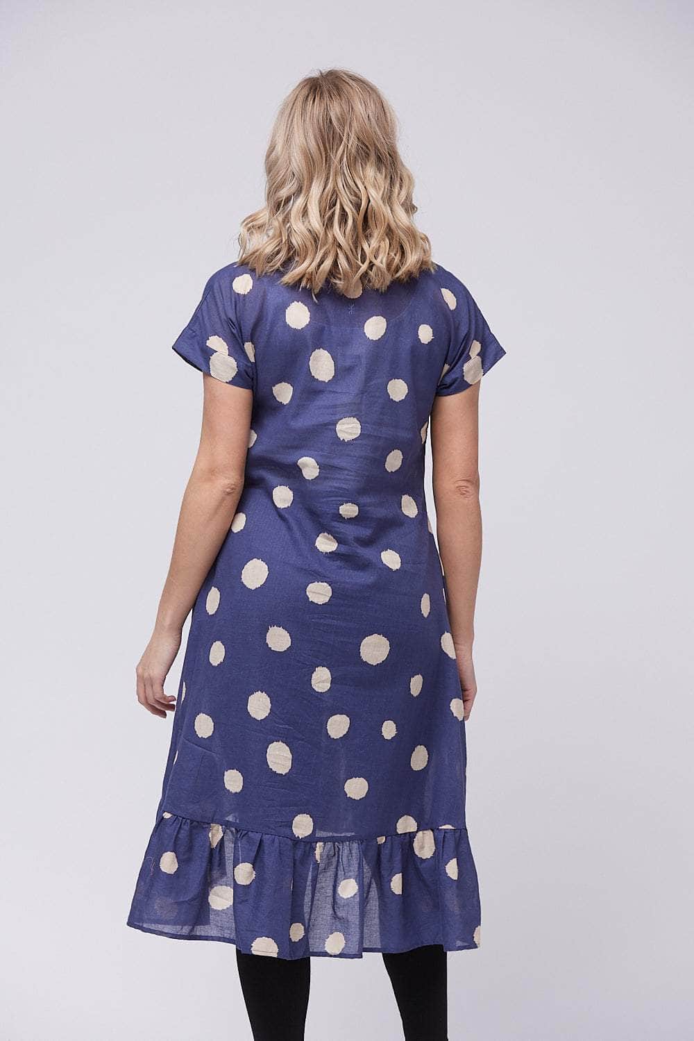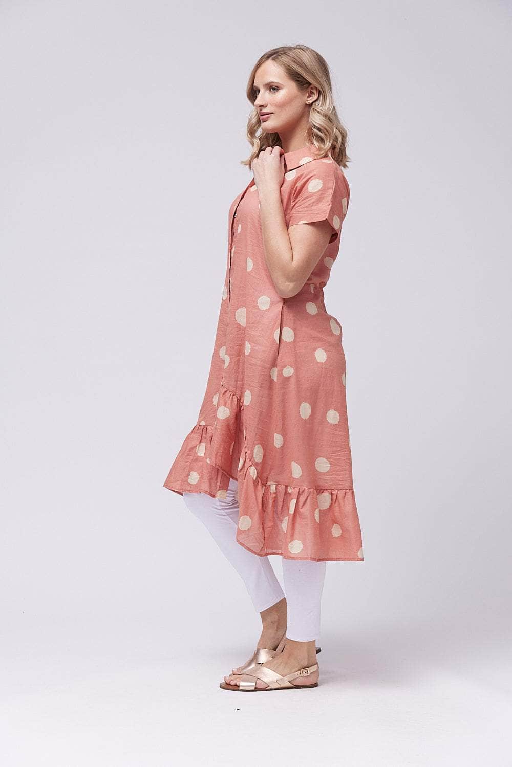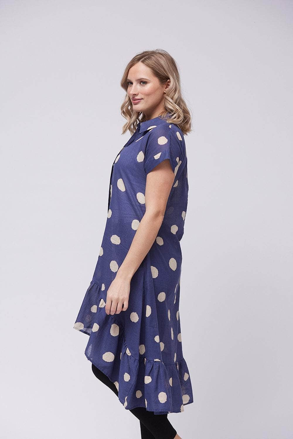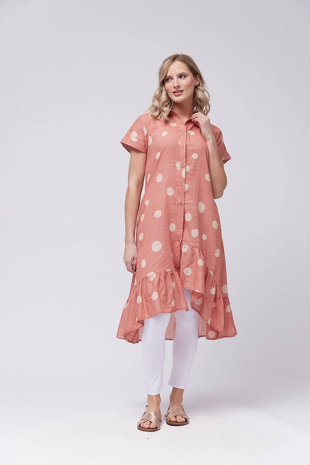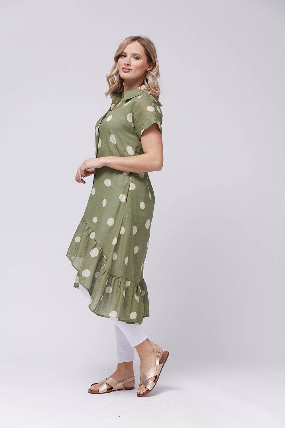 Introducing Saloos Uneven Front Dress—your perfect choice for effortless style. Featuring an uneven front, a frilled hem and front button closure, you'll look chic and on-trend. The extended shoulder short sleeves and side pockets offer practicality, while the classic polka print gives you eye-catching flair.
