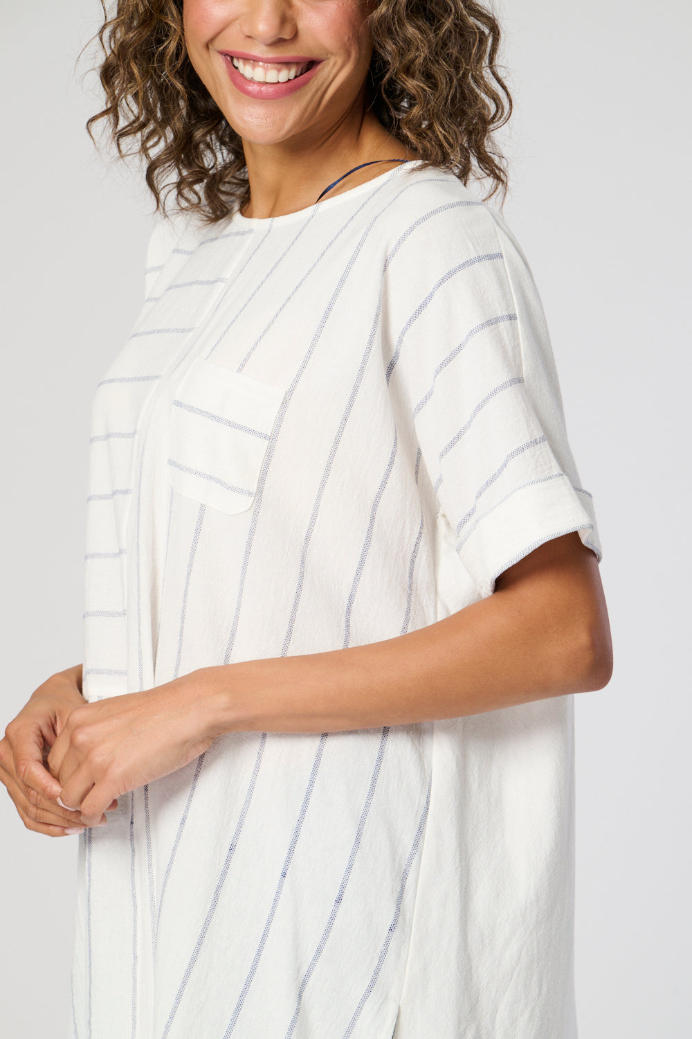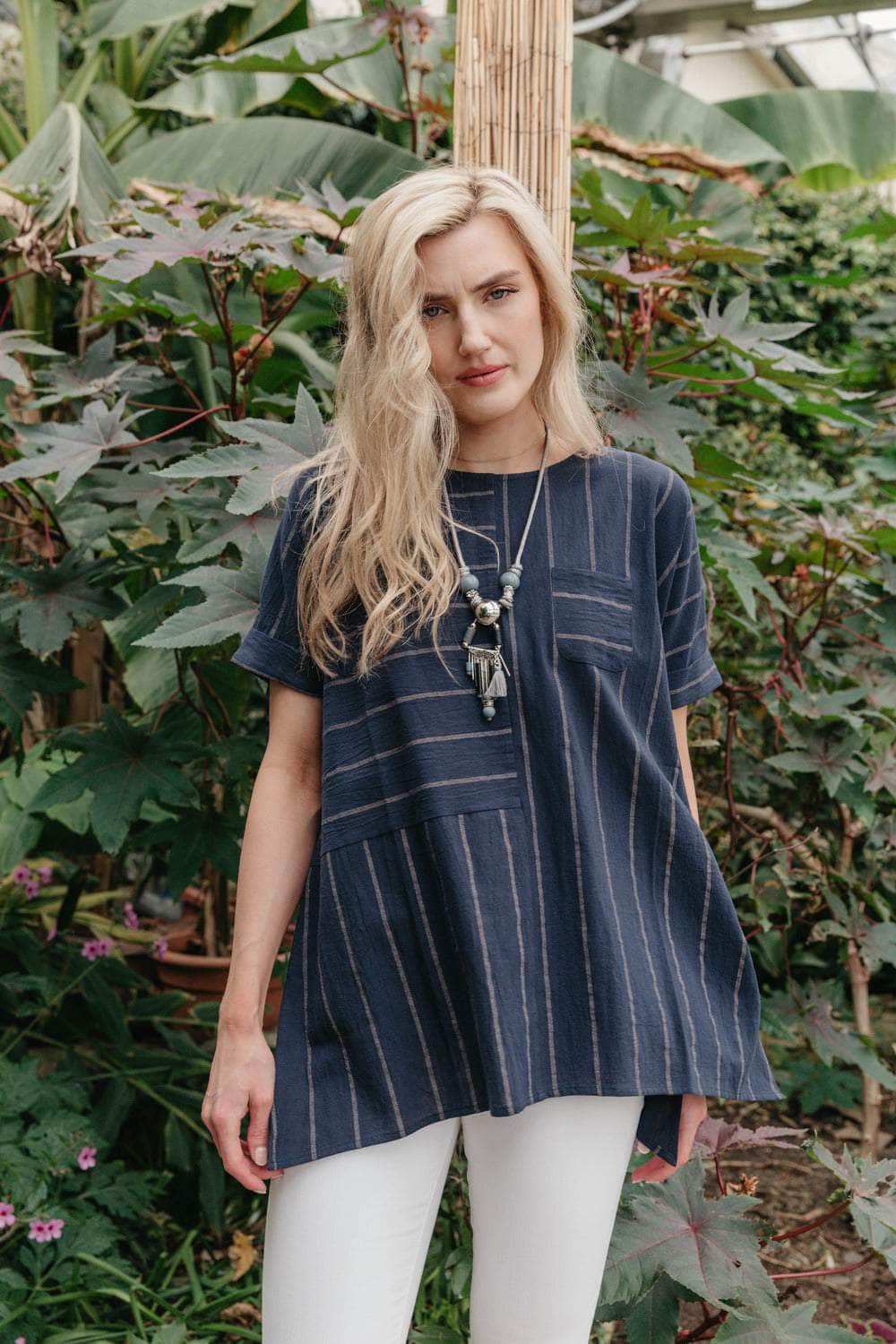 This top offers a sophisticated style for any setting. Boasting a panelled design with a front pocket, side dipped hems, and a side slit for ease of wear, this striped 100% cotton top is a versatile choice. Enhanced with a matching necklace*, this top brings a hint of luxury to your look.