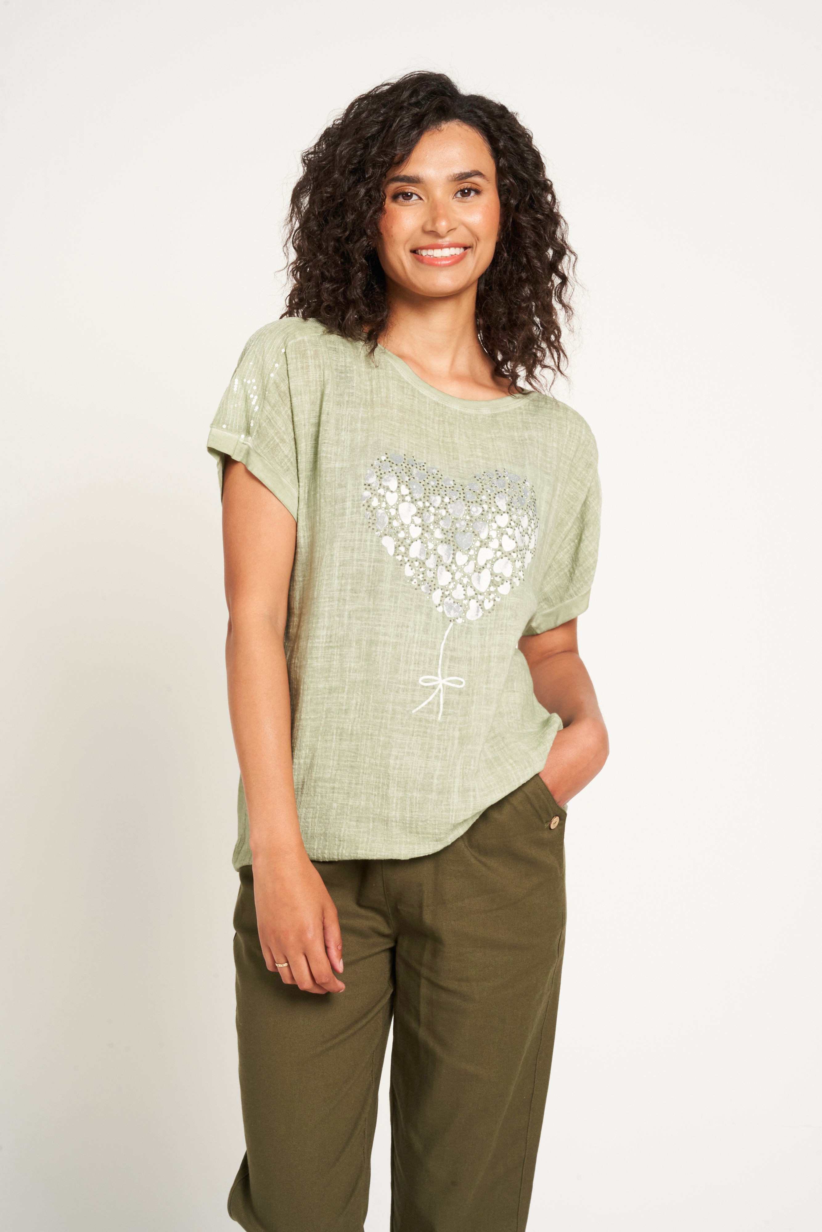 Add a touch of fun to your wardrobe with this short sleeve top! Featuring a heart balloon motif on the front and sequin embellished shoulders, this top will make you stand out. The round neckline adds a touch of elegance to this playful piece. Feel confident and stylish in our top!