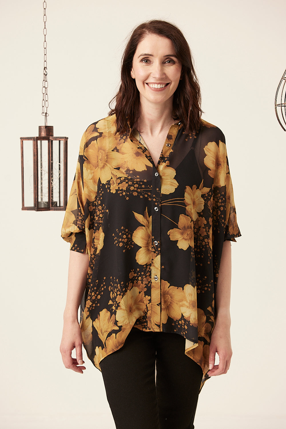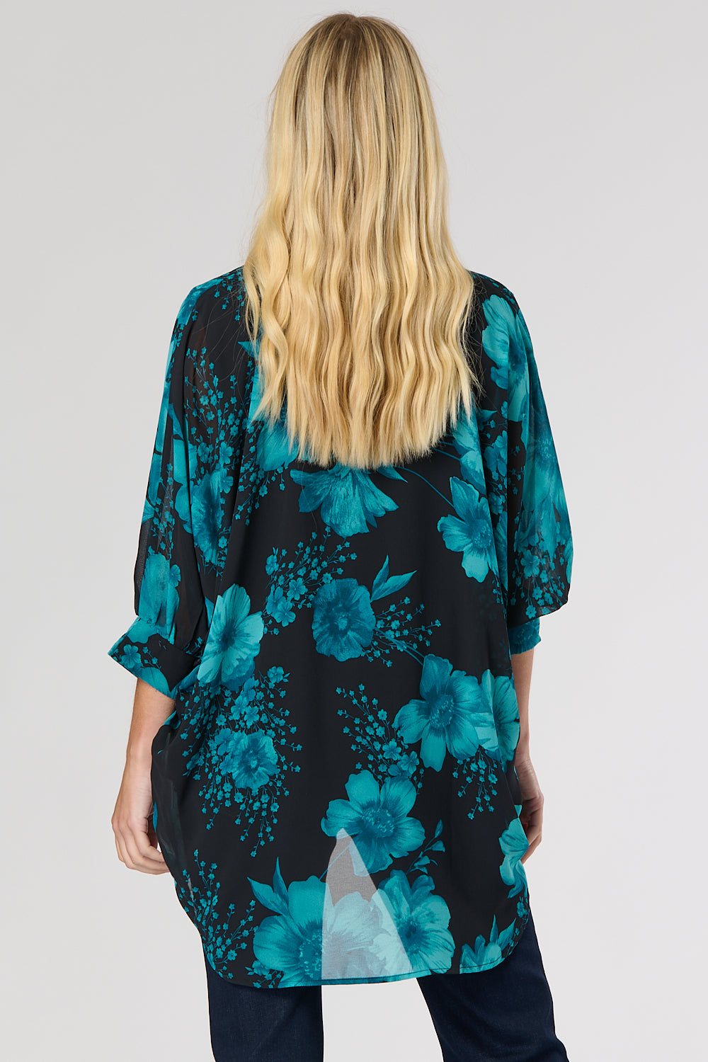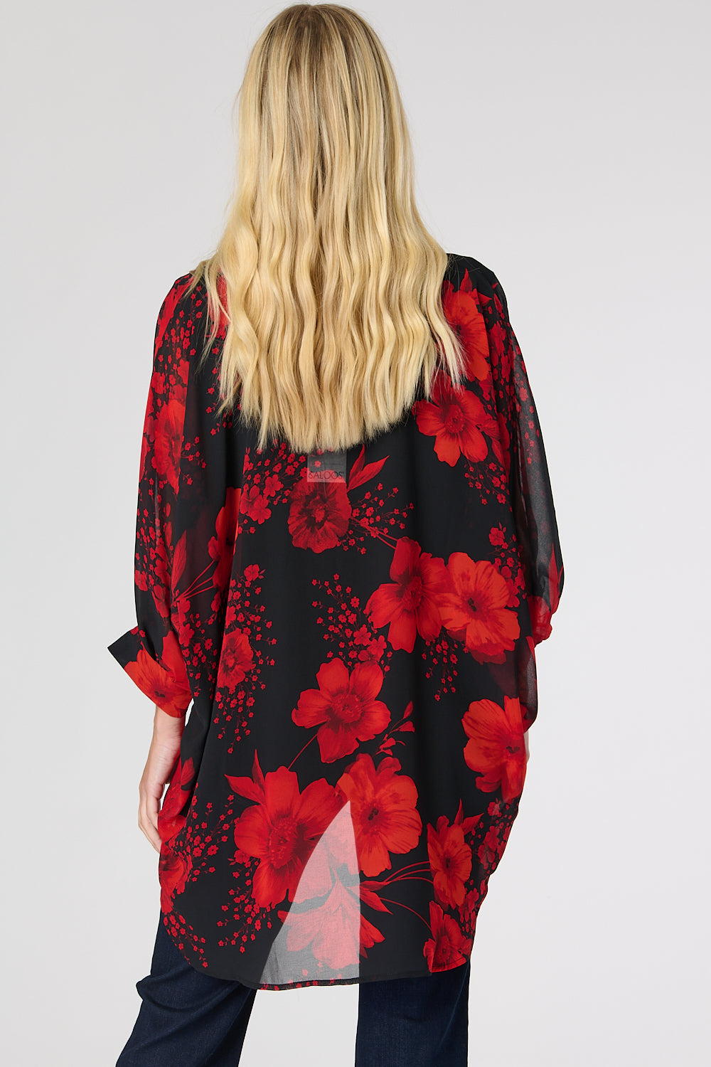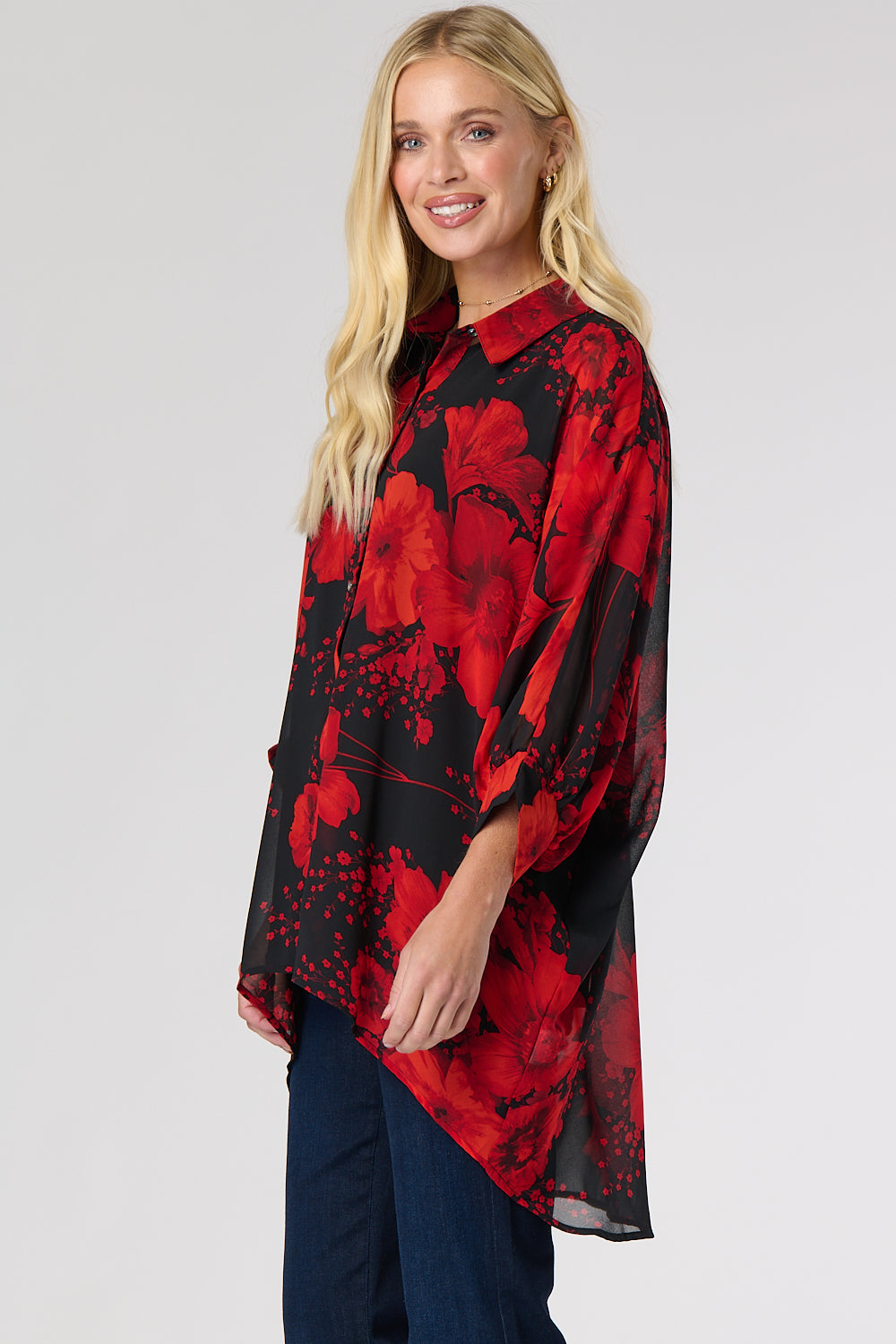 This classic blouse features an oversized poncho shape and is made from sheer, lightweight fabric in flowery print. It has fixed, gathered cuff details, a front button closure and a hi-low hemline – perfect for creating a layered look.