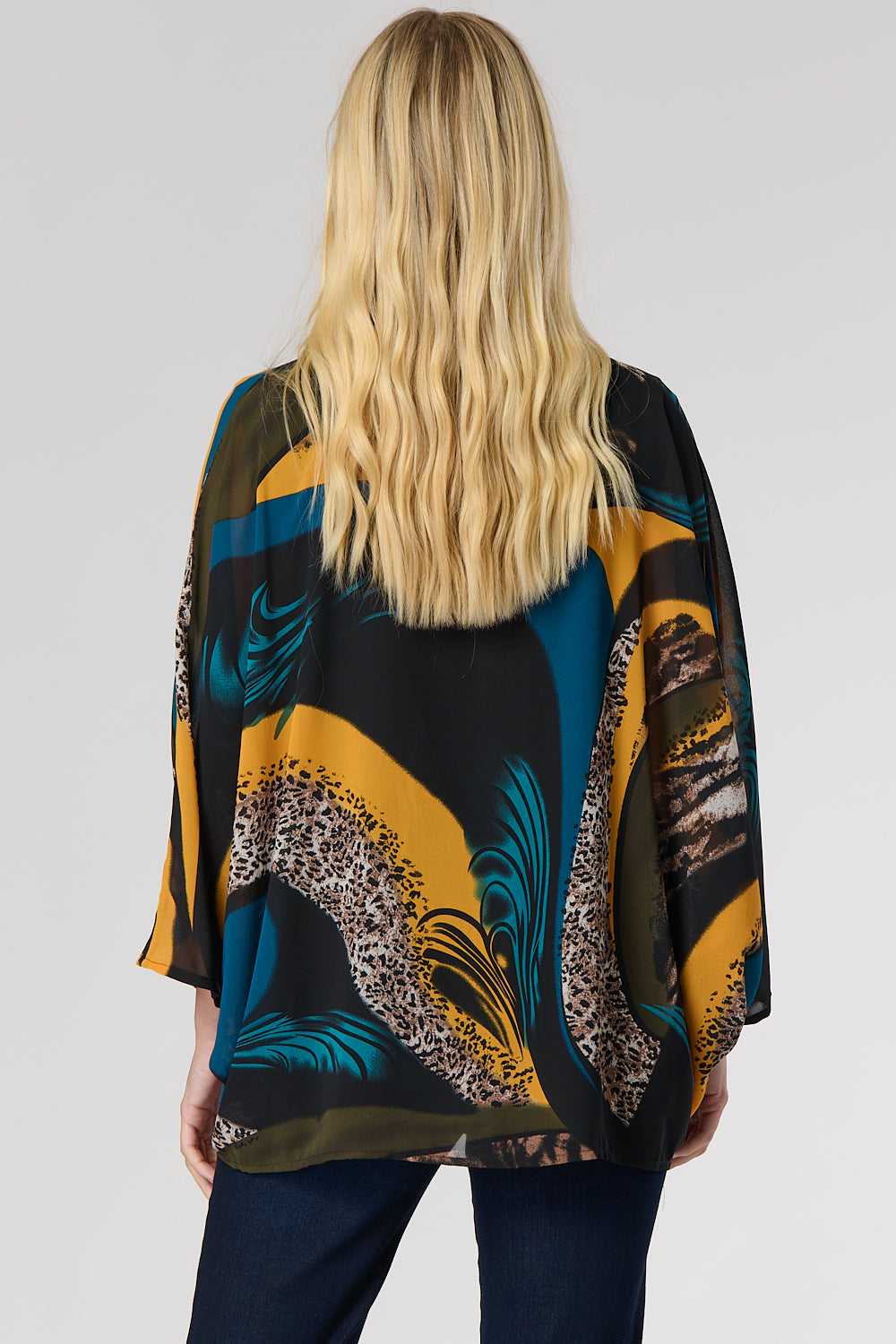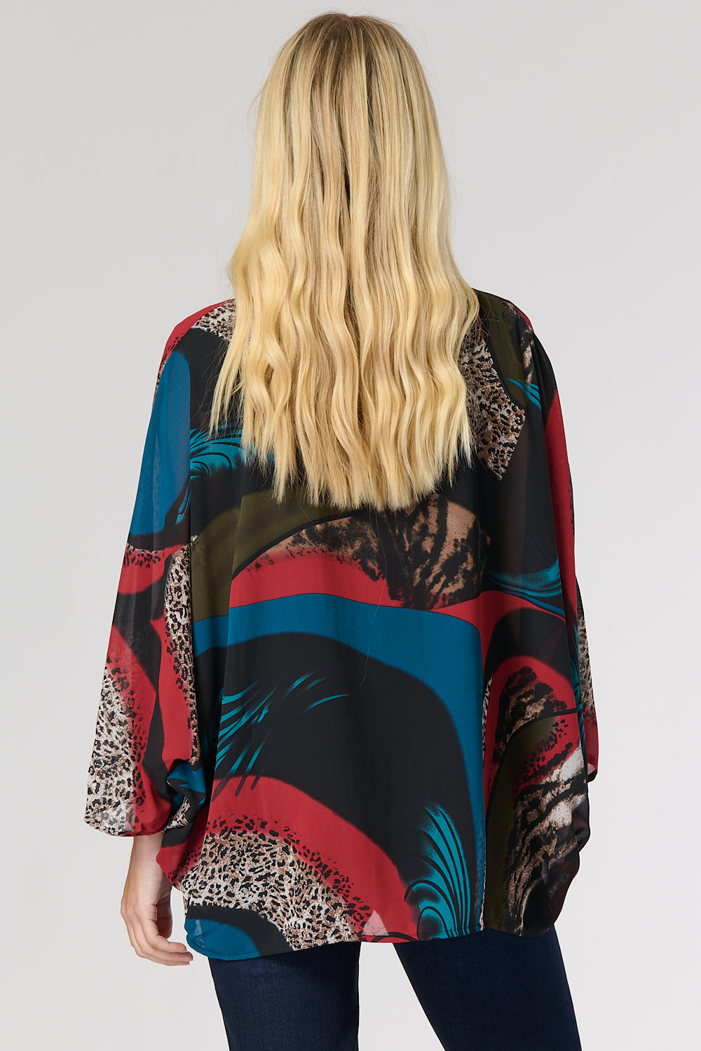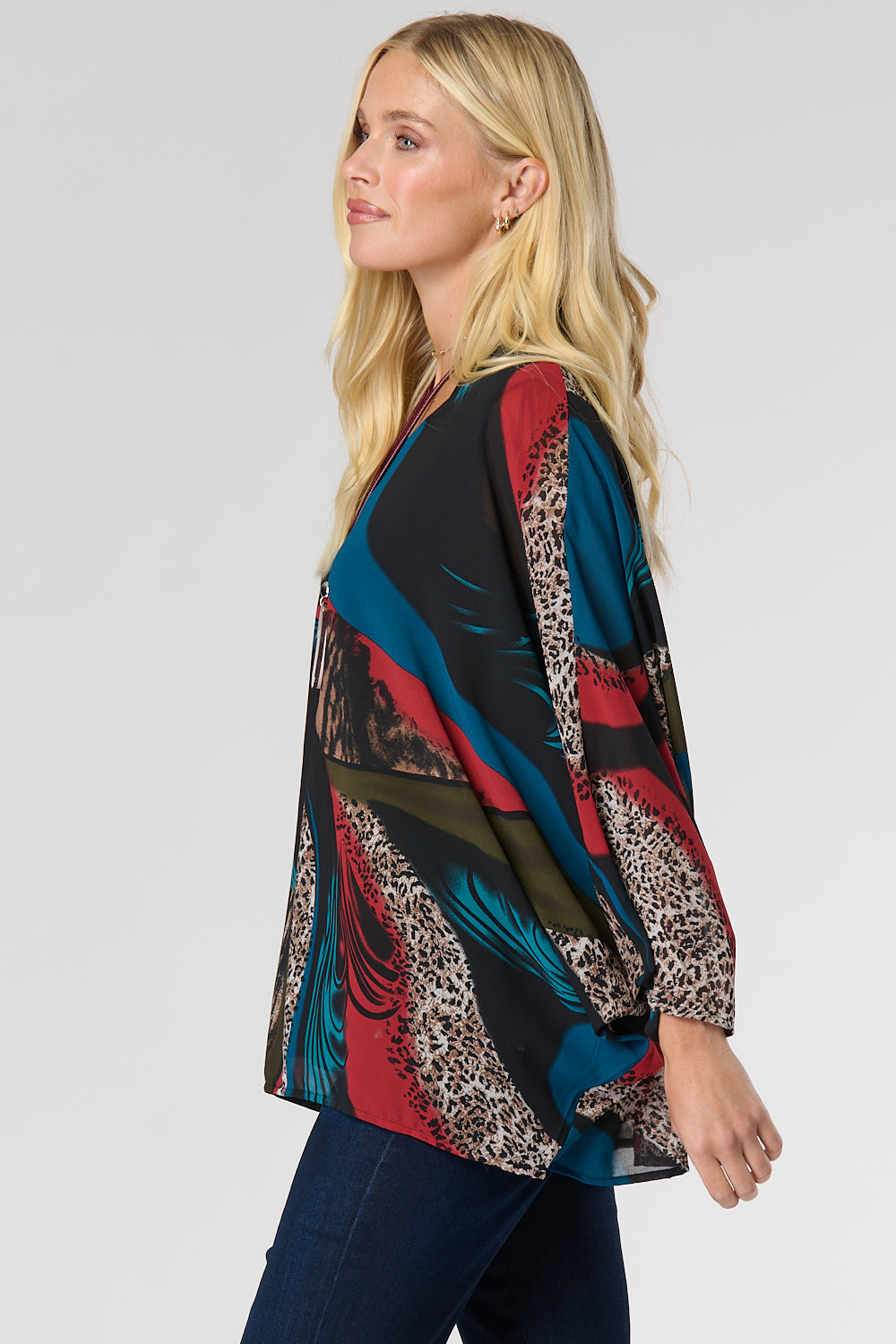 Stay stylish and cozy with this top. Its batwing shape, inner vest, and V-neck make this piece comfortable and fashion-forward. The abstract animal print adds a fun touch to the overall look. Complementary necklace* included.