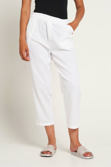 Stay comfortable and stylish in our crop trousers! With an elasticated waist, angled front pockets with buttons, and belt loops for accessorizing, these trousers are both practical and chic. Upgrade your wardrobe with these versatile trousers today!