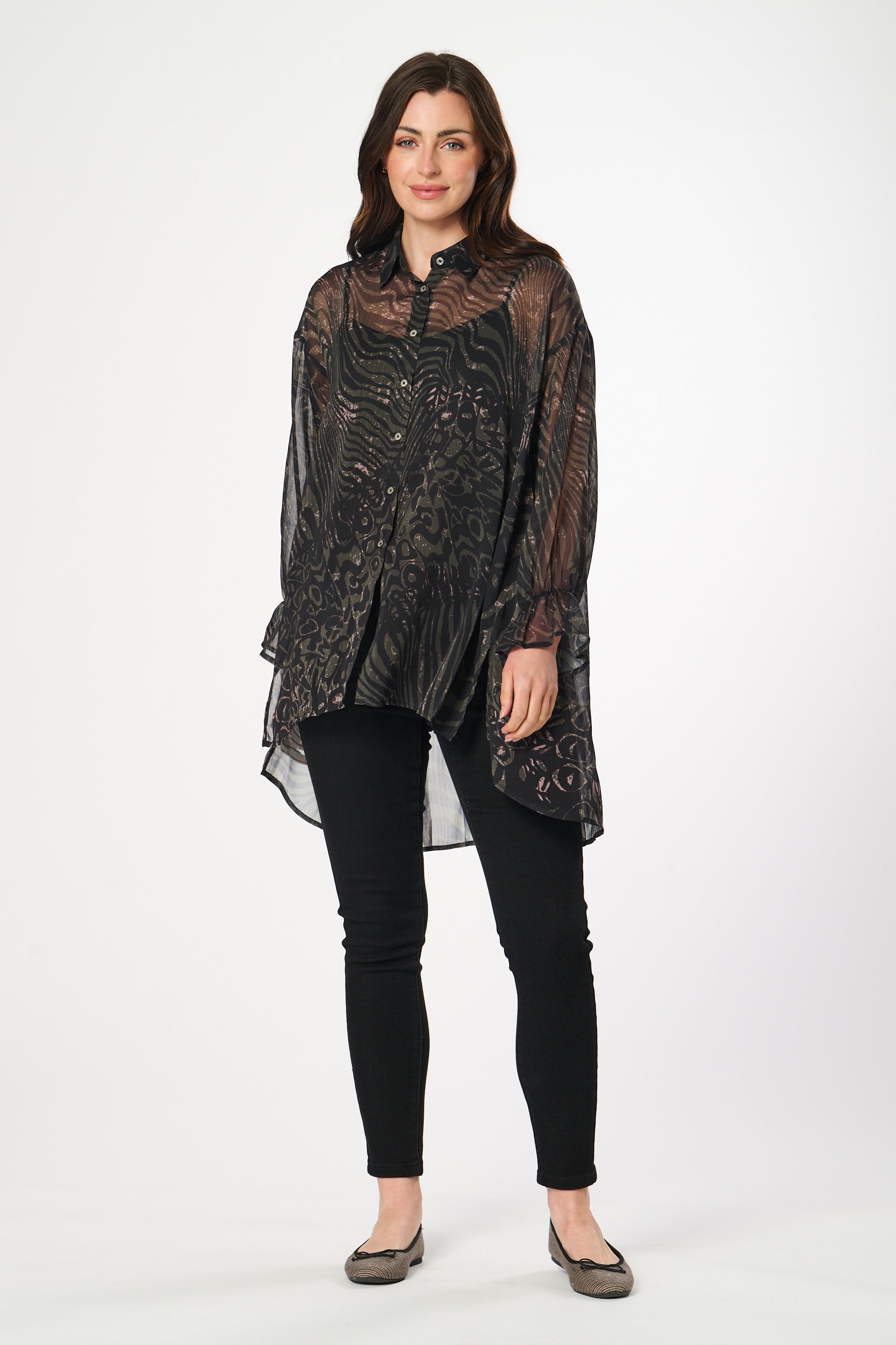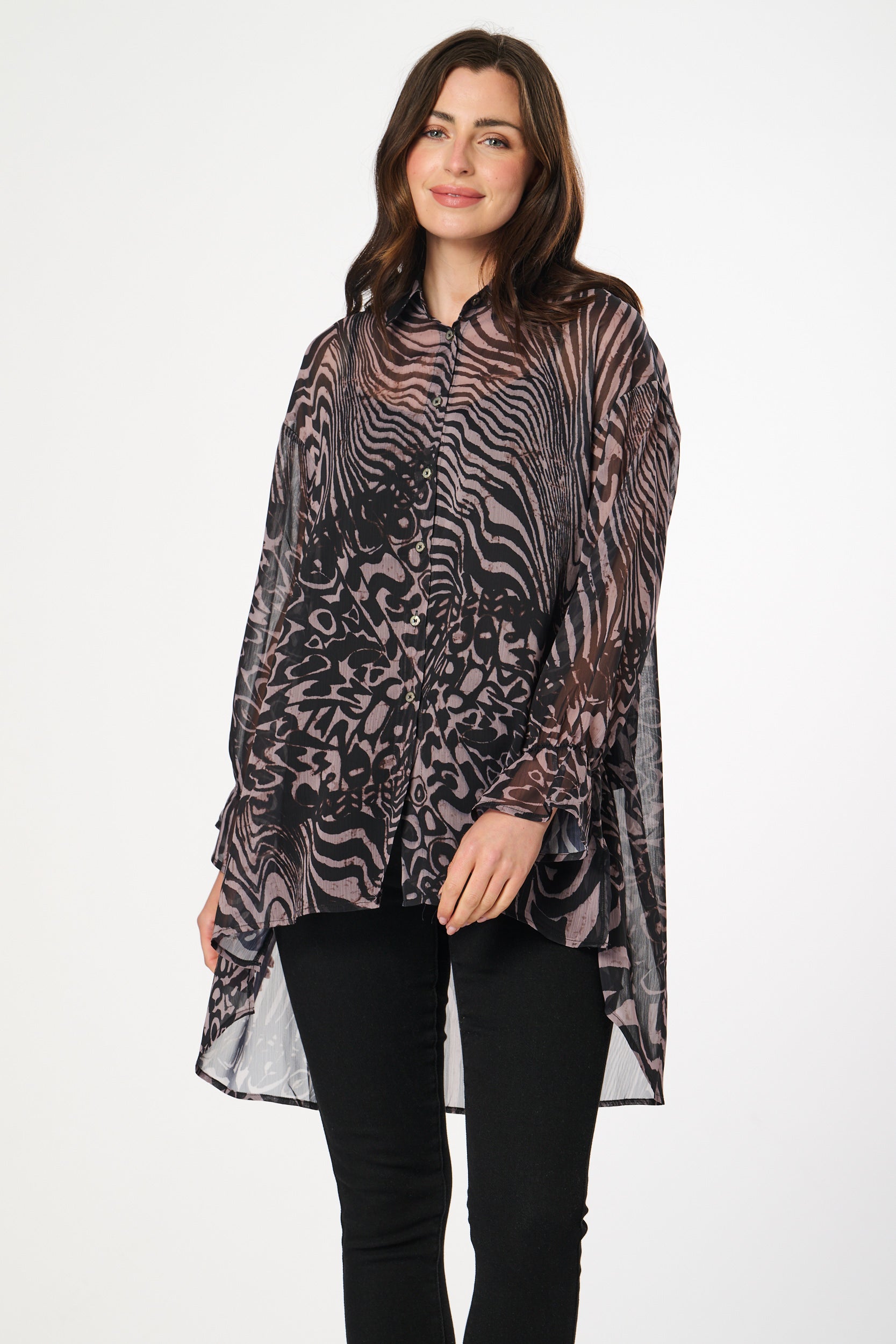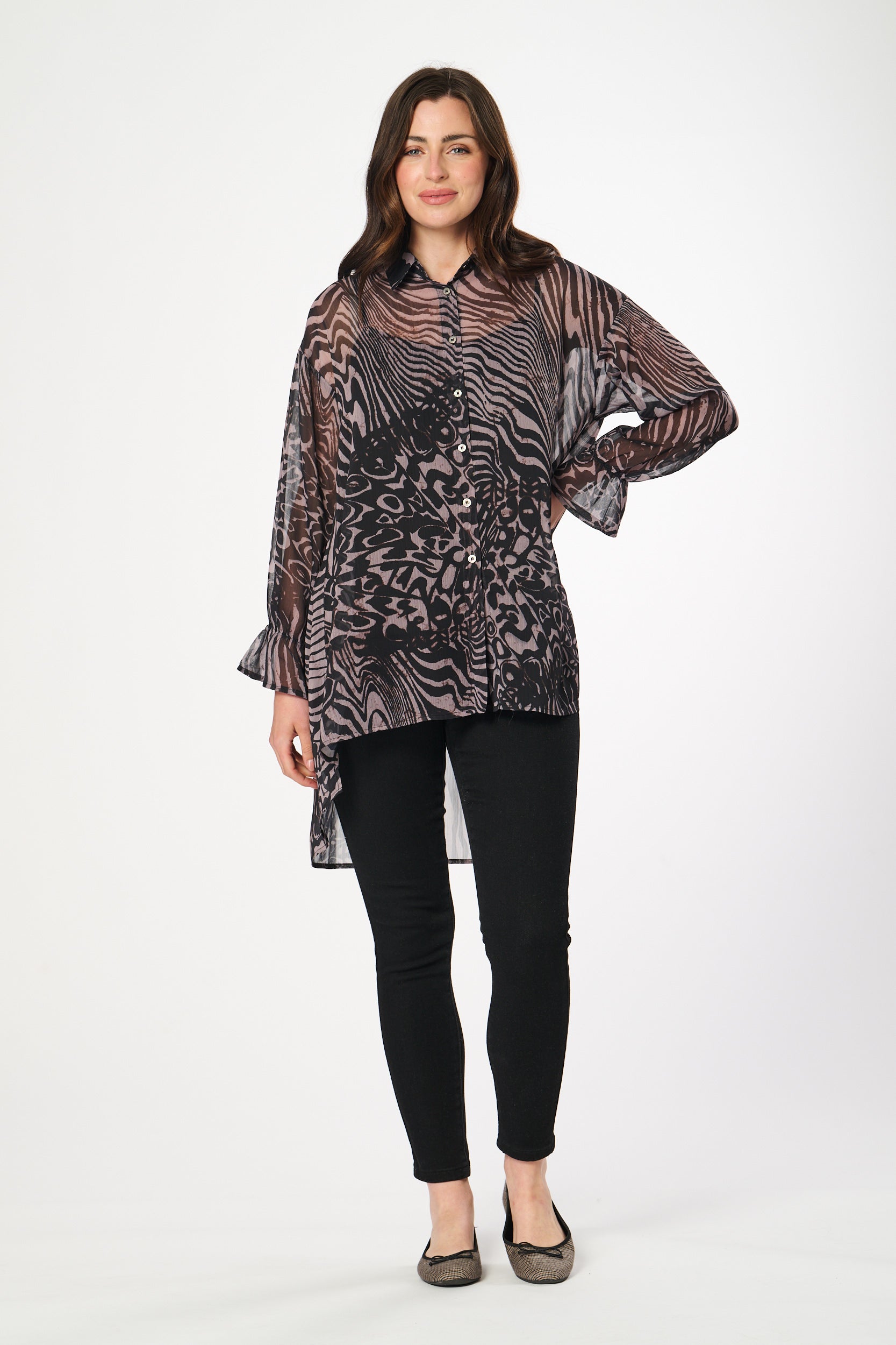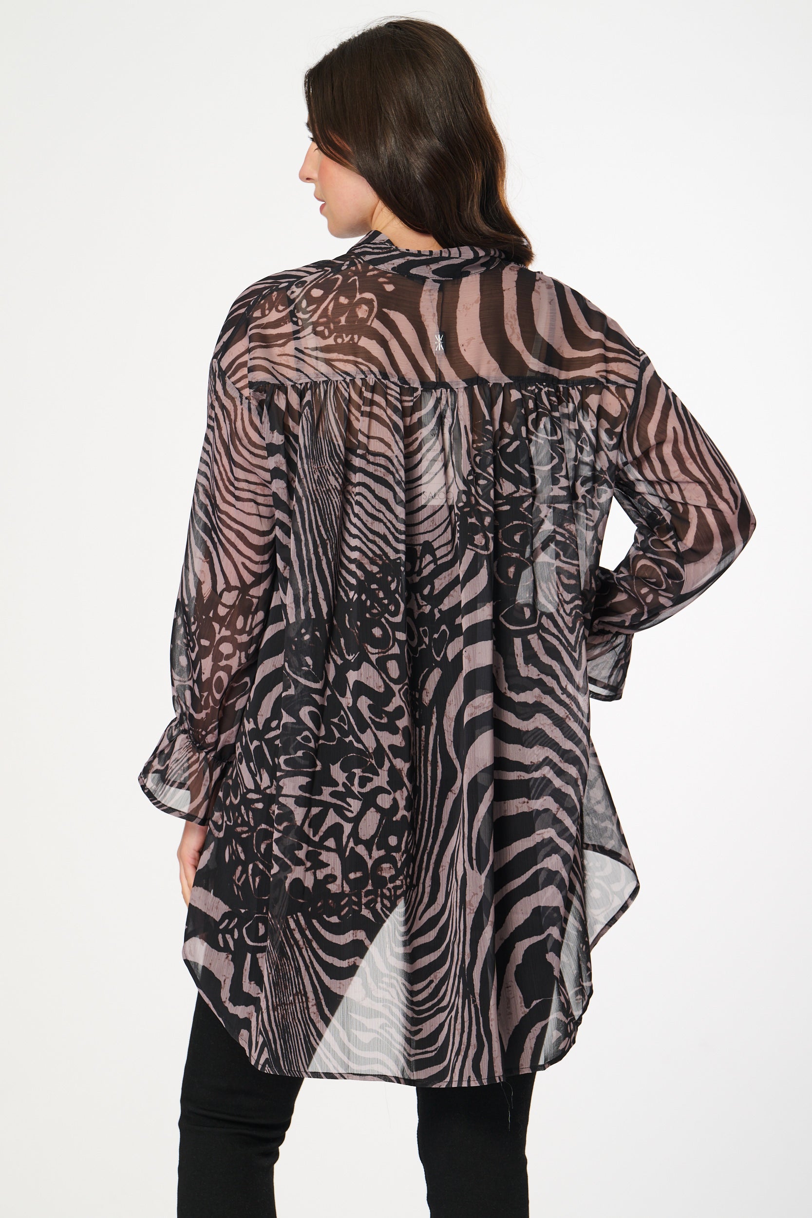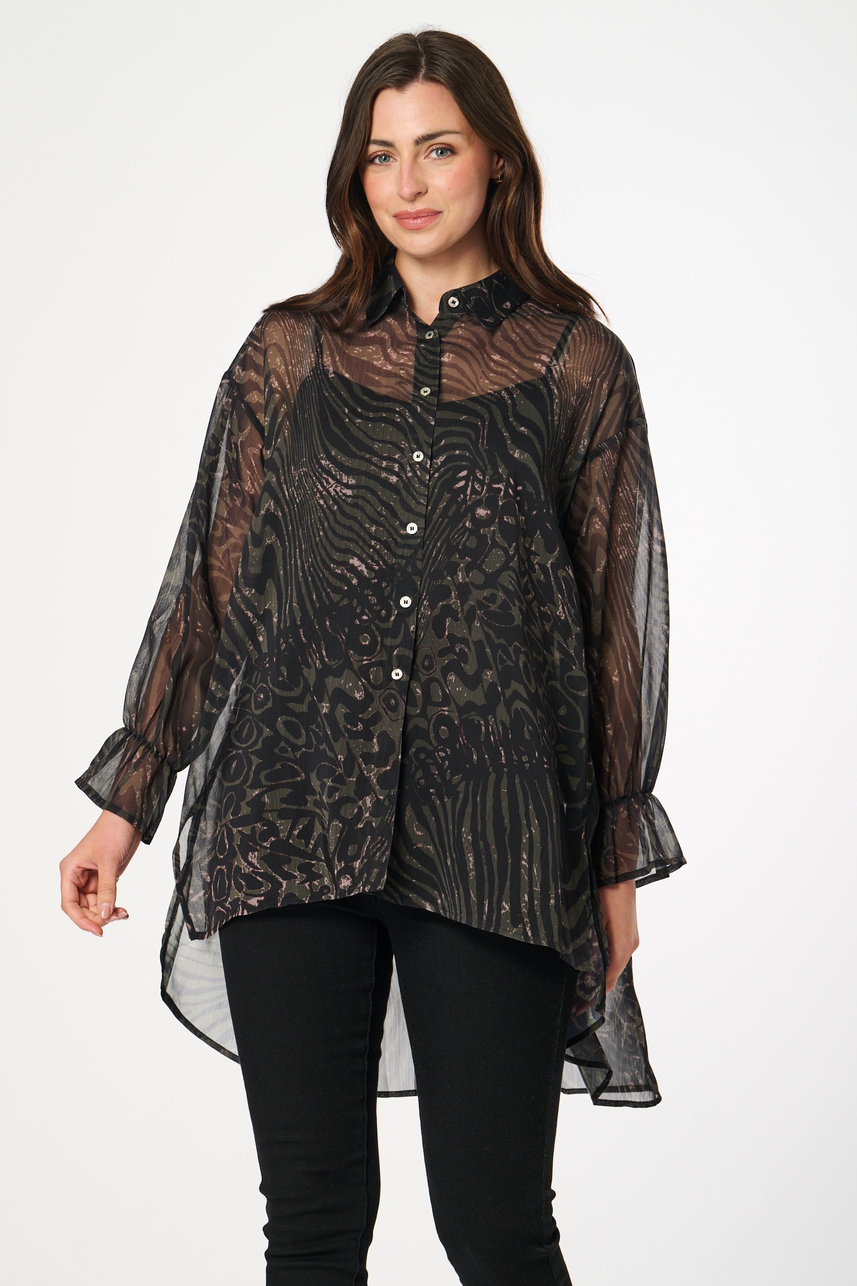 A versatile 2-in-1 dip back blouse with a plain inner vest for added comfort. With long, elasticated sleeves and a front button closure, perfect for any occasion. Made of sheer chiffon style fabric, it adds a touch of elegance to your wardrobe.