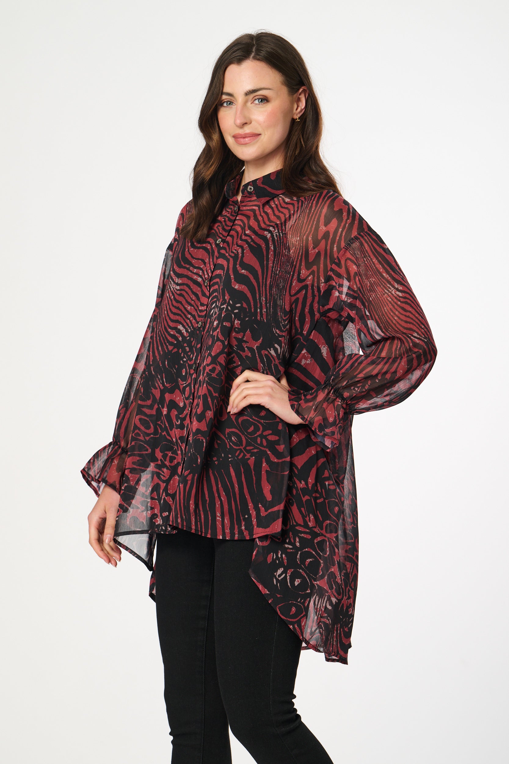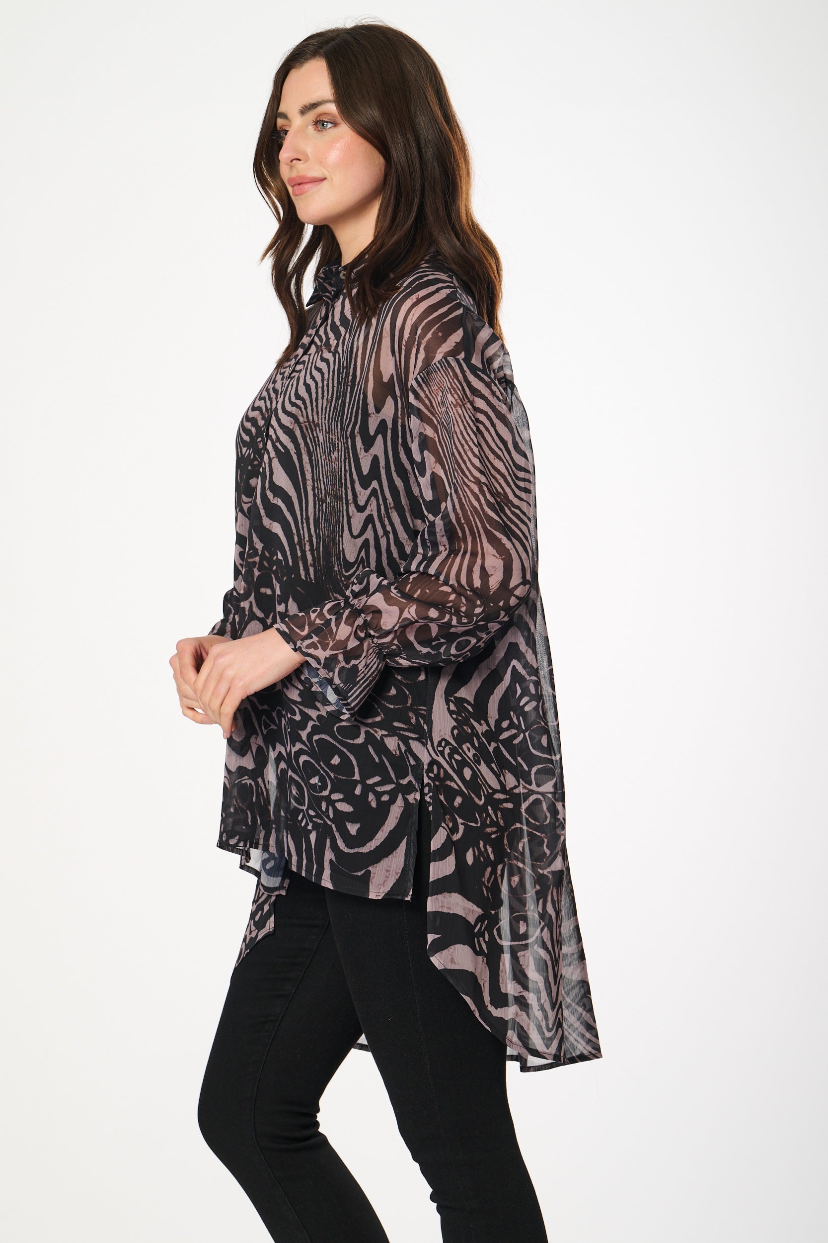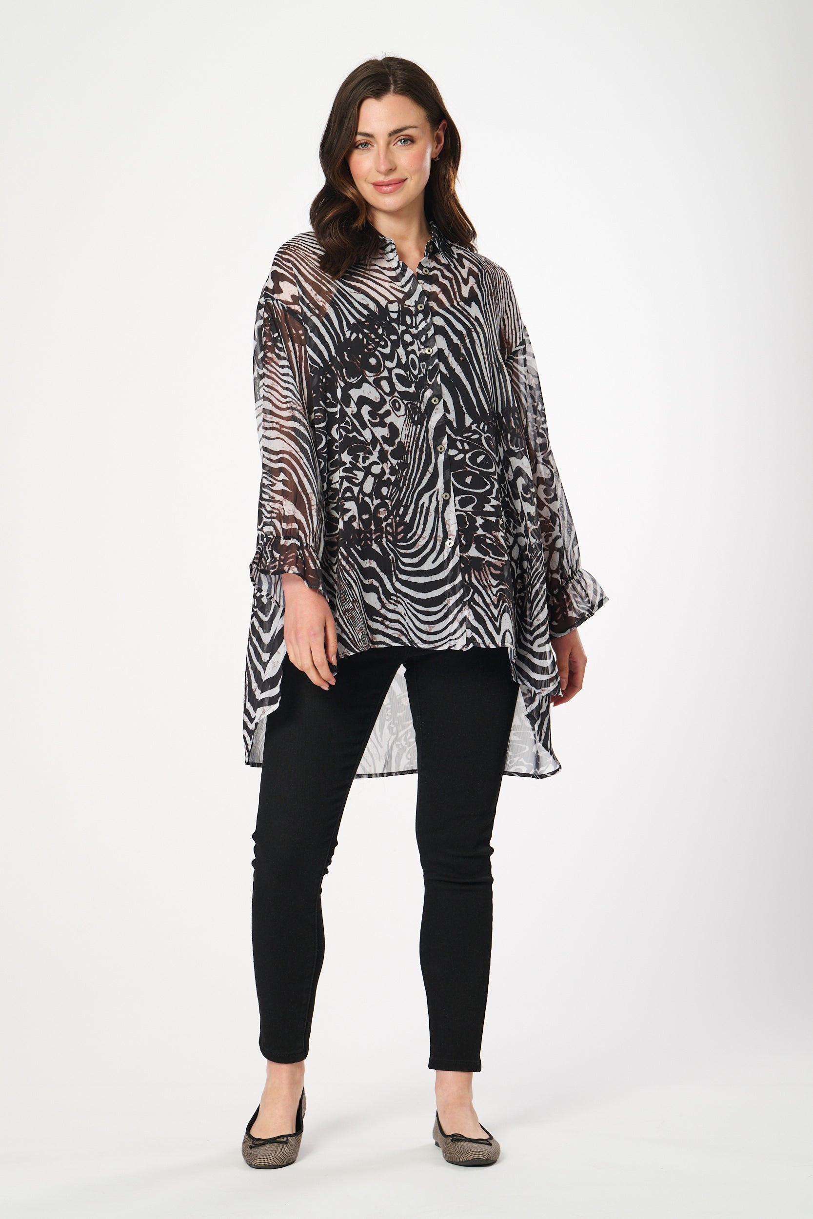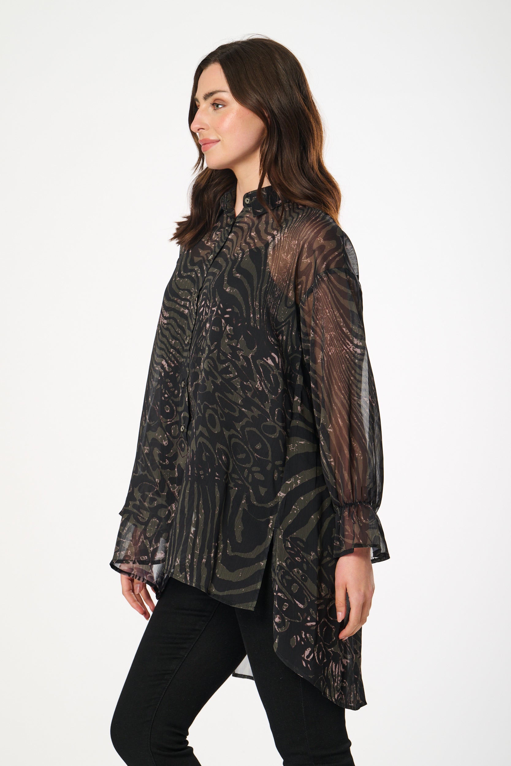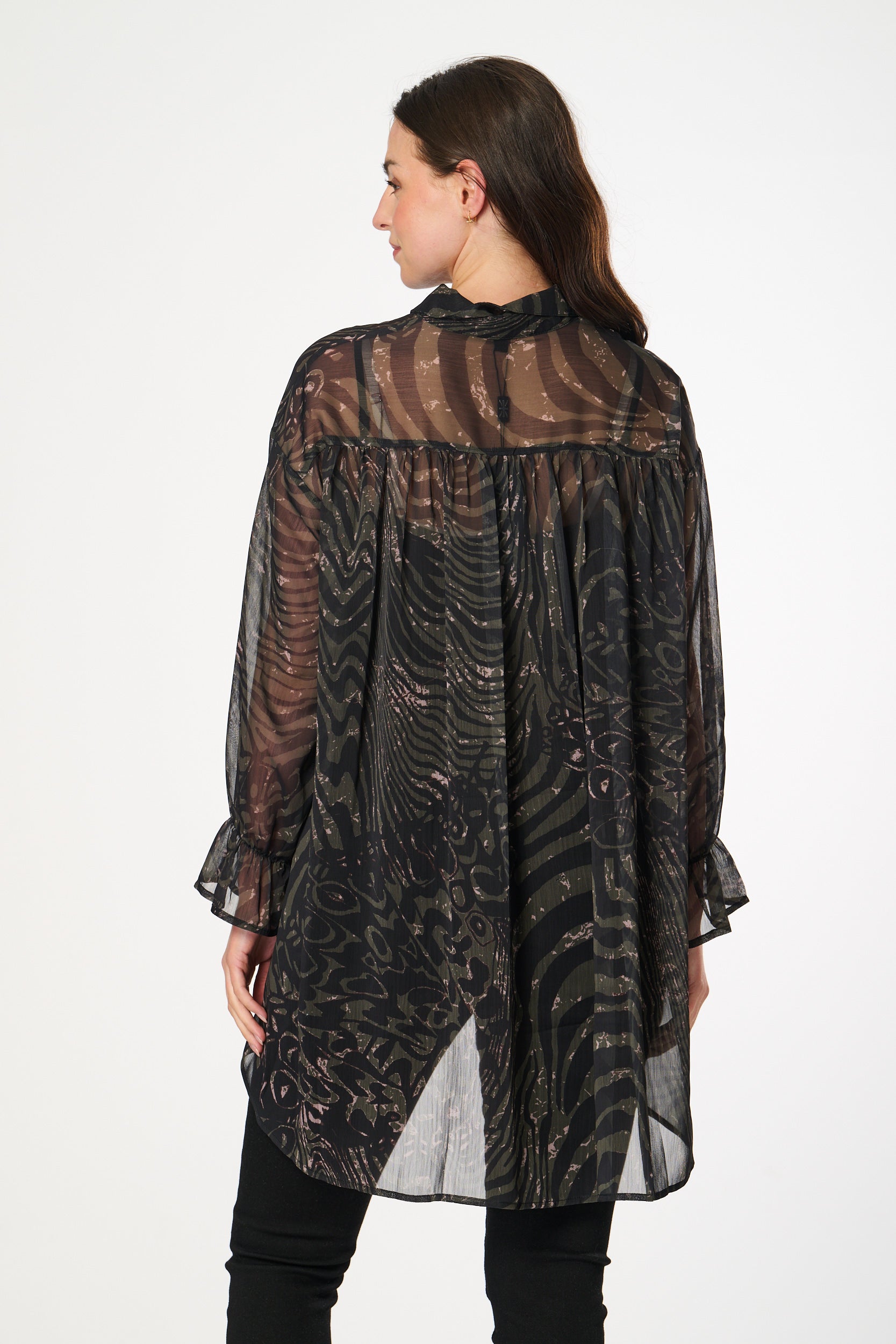 A versatile 2-in-1 dip back blouse with a plain inner vest for added comfort. With long, elasticated sleeves and a front button closure, perfect for any occasion. Made of sheer chiffon style fabric, it adds a touch of elegance to your wardrobe.
