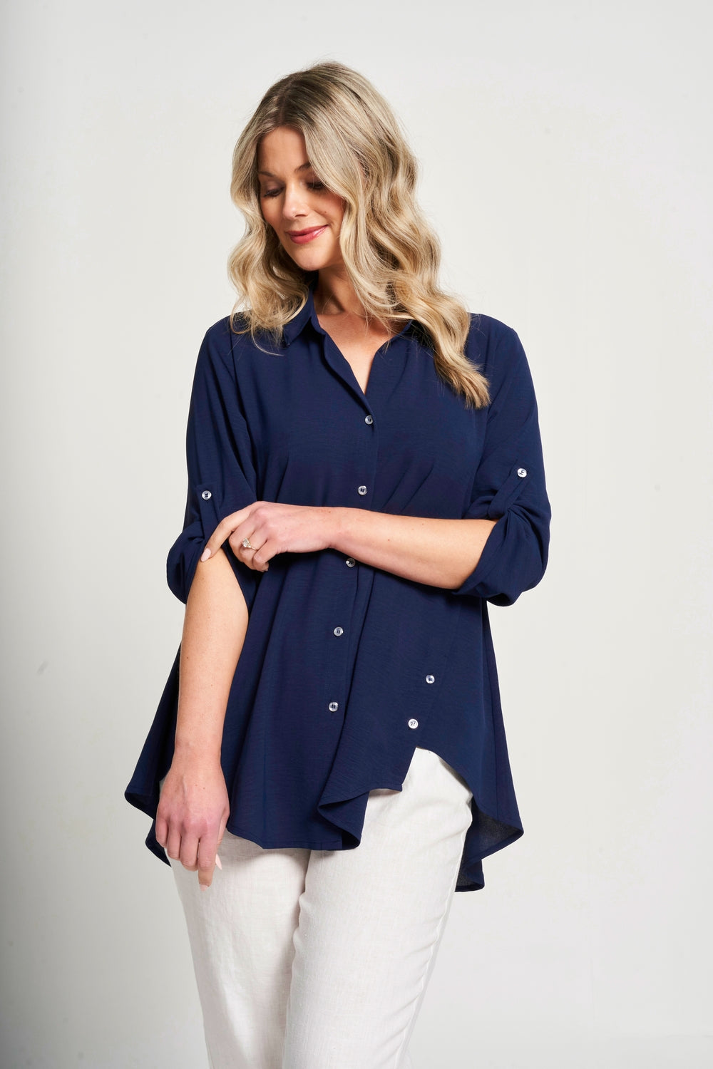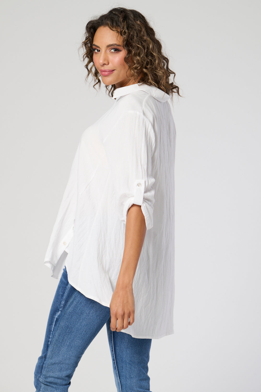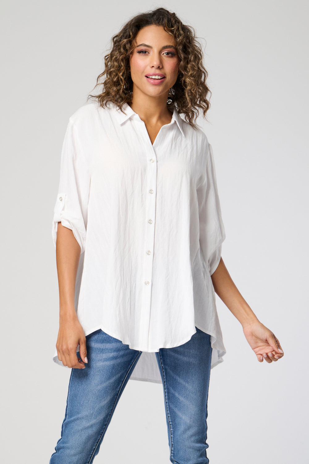 Transport yourself to a world of effortless elegance with our swing shirt. The roched sleeves add a touch of sophistication, while the front hem button detail and front button closure exude luxury. The dipped back adds a subtle yet alluring twist. Elevate your style with this exclusive piece.