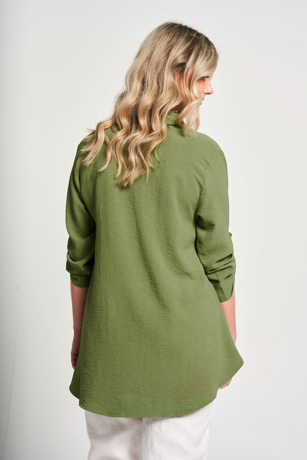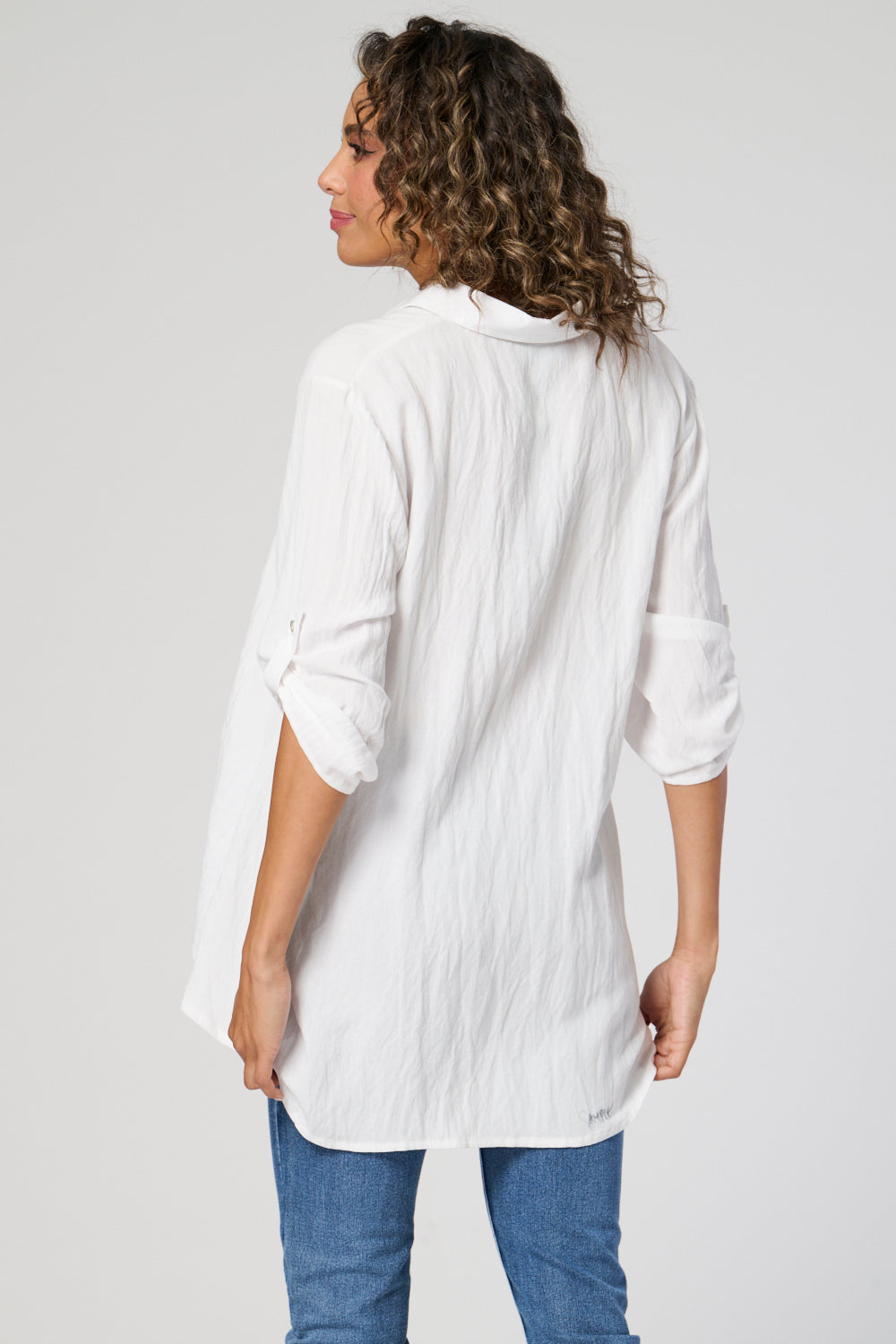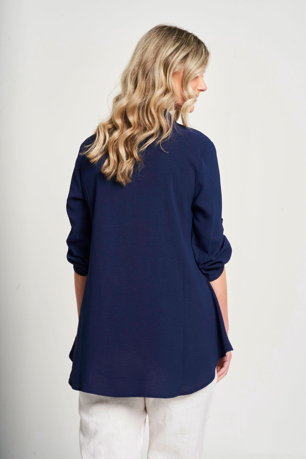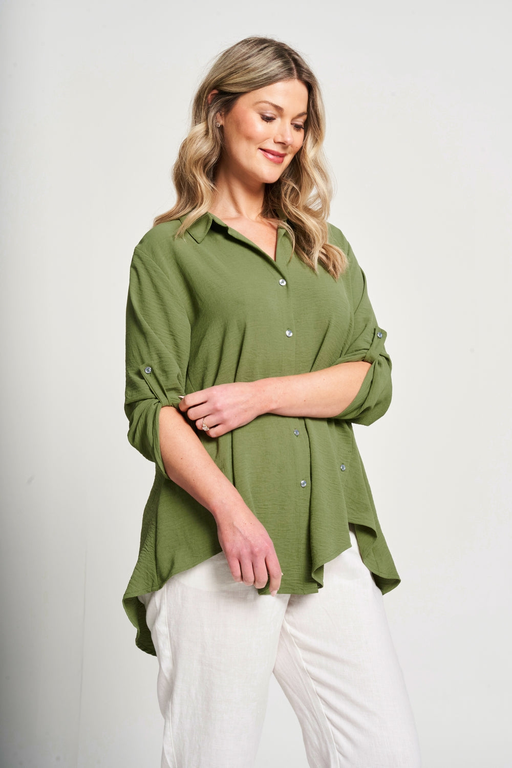 Transport yourself to a world of effortless elegance with our swing shirt. The roched sleeves add a touch of sophistication, while the front hem button detail and front button closure exude luxury. The dipped back adds a subtle yet alluring twist. Elevate your style with this exclusive piece.