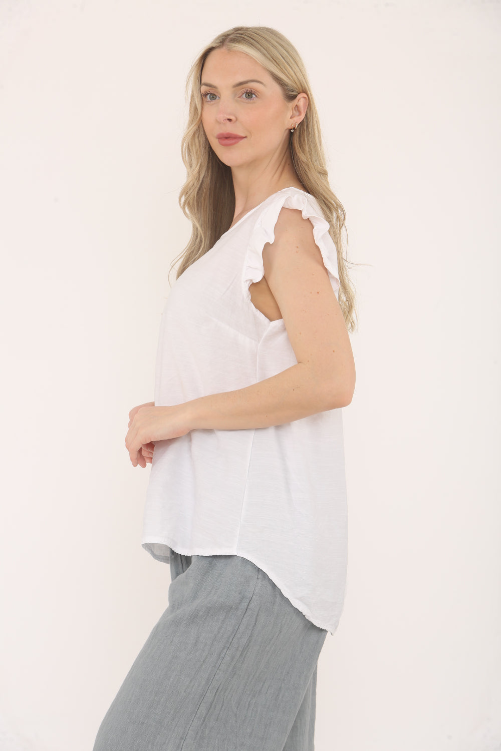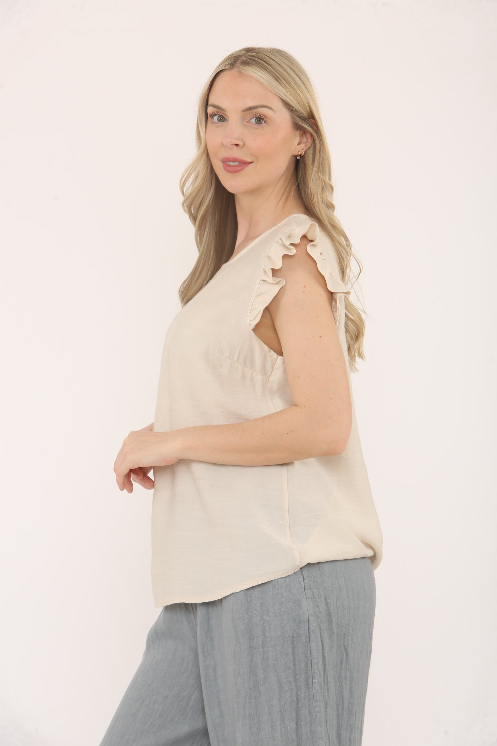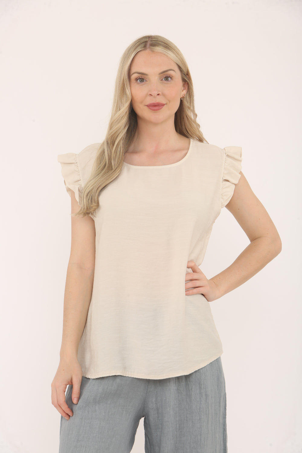 Effortlessly chic, this cap sleeve frill top is the perfect blend of simplicity and style. Designed with soft, breathable fabric, it features delicate short frilled cap sleeves for a subtle feminine touch, while the back button detail adds understated elegance. Whether styled with tailored trousers or denim, it’s a versatile piece made for both casual and polished looks.