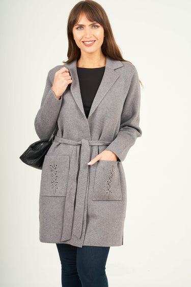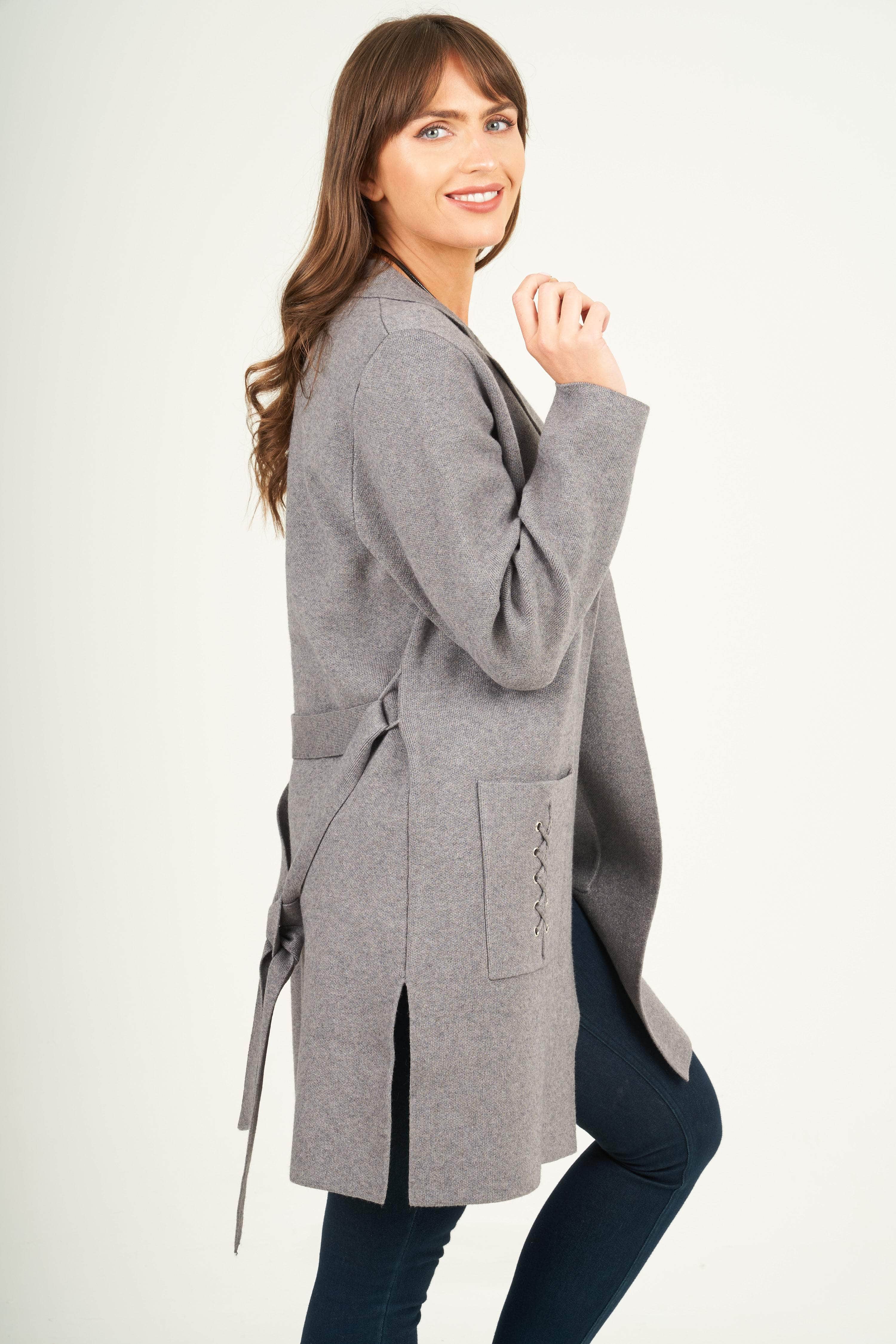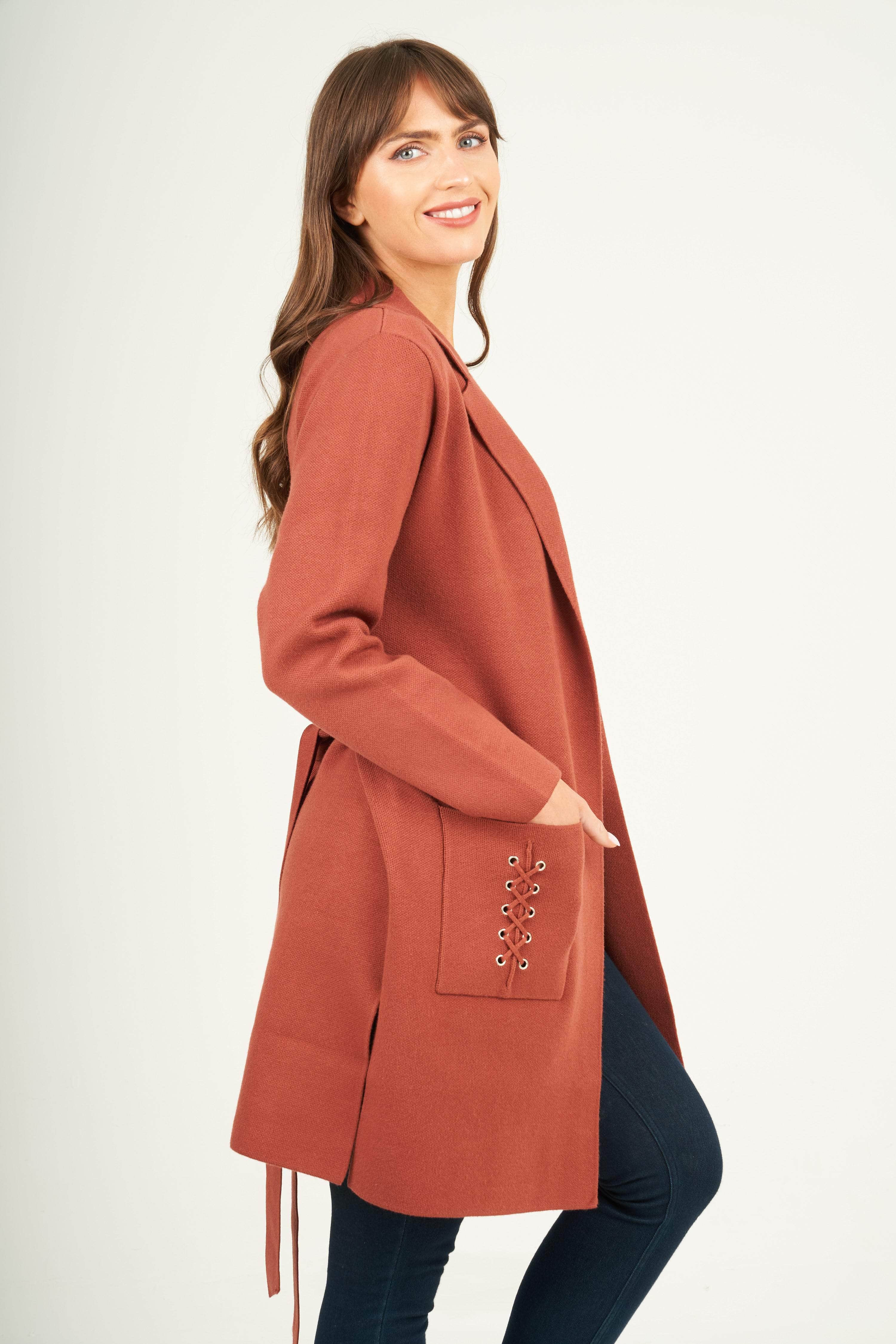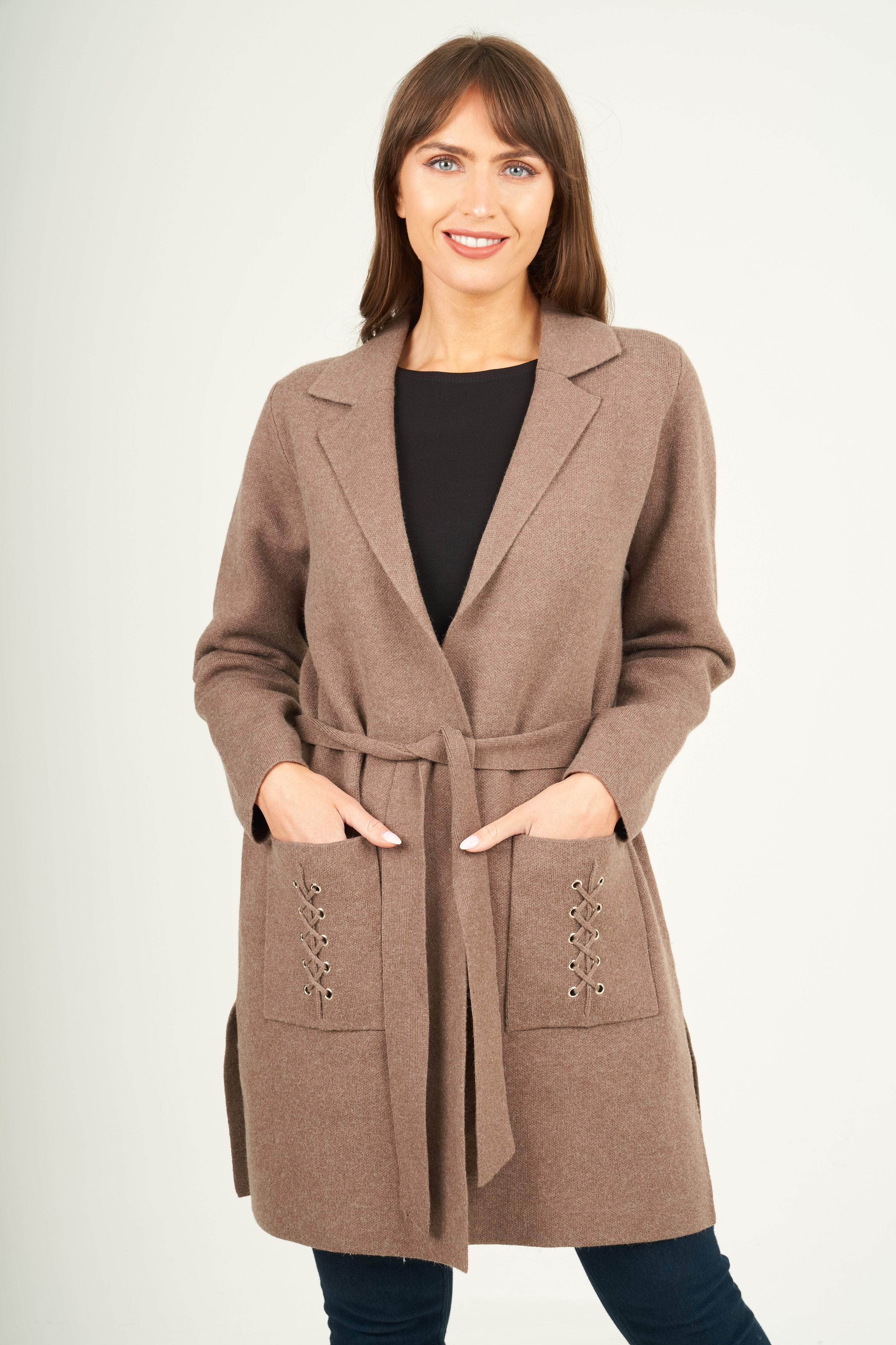 A timeless silhouette that's effortlessly smart, this wrap knitted jacket falls to a knee length. Framed with a lapel collar neckline and self-tie waist, it provides you with a functional yet stylish choice that'll protect you from the elements too. It features front pockets with criss-cross details on.