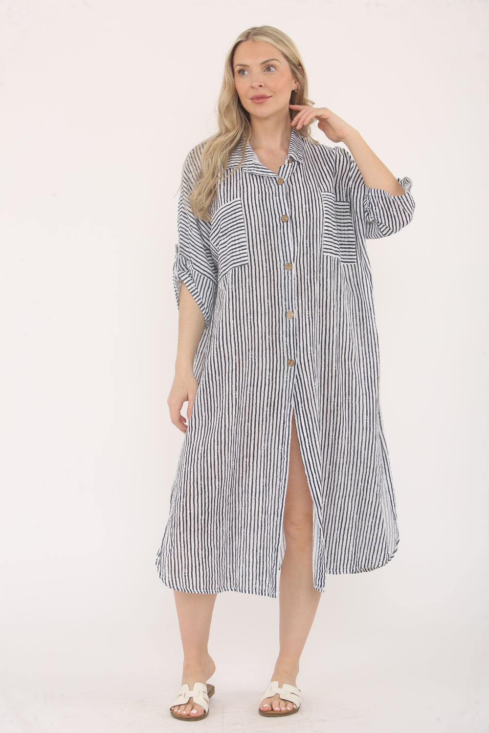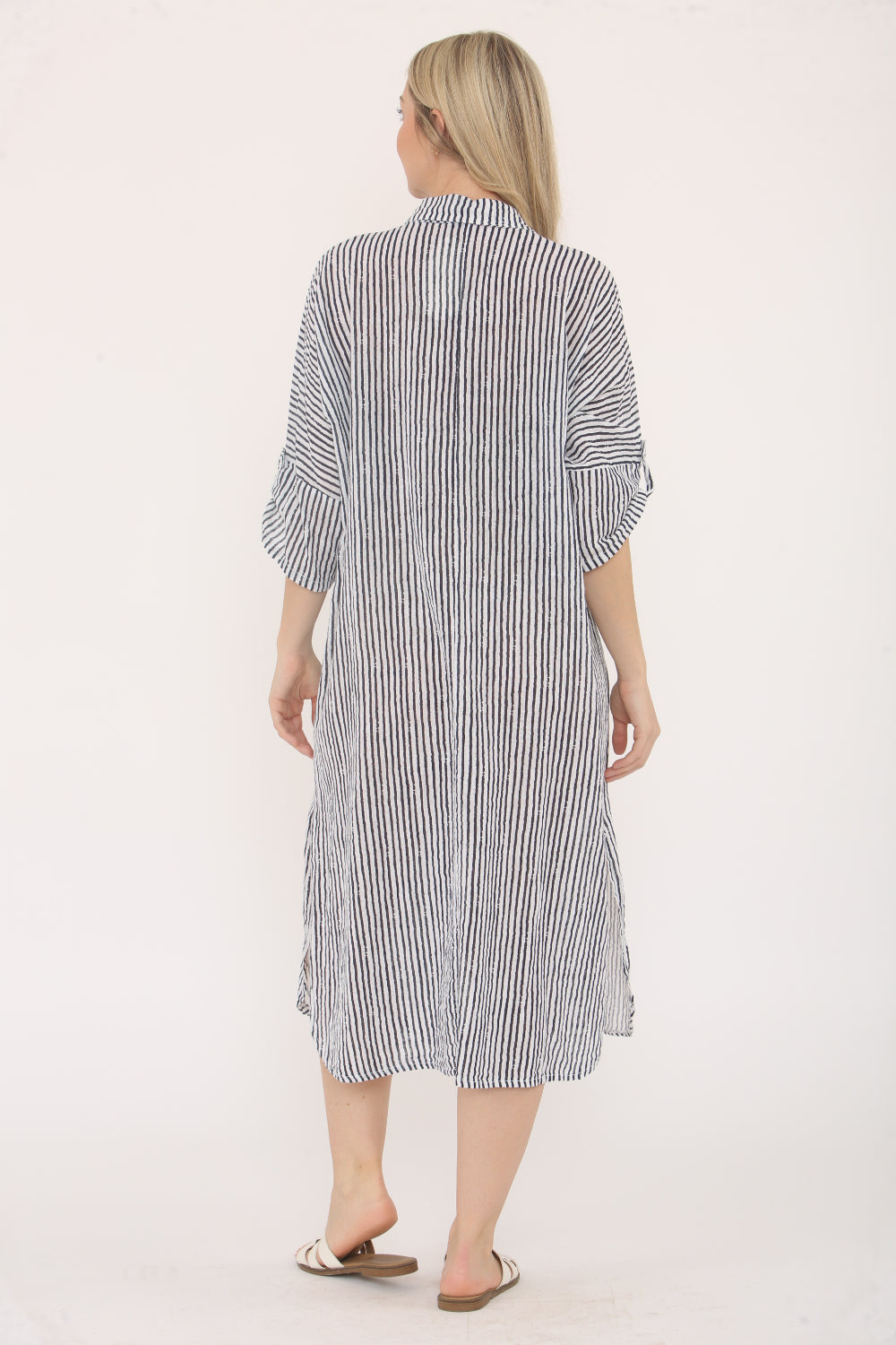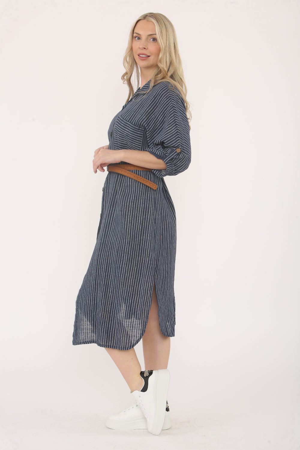 Step into effortless style with our versatile linen blend striped shirt dress. Featuring a classic collar, functional button-down front, and adjustable roll-up sleeves for a chic, relaxed fit. This midi length dress is perfect for a smart-casual look. Cinch with a belt for added waist definition or wear loose.