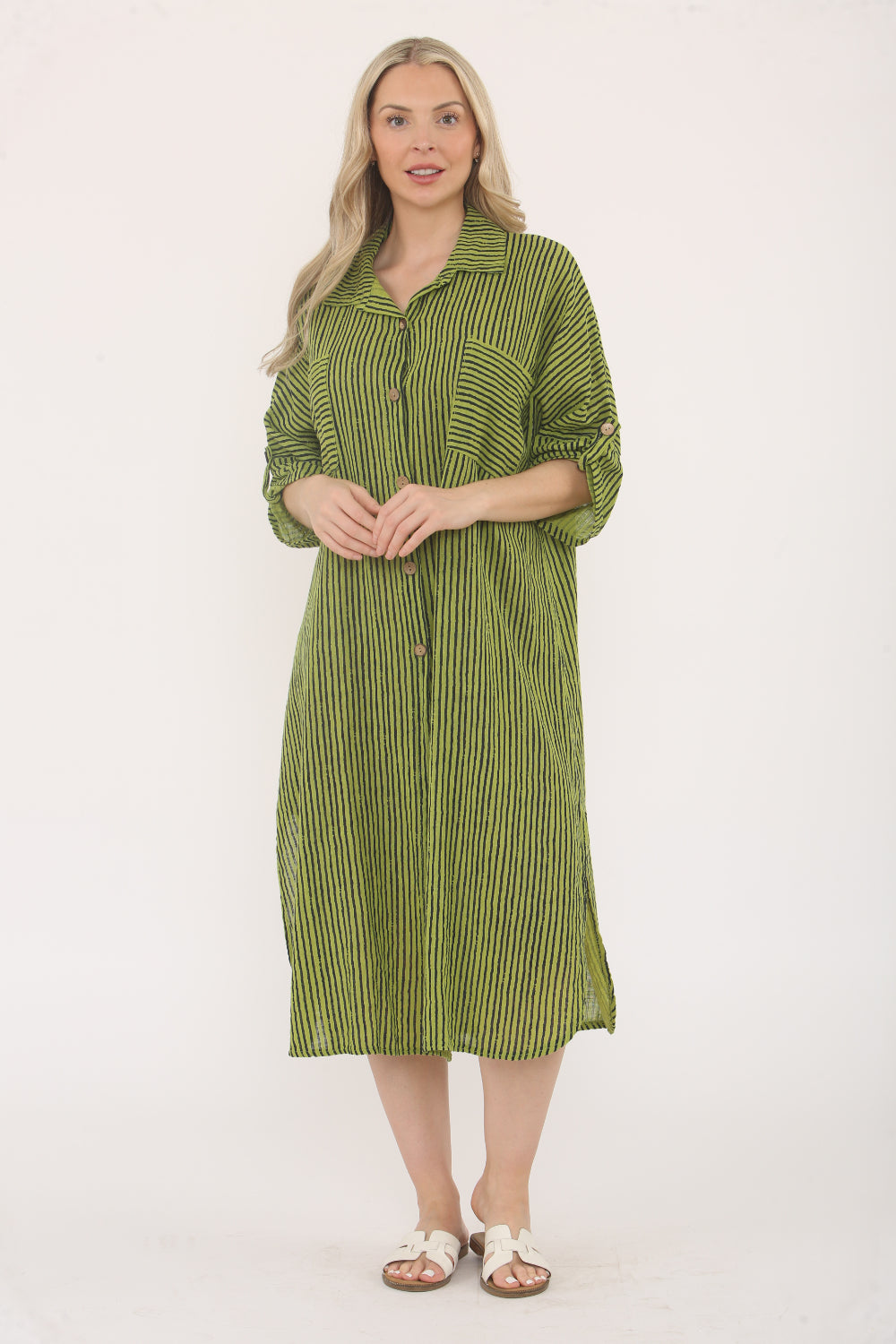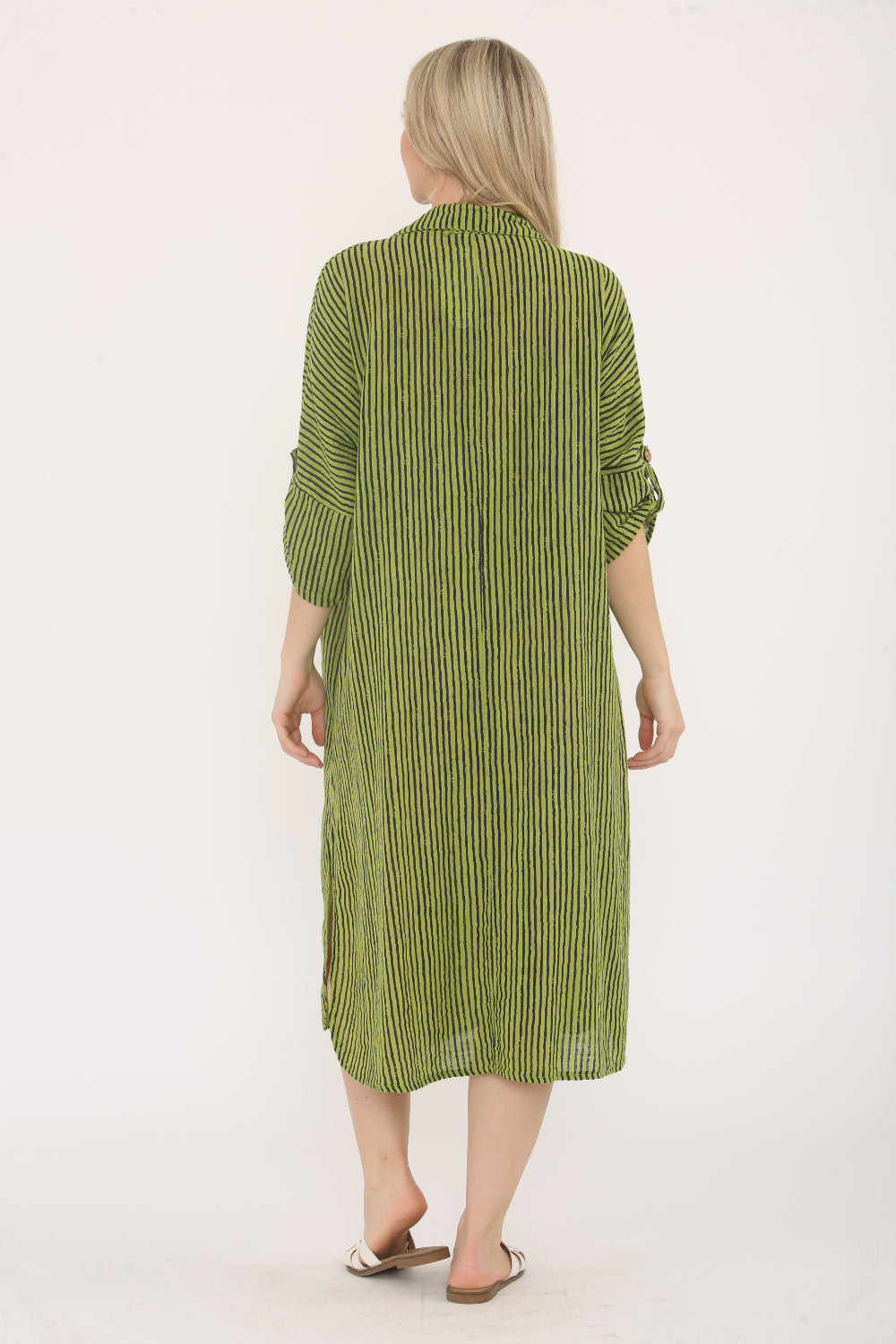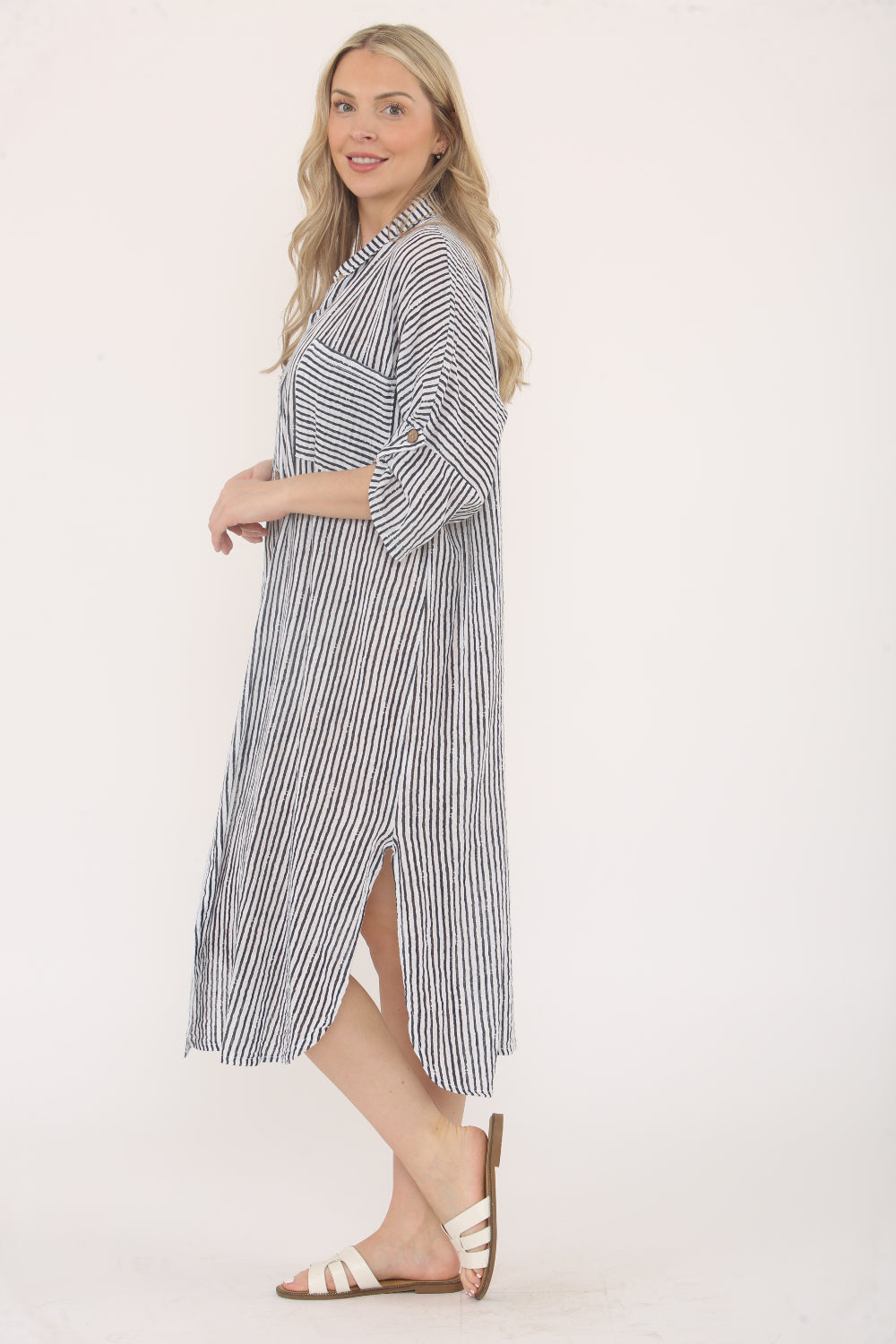 Step into effortless style with our versatile linen blend striped shirt dress. Featuring a classic collar, functional button-down front, and adjustable roll-up sleeves for a chic, relaxed fit. This midi length dress is perfect for a smart-casual look. Cinch with a belt for added waist definition or wear loose.