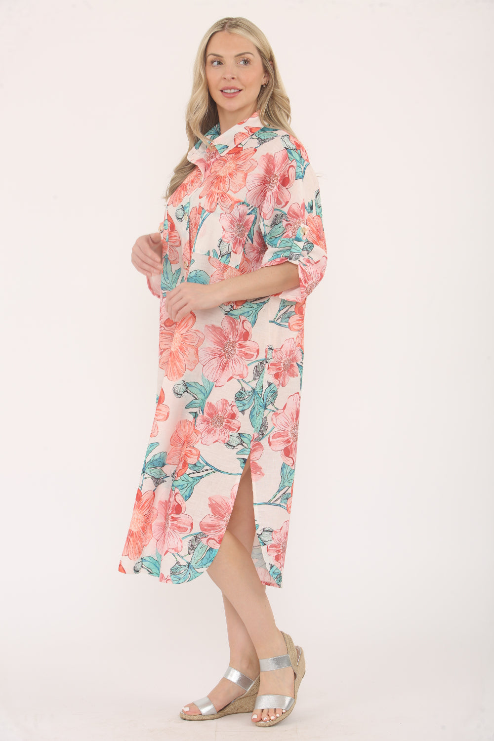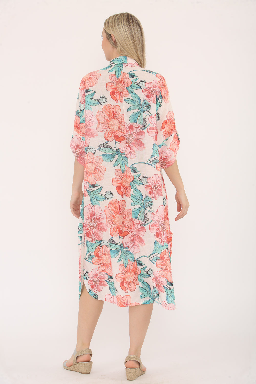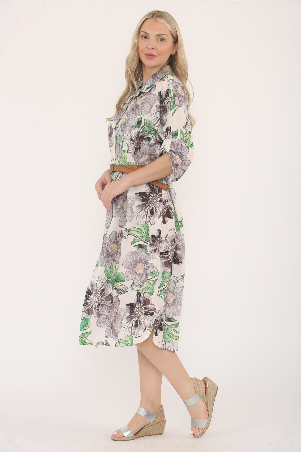 Linen Summer Floral Print Button-Down Midi Shirt Dress