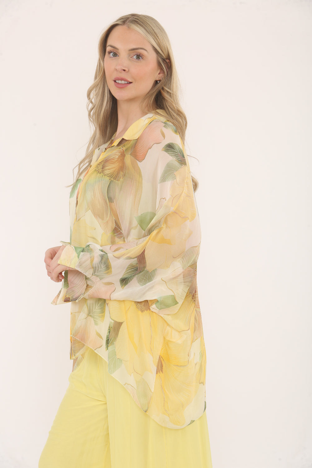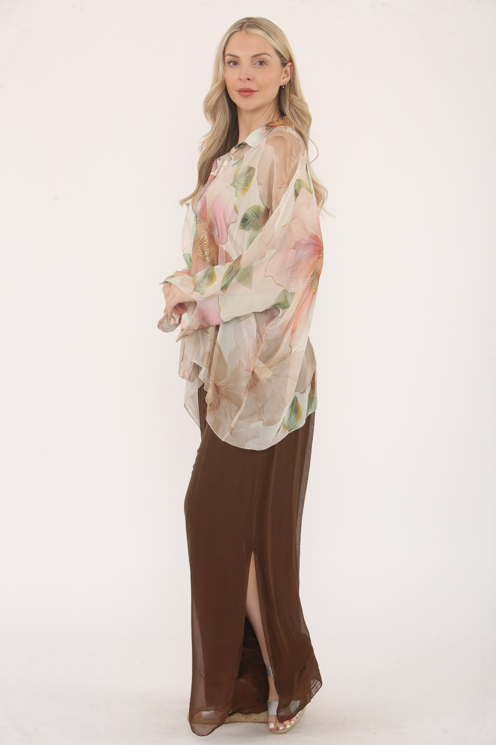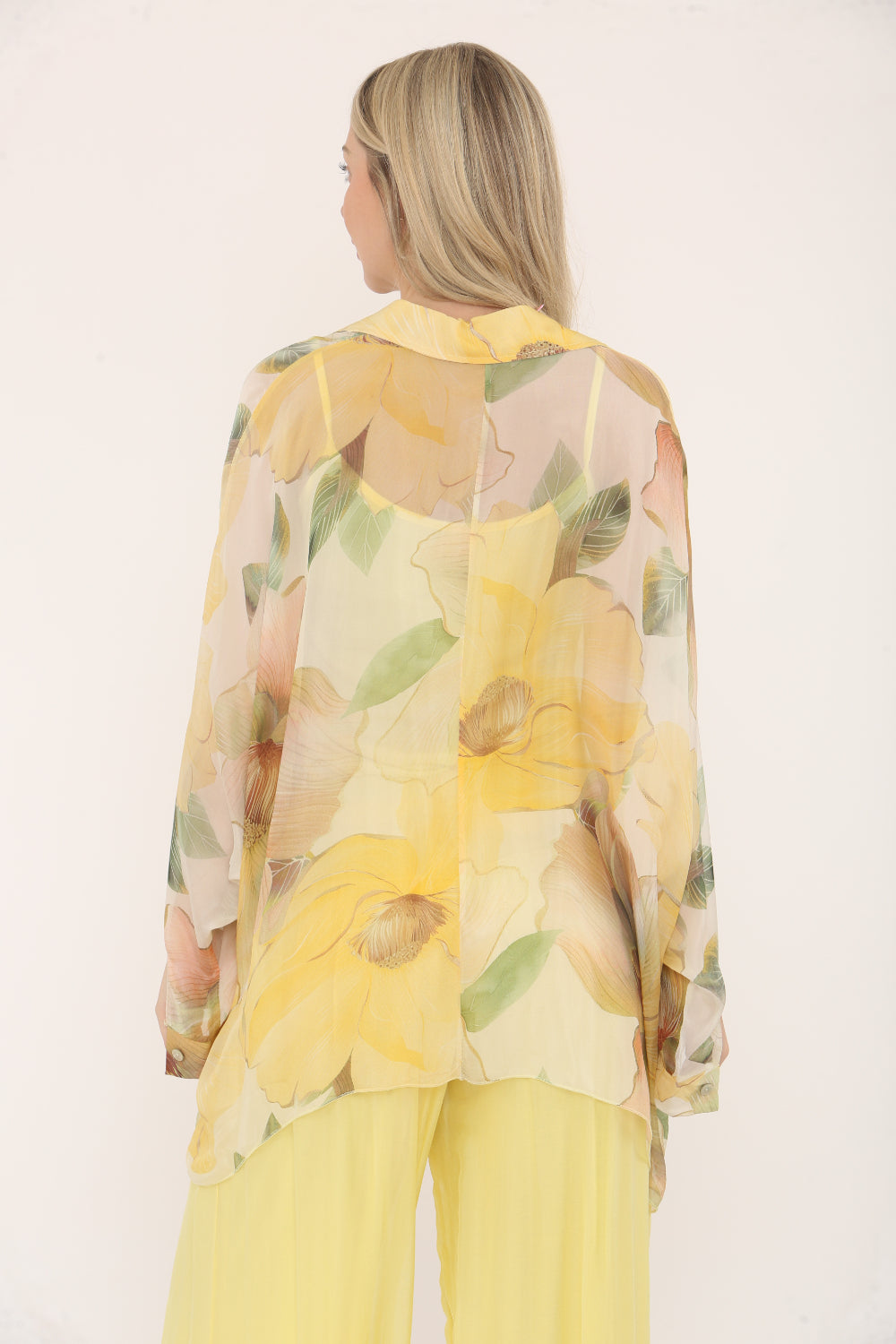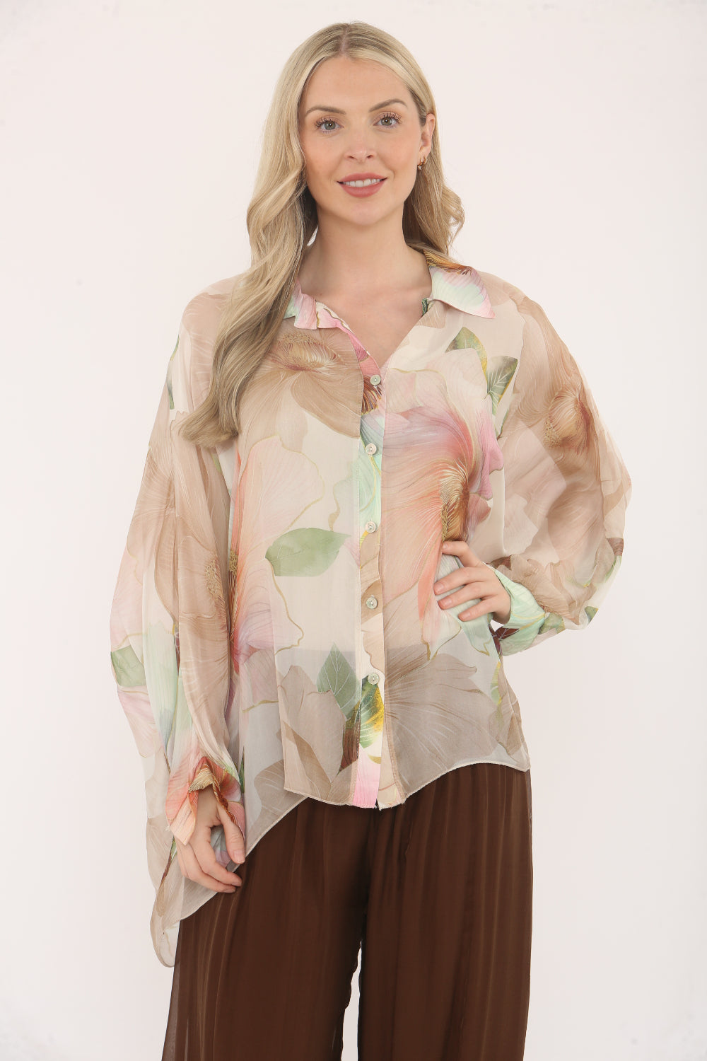 Flowy and elegant, this sheer button-up blouse features a soft floral print in pastel tones and a plain underlayer spaghetti straps vest. With a relaxed fit, batwing sleeves, and a lightweight fabric, it's perfect for adding a touch of femininity and grace to your outfit.