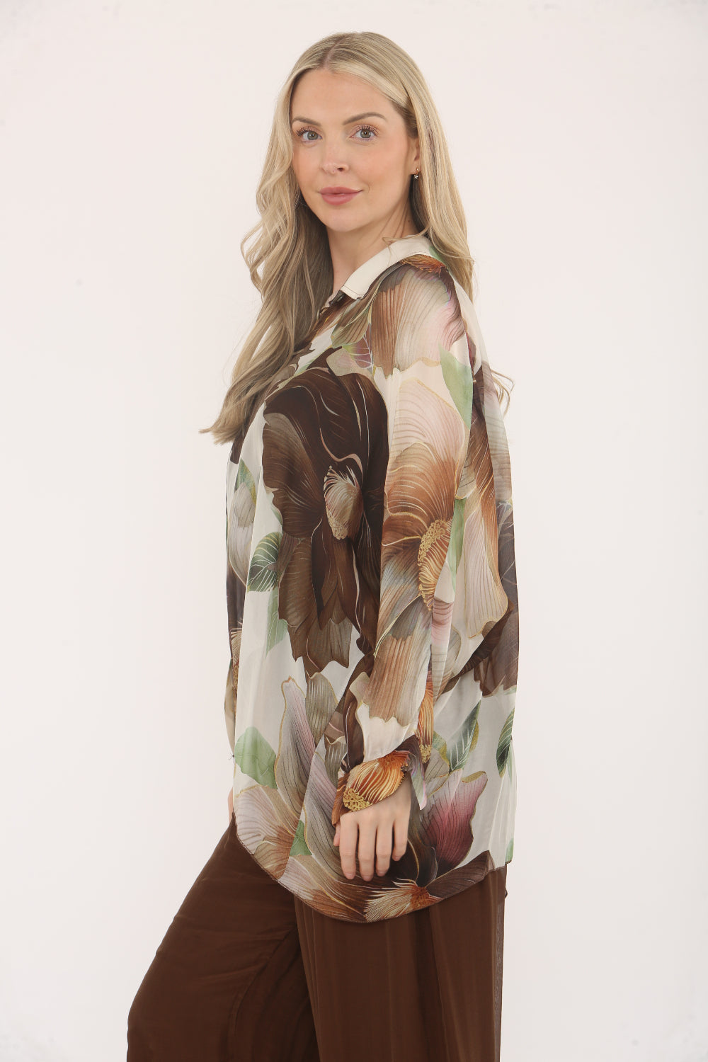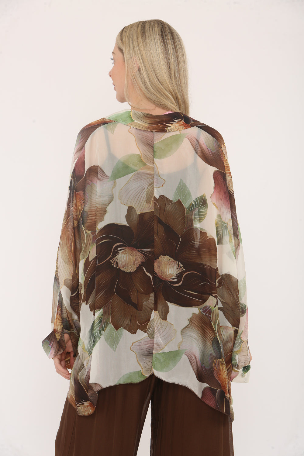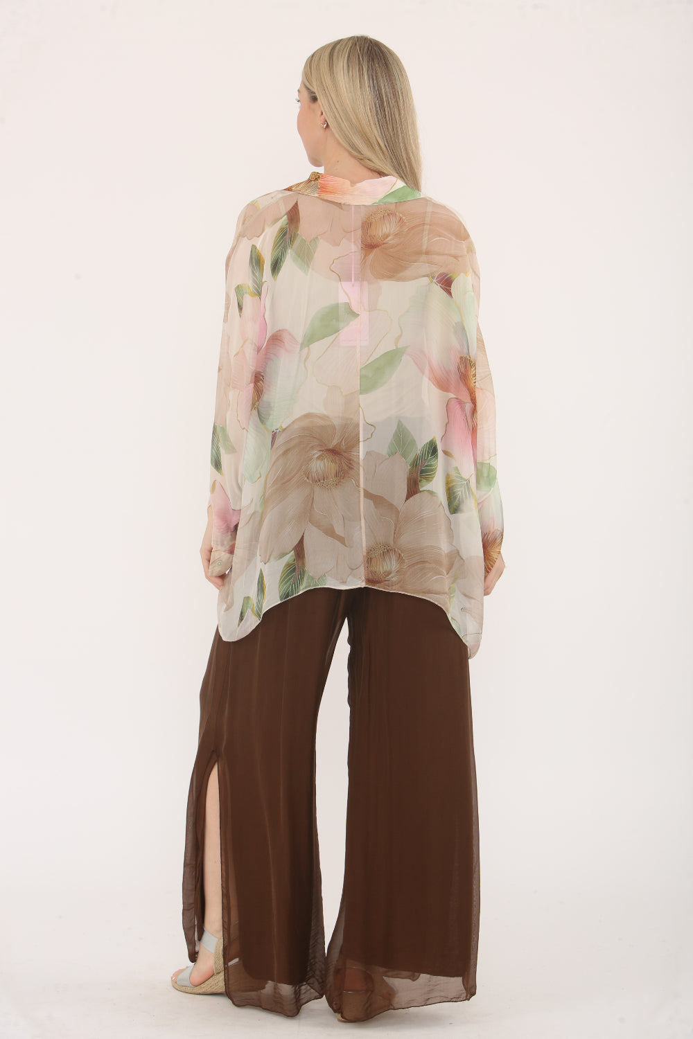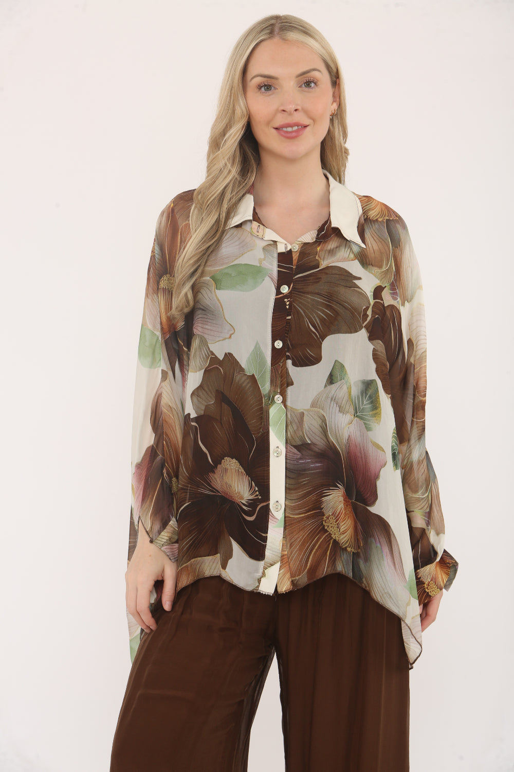 Flowy and elegant, this sheer button-up blouse features a soft floral print in pastel tones and a plain underlayer spaghetti straps vest. With a relaxed fit, batwing sleeves, and a lightweight fabric, it's perfect for adding a touch of femininity and grace to your outfit.