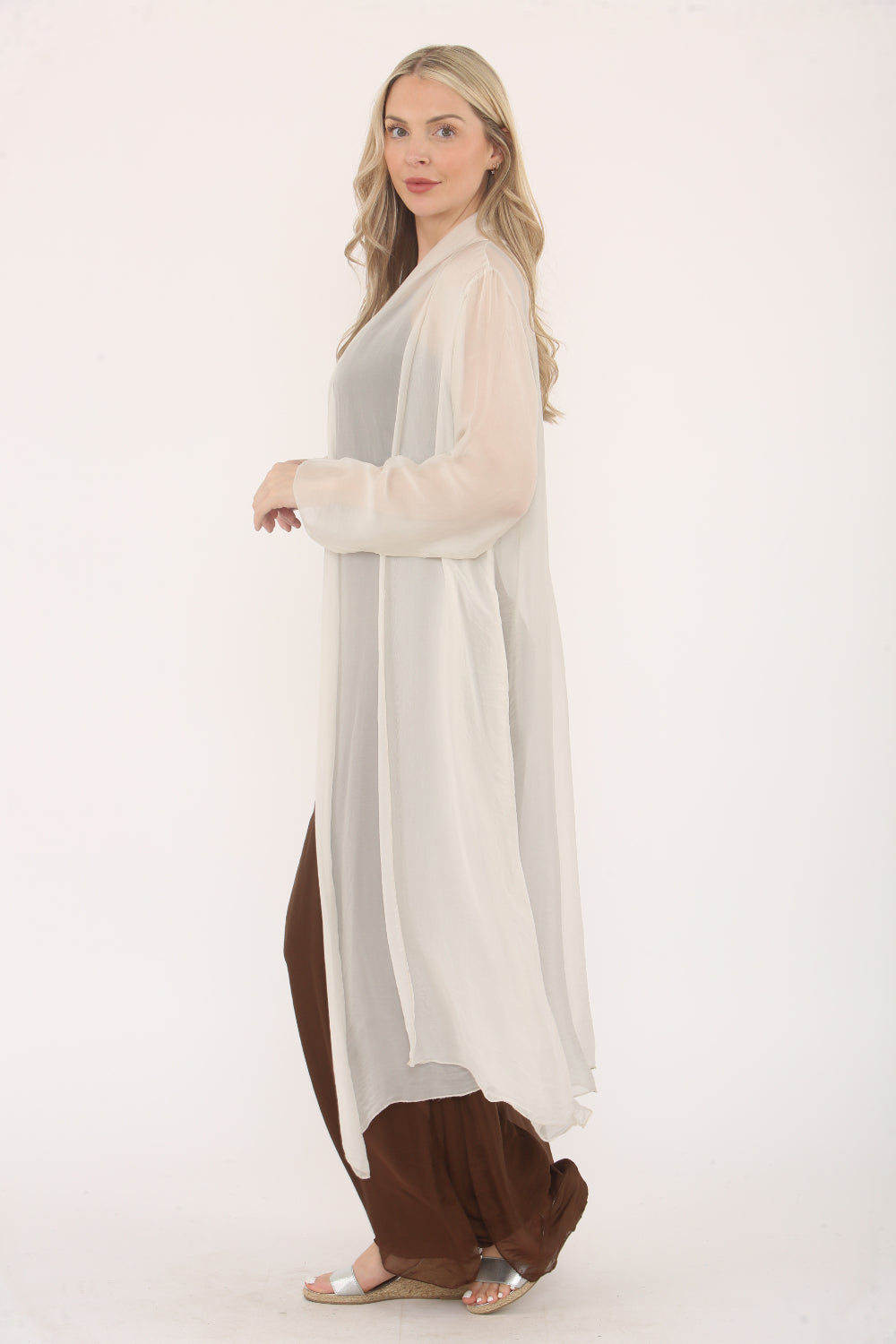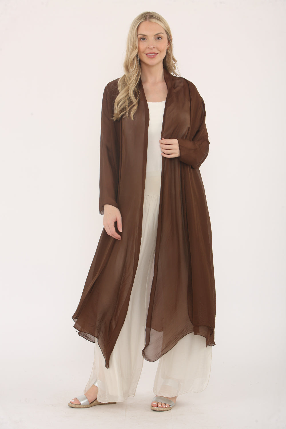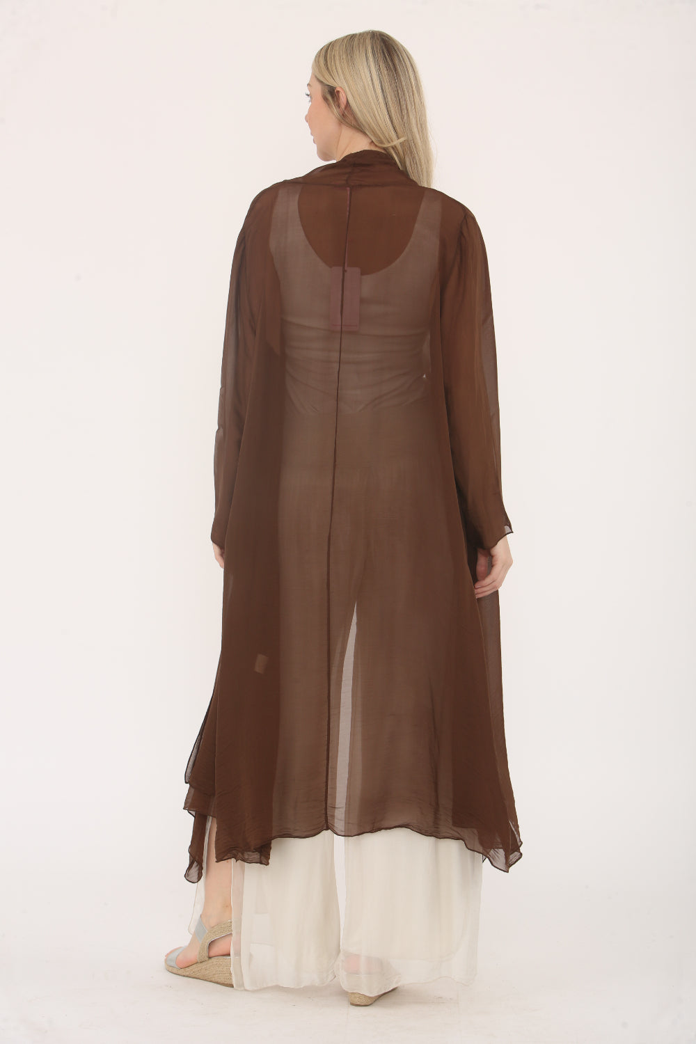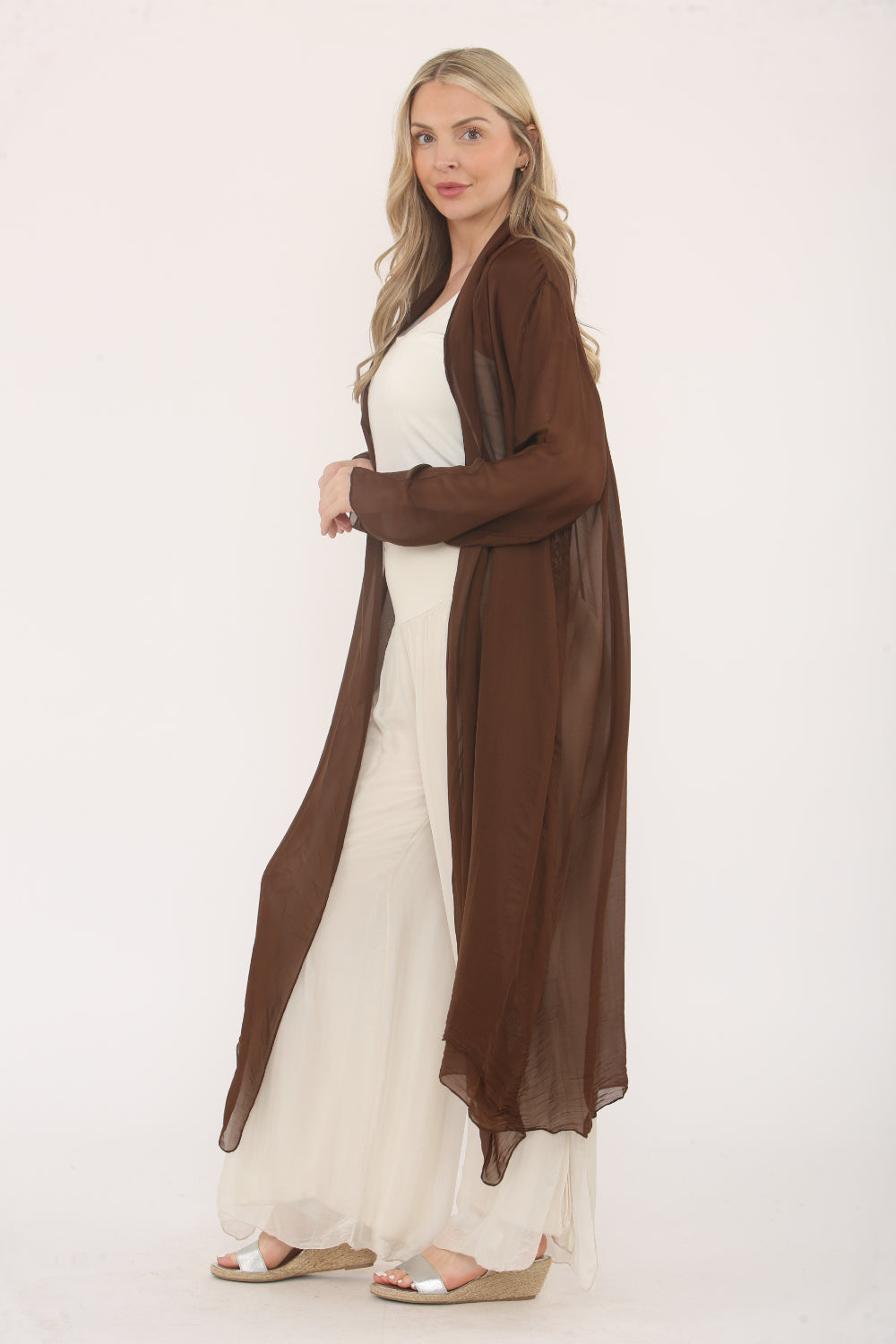 Elevate your layering game with this elegant sheer longline jacket. Featuring a flowing open-front design, long sleeves, and a lightweight, silky fabric, it's perfect for adding sophistication to both casual and formal outfits. A versatile wardrobe essential for effortless chic.