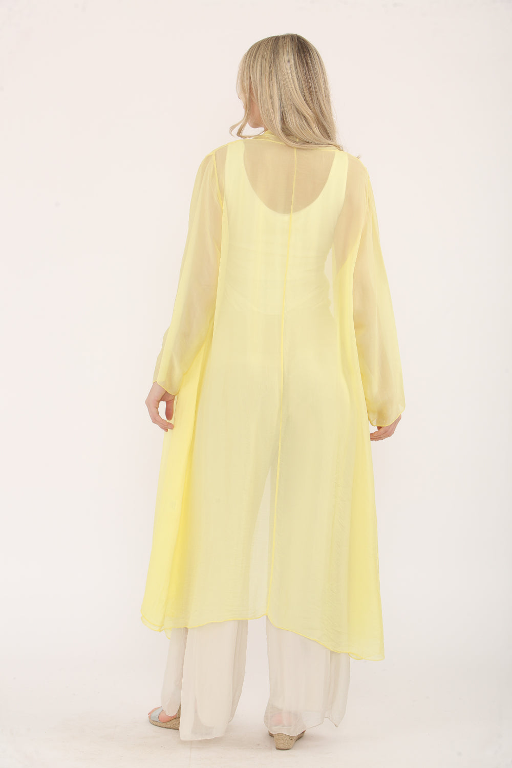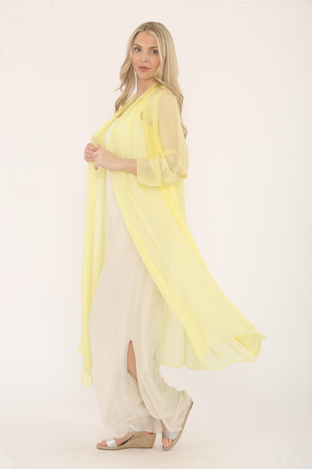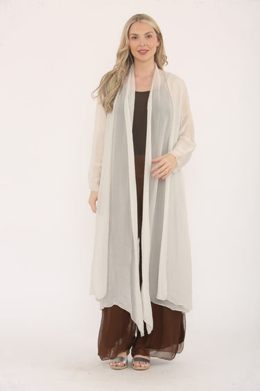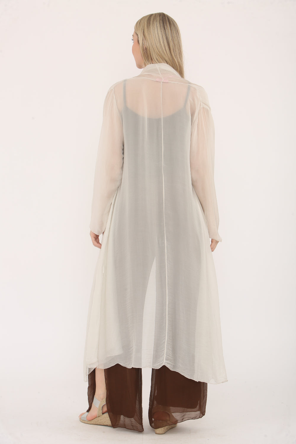 Elevate your layering game with this elegant sheer longline jacket. Featuring a flowing open-front design, long sleeves, and a lightweight, silky fabric, it's perfect for adding sophistication to both casual and formal outfits. A versatile wardrobe essential for effortless chic.