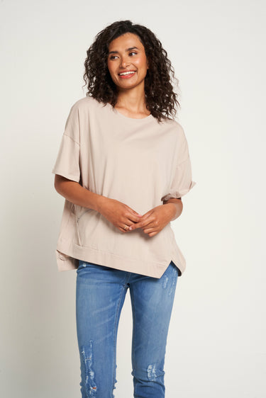 This oversized short sleeved top is expertly designed with front zip pockets, an asymmetrical hemline, and a round neck for a unique and stylish look. Made from a comfortable cotton mix fabric, this top offers both functionality and fashion. Perfect for any occasion.