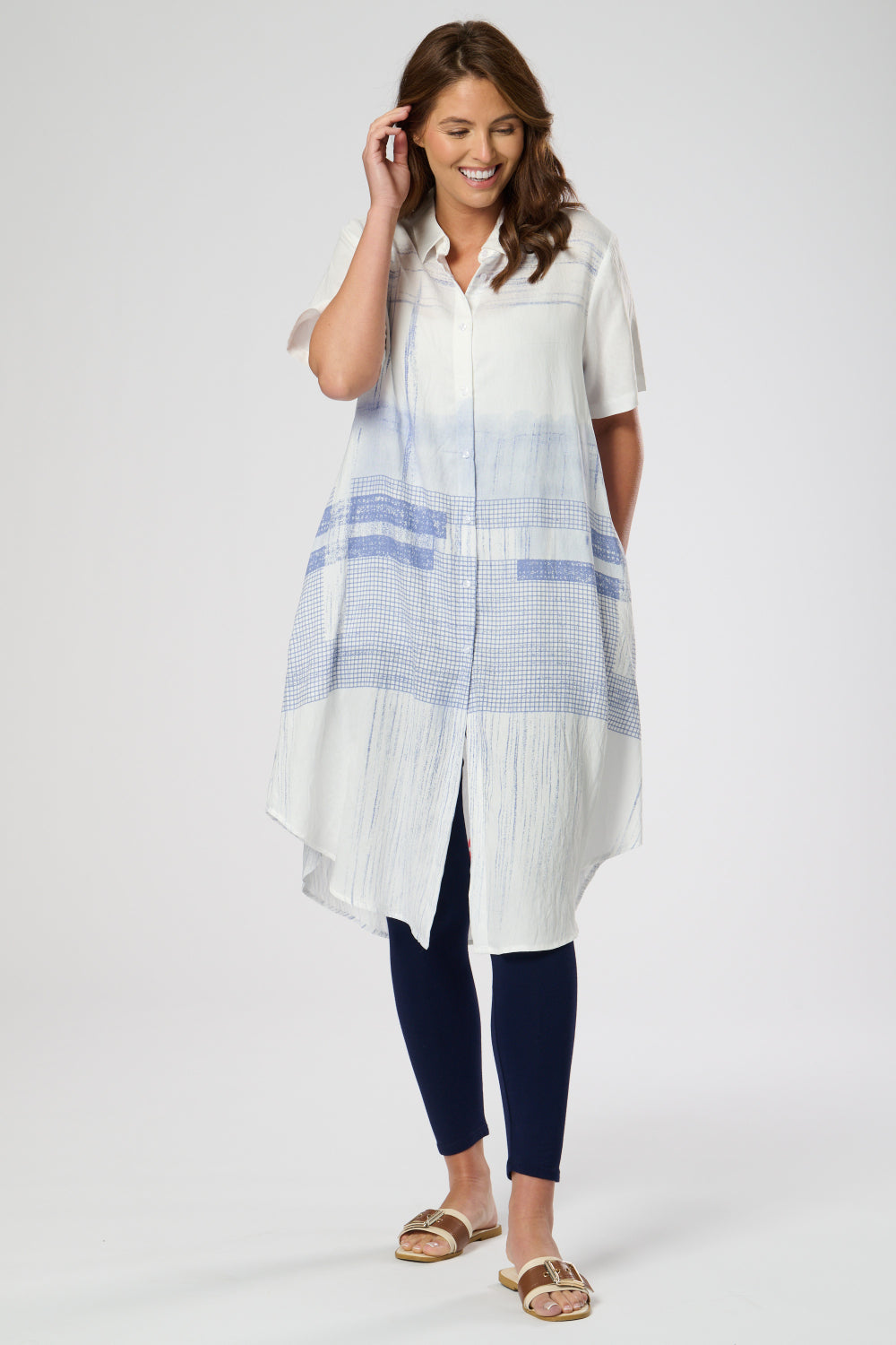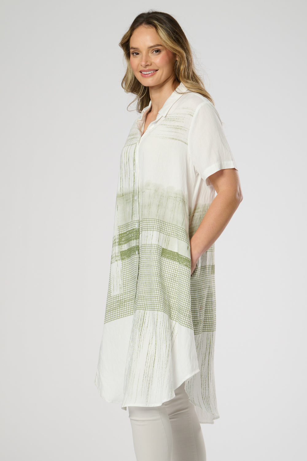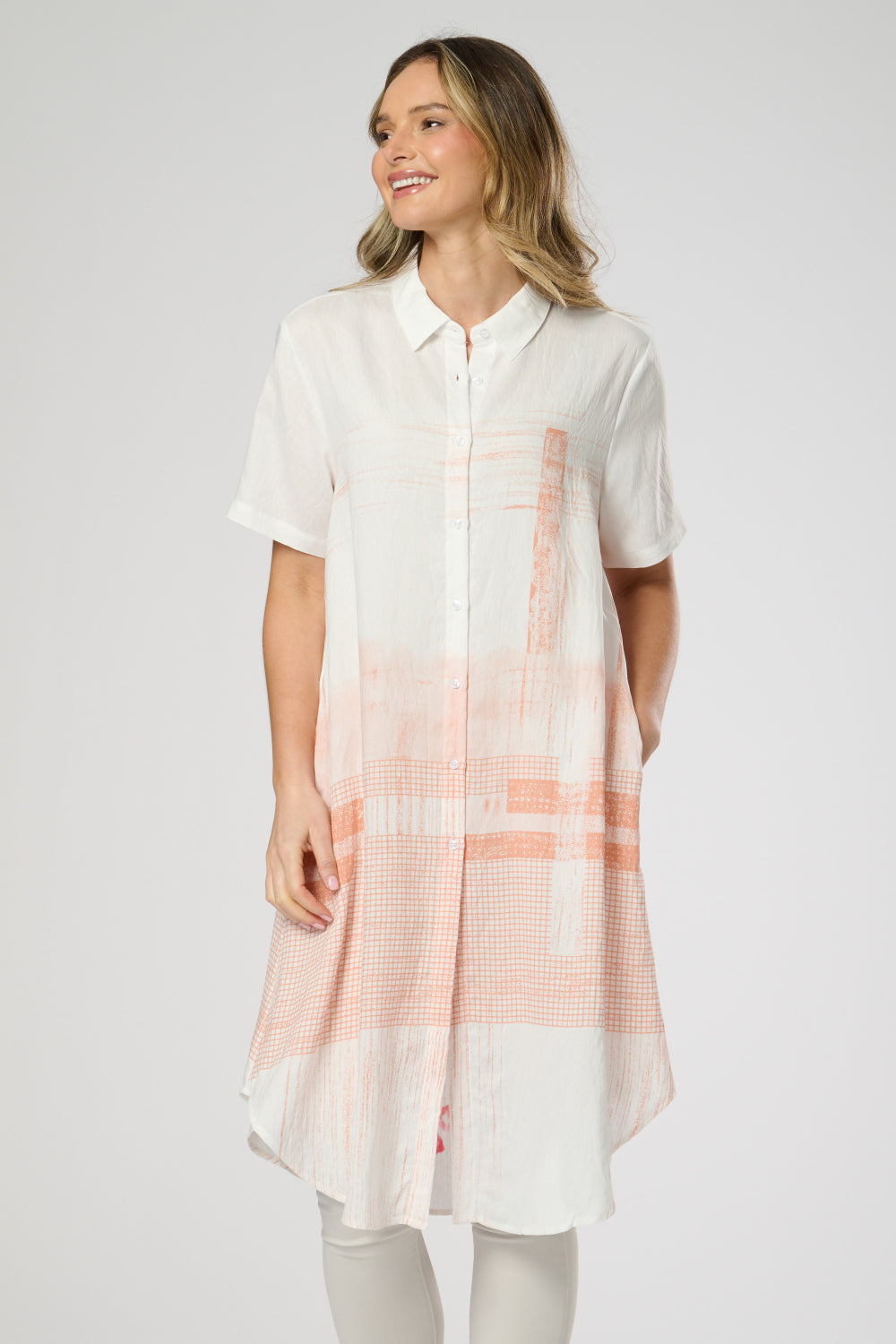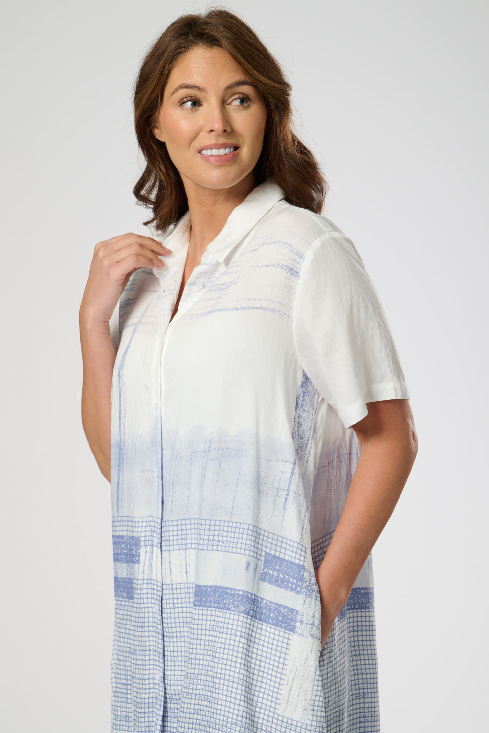 This dress boasts a sophisticated border print design and a comfortable shirt-style fit. The short sleeves and button front fastening provide a polished look, while the side pockets add convenience. The round hemline and knee length make it a versatile piece for any occasion.