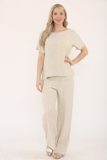 Elevate your casual wardrobe with this short-sleeve top featuring subtle pinstripes and a relaxed, boxy fit. Designed with a linen mixture fabric and a modern asymmetric stripe pattern, it’s perfect for effortless everyday style.